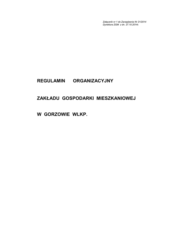 Załącznik nr 1 do Zarządzenia Nr 21/2014 Dyrektora ZGM z dn. 27.10.2014r. REGULAMIN ORGANIZACYJNY ZAKŁADU GOSPODARKI MIESZKANIOWEJ W GORZOWIE WLKP. I. POSTANOWIENIA OGÓLNE §1 1. Zakład Gospodarki Mieszkaniowej został utworzony na podstawie uchwały nr XI/58/90 Rady Miejskiej w Gorzowie Wlkp. z dnia 19 grudnia 1990r. w sprawie utworzenia zakładu budżetowego pod nazwą „Zakład Gospodarki Mieszkaniowej” w Gorzowie Wlkp.. 2. Zakład Gospodarki Mieszkaniowej powołany został do administrowania i eksploatacji budynków komunalnych, zarządzania zasobami lokalowymi i innymi nieruchomościami będącymi w dyspozycji gminy. . 3. Działalność Zakładu finansowana jest z przychodów własnych oraz dotacji budżetowej, której wysokość ustalana jest w rocznym budżecie Miasta Gorzowa Wlkp.. Plan finansowy Zakładu zatwierdza Dyrektor ZGM. 4. Dyrektora zatrudnia i zwalnia Prezydent Miasta Gorzowa Wlkp.. 5.Zakładem Gospodarki Mieszkaniowej kieruje dyrektor na zasadzie jednoosobowego kierownictwa, reprezentując go na zewnątrz i ponosząc odpowiedzialność za jego prawidłowe funkcjonowanie. 6. Dyrektor kieruje zakładem przy udziale bezpośrednio podległych mu stanowisk: - zastępcy dyrektora ds techniczno-eksploatacyjnych, - głównego księgowego. 7. Hierarchia stanowisk decyduje o pełnieniu zastępstw w czasie nieobecności dyrektora. W przypadkach skrajnych dyrektor może wyznaczyć inne osoby pełniące funkcje kierownicze w zakładzie do pełnienia zastępstw. 8. Regulamin Organizacyjny określa organizację i zasady funkcjonowania Zakładu Gospodarki Mieszkaniowej a w szczególności: - strukturę organizacyjną Zakładu łącznie z nazwą komórek organizacyjnych, (załącznik nr 1 i 2). - zakres zadań poszczególnych komórek organizacyjnych, - wzajemne powiązania funkcjonalne oddziałów i komórek zakładu. - wykaz adresowy siedzib ZGM (załącznik nr 3). 9. Strukturę organizacyjną ZGM tworzą następujące komórki organizacyjne: 1) Administracja Domów Mieszkalnych nr 1 Oddział 2) Administracja Domów Mieszkalnych nr 2 Oddział 3) Administracja Domów Mieszkalnych nr 3 Oddział 4) Administracja Domów Mieszkalnych nr 4 Oddział 5) Administracja Domów Mieszkalnych nr 5 Oddział 6) Biuro Obsługi Prawnej (NRP) 7) Biuro Zamiany Mieszkań (NZM) 8) Dział Spraw Pracowniczych (NSP) 9) Dział Administracyjno-Gospodarczy (NAG) 10)Sekcja Informatyki (NIT) 11) Samodzielne stanowisko BHP i p.poż. (NBH) 12)Samodzielne stanowisko obrony cywilnej (N0C) 13)Dział Techniczno-Eksploatacyjny (TTE) 14)Sekcja Zamówień Publicznych (TZP) (ADM nr 1) (ADM nr 2) (ADM nr 3) (ADM nr 4) (ADM nr 5) 1 15)Samodzielne stanowisko Specjalista –koordynator programu „KAWKA” (TPK) 16)Dział Finansowo-Księgowy (GFK) II. ZAKRES DZIAŁANIA KIEROWNICTWA ZAKŁADU § 2 DYREKTOR 1. Dyrektor jest przełożonym wszystkich pracowników i sprawuje kierownictwo oraz nadzór nad prawidłowym funkcjonowaniem wszystkich komórek organizacyjnych, zgodnie z przepisami prawa i interesem ogólnospołecznym. 2. Do zakresu działania Dyrektora należy: 1) nadawanie ogólnych kierunków organizacyjnych i działalności w ramach obowiązujących przepisów oraz zapewnienie prawidłowego funkcjonowania zakładu, 2) ustalanie wewnętrznej struktury organizacyjnej oraz wydawanie zarządzeń, regulaminów, instrukcji, itp., 3) określenie zakresu działania i kompetencji swoich zastępców, 4) określenie zakresów czynności, obowiązków, odpowiedzialności i uprawnień kierowników komórek organizacyjnych i pracowników na stanowiskach samodzielnych podległych bezpośrednio Dyrektorowi, 5) czuwanie nad prawidłowym planowaniem oraz terminowym wykonaniem sporządzonych planów z uwzględnieniem zasad oszczędnej i celowej gospodarki, przepisów prawa, 6) decydowanie w sprawach osobowych i finansowo-płacowych pracowników, 7) podejmowanie czynności przewidzianych przepisami kodeksu pracy i innymi aktami prawnymi z tego zakresu w odniesieniu do pracowników Zakładu, 8) zapewnienie odpowiedniego stanu bezpieczeństwa i higieny pracy, zabezpieczenia przeciwpożarowego, 9) nadzór nad zabezpieczeniem mienia przekazanego przez Gminę, 10) zapewnienie prawidłowej organizacji i prowadzenia inwentaryzacji składników majątkowych zgodnie z obowiązującymi przepisami prawnymi, 11) zapewnienie prawidłowego funkcjonowania kontroli wewnętrznej oraz sprawowanie osobistego nadzoru nad skutecznością tego systemu jak również prawidłowości wykorzystania sygnałów kontroli wewnętrznej, zewnętrznej oraz sądów i organów ścigania, 12) określenie polityki jakości dla funkcjonującego w Zakładzie systemu zarządzania jakością oraz okresowego przeglądu SZJ, 13) sprawowanie nadzoru nad powierzonymi sprawami obrony cywilnej, 14) organizowanie prawidłowej współpracy z organami samorządowymi, 15) reprezentowanie Zakładu Gospodarki Mieszkaniowej na zewnątrz oraz składanie w jego imieniu oświadczeń zgodnie z obowiązującymi przepisami prawa i posiadanymi pełnomocnictwami. 2 § 3 ZASTĘPCA DYREKTORA D/S TECHNICZNO-EKSPLOATACYJNYCH 1. Zastępca Dyrektora d/s techniczno-eksploatacyjnych pełni funkcję pierwszego zastępcy Dyrektora . Zastępca Dyrektora d/s techniczno-eksploatacyjnych kieruje całością spraw związanych z techniczną ochroną substancji mieszkaniowej, prowadzeniem prawidłowej i efektywnej polityki remontowej, prowadzeniem prawidłowej ewidencji i eksploatacji zasobów. 2. Do zakresu obowiązków Zastępcy Dyrektora należy: 1) ustalanie ogólnych kierunków organizacyjnych oraz działalności w ramach obowiązujących przepisów prawa w zakresie remontów, prawidłowej eksploatacji zasobów itp., 2) zapewnienie prawidłowego funkcjonowania podległych komórek organizacyjnych poprzez należyte zorganizowanie pracy, 3) określenie zakresów czynności, obowiązków, odpowiedzialności i uprawnień kierownikom komórek organizacyjnych bezpośrednio podległych, 4) czuwanie nad prawid