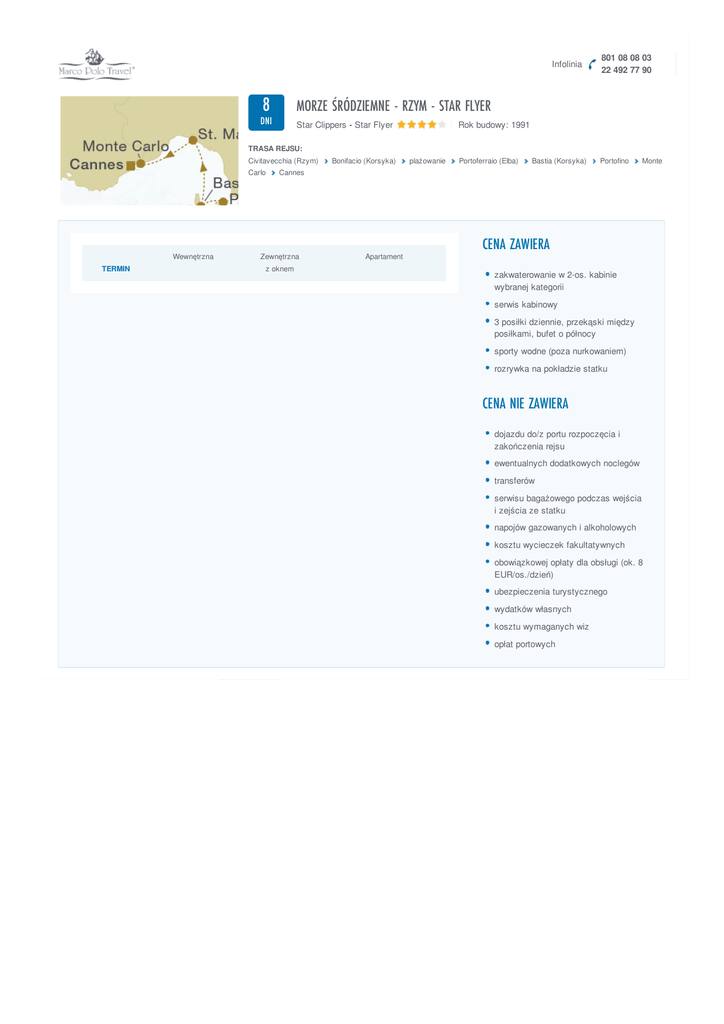 Infolinia 8 MORZE ŚRÓDZIEMNE - RZYM - STAR FLYER DNI Star Clippers - Star Flyer 801 08 08 03 22 492 77 90 | Rok budowy: 1991 TRASA REJSU: Civitavecchia (Rzym) Carlo Wewnętrzna TERMIN Bonifacio (Korsyka) plażowanie Portoferraio (Elba) Bastia (Korsyka) Portofino Monte Cannes Zewnętrzna z oknem Apartament CENA ZAWIERA zakwaterowanie w 2-os. kabinie wybranej kategorii serwis kabinowy 3 posiłki dziennie, przekąski między posiłkami, bufet o północy sporty wodne (poza nurkowaniem) rozrywka na pokładzie statku CENA NIE ZAWIERA dojazdu do/z portu rozpoczęcia i zakończenia rejsu ewentualnych dodatkowych noclegów transferów serwisu bagażowego podczas wejścia i zejścia ze statku napojów gazowanych i alkoholowych kosztu wycieczek fakultatywnych obowiązkowej opłaty dla obsługi (ok. 8 EUR/os./dzień) ubezpieczenia turystycznego wydatków własnych kosztu wymaganych wiz opłat portowych