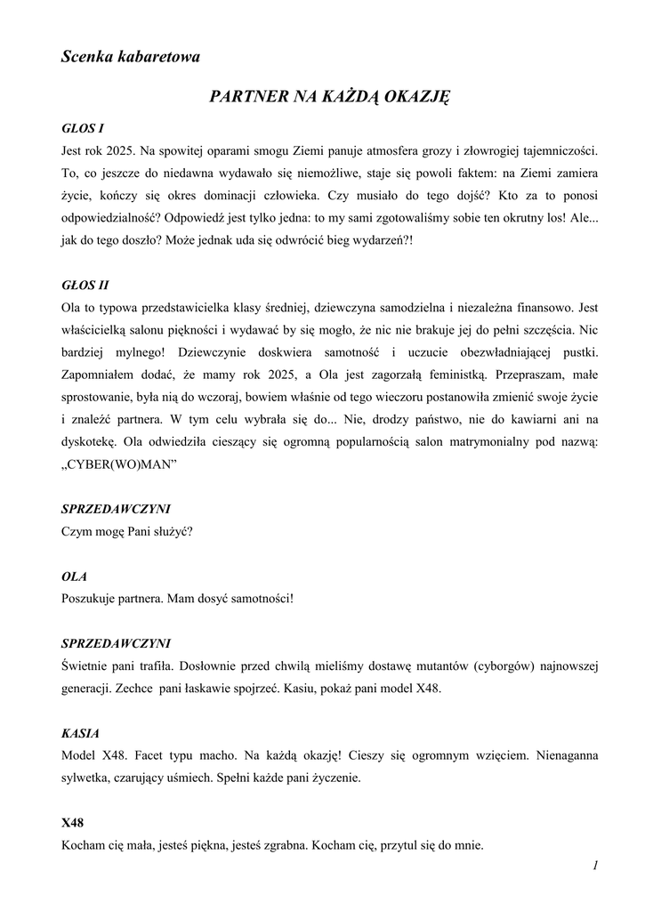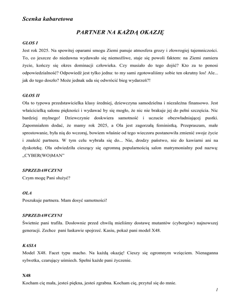 Scenka kabaretowa PARTNER NA KAŻDĄ OKAZJĘ GLOS I Jest rok 2025. Na spowitej oparami smogu Ziemi panuje atmosfera grozy i złowrogiej tajemniczości. To, co jeszcze do niedawna wydawało się niemożliwe, staje się powoli faktem: na Ziemi zamiera życie, kończy się okres dominacji człowieka. Czy musiało do tego dojść? Kto za to ponosi odpowiedzialność? Odpowiedź jest tylko jedna: to my sami zgotowaliśmy sobie ten okrutny los! Ale... jak do tego doszło? Może jednak uda się odwrócić bieg wydarzeń?! GŁOS II Ola to typowa przedstawicielka klasy średniej, dziewczyna samodzielna i niezależna finansowo. Jest właścicielką salonu piękności i wydawać by się mogło, że nic nie brakuje jej do pełni szczęścia. Nic bardziej mylnego! Dziewczynie doskwiera samotność i uczucie obezwładniającej pustki. Zapomniałem dodać, że mamy rok 2025, a Ola jest zagorzałą feministką. Przepraszam, małe sprostowanie, była nią do wczoraj, bowiem właśnie od tego wieczoru postanowiła zmienić swoje życie i znaleźć partnera. W tym celu wybrała się do... Nie, drodzy państwo, nie do kawiarni ani na dyskotekę. Ola odwiedziła cieszący się ogromną popularnością salon matrymonialny pod nazwą: „CYBER(WO)MAN” SPRZEDAWCZYNI Czym mogę Pani służyć? OLA Poszukuje partnera. Mam dosyć samotności! SPRZEDAWCZYNI Świetnie pani trafiła. Dosłownie przed chwilą mieliśmy dostawę mutantów (cyborgów) najnowszej generacji. Zechce pani łaskawie spojrzeć. Kasiu, pokaż pani model X48. KASIA Model X48. Facet typu macho. Na każdą okazję! Cieszy się ogromnym wzięciem. Nienaganna sylwetka, czarujący uśmiech. Spełni każde pani życzenie. X48 Kocham cię mała, jesteś piękna, jesteś zgrabna. Kocham cię, przytul się do mnie. 1 OLA Wazeliniarz! SPRZEDAWCZYNI W takim razie może model XPTurbo? Ostatni krzyk mody. Specjalna oferta dla masochistów. Łączy w sobie tradycję i nowoczesność. XPTurbo Daj mi jeść, kobieto, jestem głodny! Nic nie robi cały dzień, tylko się obija. Rusz się wreszcie! Podaj gazetę! Gdzie pilot? Szybciej! Jestem głoooooody... (mówi ciszej) SPRZEDWCZYNI Czyż nie jest wspaniały?! OLA No, nie wiem. Muszę się zastanowić. Wrócę za chwilę. GŁOS I W tym czasie Wojtek, sąsiad Oli, także zapragnął zerwać z samotnością. (Wojtek wchodzi do sklepu) SPRZEDAWCZYNI W czym mogę pomóc? WOJTEK Poszukuję dziewczyny. Najlepiej, żeby była ładna, zgrabna, zaradna, sympatyczna, tolerancyjna i... SPRZEDAWCZYNI STOP! Mam coś dla pana z dokładną charakterystyką i instrukcją obsługi. Model K10 będzie idealną żoną. Wojtek czyta instrukcję obsługi. Do sklepu wchodzi Ola. 2 WOJTEK Informacje ogólne Żona – osoba płci żeńskiej, mieszkająca razem z mężem i według pewnych źródeł notorycznie utrudniająca mu życie. Cechy charakterystyczne: - częste działanie chaotyczno-histeryczne, - łzawe reakcje mające charakter obronny bądź napastliwy, Część sterująca: - zmysł odnajdywania pieniędzy, - centrum kontroli przebiegu akcji w serialach brazylijskich, - ośrodek sterowania mężem, - inicjator dokonywania impulsywnych zakupów, - centrum plotek, - generator bólu głowy (reklama) SPRZEDAWCZYNI I co? Podoba się panu? WOJTEK Nie, nie jestem zainteresowany. A tamten model? (Wskazuje na Olę) SPRZEDAWCZYNI To nie cyborg, to nasza klientka! Wojtek podchodzi do Oli i patrzy jej głęboko w oczy. Następnie biorą się za ręce i odchodzą. GŁOS I Tak, czasami wystarczy jedno spojrzenie, aby nasze życie uległo zmianie. Wystarczy jeden gest, aby odmienić losy ludzkości! Nasz los w naszych rękach! Scenariusz: Zbigniew Cedrowski Gimnazjum im. Adama Mickiewicza w Stawiskach 3