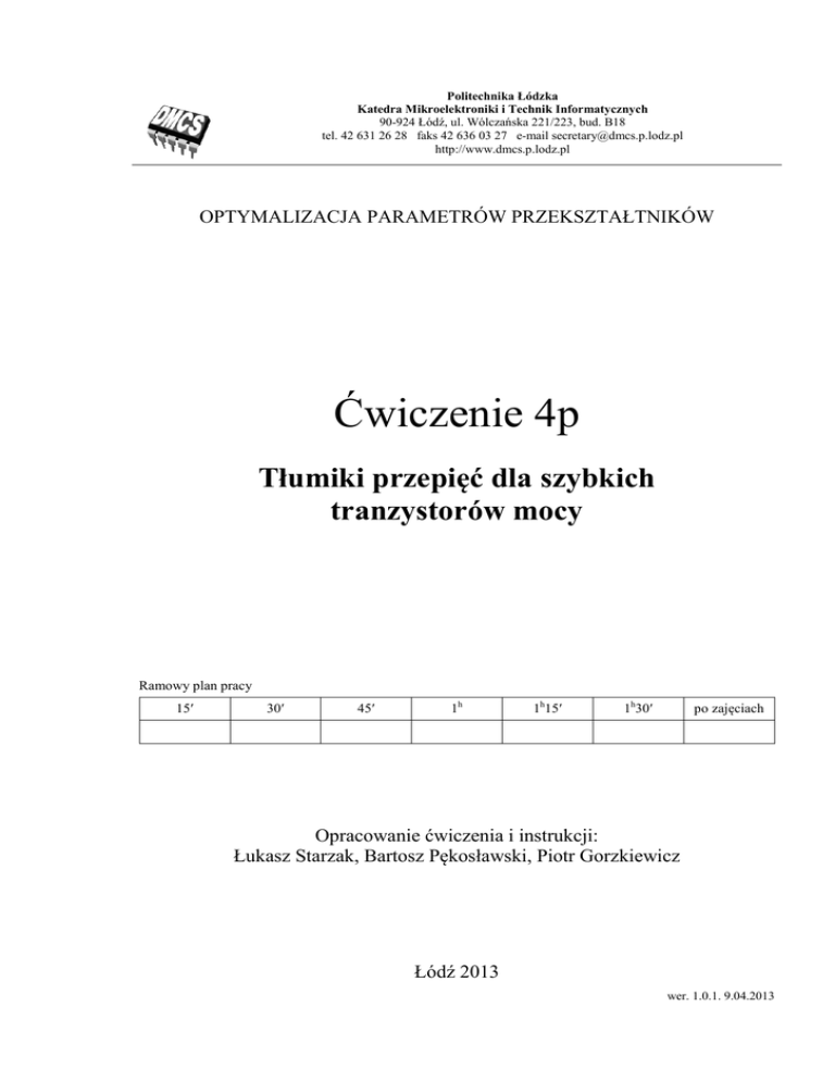 Politechnika Łódzka Katedra Mikroelektroniki i Technik Informatycznych 90-924 Łódź, ul. Wólczańska 221/223, bud. B18 tel. 42 631 26 28 faks 42 636 03 27 e-mail [email protected] http://www.dmcs.p.lodz.pl OPTYMALIZACJA PARAMETRÓW PRZEKSZTAŁTNIKÓW Ćwiczenie 4p Tłumiki przepięć dla szybkich tranzystorów mocy Ramowy plan pracy 15′ 30′ 45′ 1h 1h15′ 1h30′ po zajęciach Opracowanie ćwiczenia i instrukcji: Łukasz Starzak, Bartosz Pękosławski, Piotr Gorzkiewicz Łódź 2013 wer. 1.0.1. 9.04.2013 Spis treści B Wprowadzenie do ćwiczenia..............................................................................................................5 1. Cel i przebieg ćwiczenia....................................................................................................................5 2. Podstawy teoretyczne ........................................................................................................................7 2.1. Wprowadzenie .........................................................................................................................7 C Doświadczenie.....................................................................................................................................8 3. Pomiary..............................................................................................................................................8 3.1. Układ pomiarowy ....................................................................................................................8 3.2. Wykonanie pomiarów............................................................................................................11 D Wyniki ...............................................................................................................................................13 4. Opracowanie i analiza wyników......................................................................................................13 E Informacje.........................................................................................................................................15 5. Literatura .........................................................................................................................................15 © 2013 Katedra Mikroelektroniki i Technik Informatycznych Politechniki Łódzkiej B Wprowadzenie do ćwiczenia 1. Cel i przebieg ćwiczenia Celem ćwiczenia jest zbadanie działania obwodów tłumików w przykładowym układzie – przetwornicy podwyższającej napięcie. W ćwiczeniu badane są tłumiki: RC, RLD i stromościowy RCD. © 2013 Katedra Mikroelektroniki i Technik Informatycznych Politechniki Łódzkiej 2. Podstawy teoretyczne [1] 2.1. Wprowadzenie Tłumiki (ang. snubbers) są bardzo ważnymi podzespołami elektroniki mocy. Są to małe obwody, zazwyczaj umieszczane równolegle do przyrządów półprzewodnikowych jak najbliżej końcówek należących do obwodu głównego. Zadaniem tłumików jest eliminacja negatywnych efektów powodowanych w układzie przez indukcyjności i pojemności pasożytnicze podczas komutacji przyrządu półprzewodnikowego. Poprawnie zaprojektowany, dobrany oraz wykonany tłumik ma bardzo pozytywny wpływ na układ elektroniczny. Absorbuje on energię zgromadzoną wcześniej w pasożytniczych elementach reaktancyjnych obwodu i dzięki temu niweluje on przepięcia i oscylacje powstające podczas komutacji. Przekłada się to na zmniejszenie szczytowych wartości napięcia i prądu występujących na elemencie półprzewodnikowym. To z kolei wpływa na zmniejszenie dynamicznej mocy strat oraz zabezpiecza przed znalezieniem się punktu pracy poza obszarem bezpiecznej pracy przyrządu. Tłumik może też zmniejszyć stromość narastania napięcia bądź prądu. Ponownie przekłada się to na zmniejszenie dynamicznej mocy strat. Dodatkowo powoduje to zmniejszenie poziomu zaburzeń elektromagnetycznych (EMI), gdyż ich wielkość zależy od szybkości zmian chwilowych wartości prądu i napięcia. Zmniejszenie mocy strat dynamicznych przyrządu półprzewodnikowego pozwala na sterowanie go przebiegiem impulsowym o wyższej częstotliwości. Pozwala to spełnić wymóg minimalizacji elementów reaktancyjnych układu i w rezultacie zmniejszyć rozmiar całego przekształtnika. Tłumiki można podzielić na pasywne i aktywne. Tłumiki pasywne składają się tylko z elementów pasywnych, tj. rezystorów, cewek, kondensatorów i diod. Tłumiki aktywne są o wiele bardziej złożonymi obwodami. W swojej konstrukcji zawierają one elementy pasywne – wymienione wcześniej, jak i elementy aktywne – zazwyczaj tranzystory. © 2013 Katedra Mikroelektroniki i Technik Informatycznych Politechniki Łódzkiej C Doświadczenie 3. Pomiary 3.1. Układ pomiarowy Układ pomiarowy, którego schemat jest pokazany poniżej, składa się z obwodu przetwornicy DC/DC podwyższającej napięcie z 15V do 30V, zasilacza laboratoryjnego o wydajności prądowej 20A, połączonych szeregowo rezystorów 10 Ohm, 50W pełniących rolę obciążenia, oscyloskopu z przyłączonymi sondą napięciową 10:1 i sondą prądową oraz komputera PC zbierającego . Oscyloskop Komputer Sonda prądowa Zasilacz 15V Przetwornica DC/DC Obciążenie R Rys. 1. Schemat układu pomiarowego © Katedra Mikroelektroniki i Technik Informatycznych Politechniki Łódzkiej Obwód mocy został przestawiony na rysunku 2. Elementami obwodu mocy przetwornicy są: • filtrujący kondensator wejściowy C21 = 100µF, • dławik L1 = 74µH, • tranzystor MOSFET IRL520N, • dioda mocy BYV28-200, • kondensator wyjściowy C20 = 220µF. Rezystor Rs1, dioda Ds1 i cewka Ls1 stanowią tłumik prądowy RLD. Rezystor Rs2 i kondensator Cs2 stanowią tłumik napięciowy RC. Rezystor Rs3, dioda Ds3 i kondensator Cs3 stanowią stromościowy tłumik napięciowy RCD. Rys. 2. Schemat obwodu mocy Rys. 3 Widok obwodu drukowanego układu przetwornicy © Katedra Mikroelektroniki i Techni