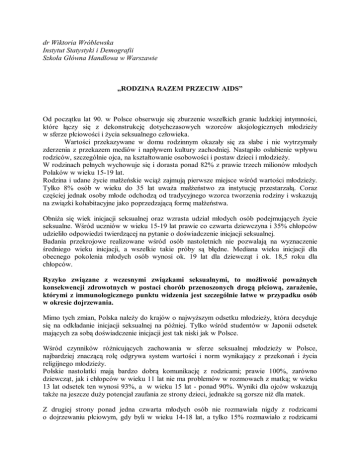 dr Wiktoria Wróblewska Instytut Statystyki i Demografii Szkoła Główna Handlowa w Warszawie „RODZINA RAZEM PRZECIW AIDS” Od początku lat 90. w Polsce obserwuje się zburzenie wszelkich granic ludzkiej intymności, które łączy się z dekonstrukcję dotychczasowych wzorców aksjologicznych młodzieży w sferze płciowości i życia seksualnego człowieka. Wartości przekazywane w domu rodzinnym okazały się za słabe i nie wytrzymały zderzenia z przekazem mediów i napływem kultury zachodniej. Nastąpiło osłabienie wpływu rodziców, szczególnie ojca, na kształtowanie osobowości i postaw dzieci i młodzieży. W rodzinach pełnych wychowuje się i dorasta ponad 82% z prawie trzech milionów młodych Polaków w wieku 15-19 lat. Rodzina i udane życie małżeńskie wciąż zajmują pierwsze miejsce wśród wartości młodzieży. Tylko 8% osób w wieku do 35 lat uważa małżeństwo za instytucję przestarzałą. Coraz częściej jednak osoby młode odchodzą od tradycyjnego wzorca tworzenia rodziny i wskazują na związki kohabitacyjne jako poprzedzającą formę małżeństwa. Obniża się wiek inicjacji seksualnej oraz wzrasta udział młodych osób podejmujących życie seksualne. Wśród uczniów w wieku 15-19 lat prawie co czwarta dziewczyna i 35% chłopców udzieliło odpowiedzi twierdzącej na pytanie o doświadczenie inicjacji seksualnej. Badania przekrojowe realizowane wśród osób nastoletnich nie pozwalają na wyznaczenie średniego wieku inicjacji, a wszelkie takie próby są błędne. Mediana wieku inicjacji dla obecnego pokolenia młodych osób wynosi ok. 19 lat dla dziewcząt i ok. 18,5 roku dla chłopców. Ryzyko związane z wczesnymi związkami seksualnymi, to możliwość poważnych konsekwencji zdrowotnych w postaci chorób przenoszonych drogą płciową, zarażenie, którymi z immunologicznego punktu widzenia jest szczególnie łatwe w przypadku osób w okresie dojrzewania. Mimo tych zmian, Polska należy do krajów o najwyższym odsetku młodzieży, która decyduje się na odkładanie inicjacji seksualnej na później. Tylko wśród studentów w Japonii odsetek mających za sobą doświadczenie inicjacji jest tak niski jak w Polsce. Wśród czynników różnicujących zachowania w sferze seksualnej młodzieży w Polsce, najbardziej znaczącą rolę odgrywa system wartości i norm wynikający z przekonań i życia religijnego młodzieży. Polskie nastolatki mają bardzo dobrą komunikację z rodzicami; prawie 100%, zarówno dziewcząt, jak i chłopców w wieku 11 lat nie ma problemów w rozmowach z matką; w wieku 13 lat odsetek ten wynosi 93%, a w wieku 15 lat - ponad 90%. Wyniki dla ojców wskazują także na jeszcze duży potencjał zaufania ze strony dzieci, jednakże są gorsze niż dla matek. Z drugiej strony ponad jedna czwarta młodych osób nie rozmawiała nigdy z rodzicami o dojrzewaniu płciowym, gdy byli w wieku 14-18 lat, a tylko 15% rozmawiało z rodzicami w sposób otwarty i dogłębny. Wyniki takie dotyczą studentów, można, więc przypuszczać, że przekaz wiedzy w innych rodzinach może być jeszcze słabszy. Media zastąpiły rodziców, a także szkołę, w zakresie przekazu informacji dotyczących środków antykoncepcyjnych. Powszechność stosowania środków antykoncepcyjnych świadczy o tym, że na poziomie zapobiegania ciąży wśród nastolatków jest to wiedza wystarczająca. W czasie pierwszych kontaktów seksualnych ponad 80% stosowało środki zapobiegające zajściu w ciążę, a we wszystkich zestawieniach dominuje prezerwatywa. Wiedza instrumentalna, którą dysponują nastolatki nie jest wystarczająca dla rzeczywistej ochrony zdrowia młodych osób w Polsce. Zdrowie, według definicji Światowej Organizacji Zdrowia WHO, jest dobrostanem fizycznym, psychicznym i społecznym, a nie tylko brakiem choroby i inwalidztwa. Takie holistyczne podejście do zagadnień zdrowia młodego pokolenia jest możliwe tylko przy integracji działań różnych środowisk mających wpływ na wychowanie dzieci i młodzieży, wśród których rodziny i rodzice powinny mieć miejsce uprzywilejowane i podstawowe. dr Wiktoria Wróblewska Materiał przygotowany dla Krajowego Centrum ds. AIDS