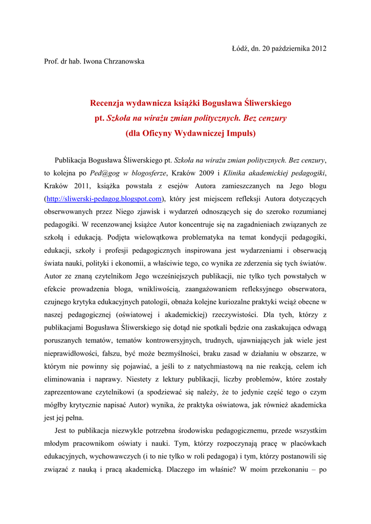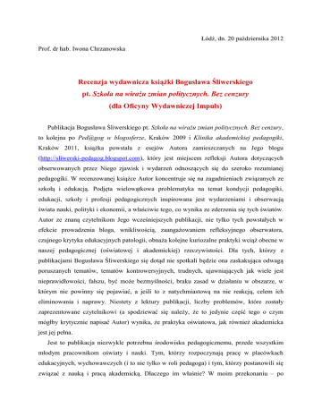 Łódź, dn. 20 października 2012 Prof. dr hab. Iwona Chrzanowska Recenzja wydawnicza książki Bogusława Śliwerskiego pt. Szkoła na wirażu zmian politycznych. Bez cenzury (dla Oficyny Wydawniczej Impuls) Publikacja Bogusława Śliwerskiego pt. Szkoła na wirażu zmian politycznych. Bez cenzury, to kolejna po Ped@gog w blogosferze, Kraków 2009 i Klinika akademickiej pedagogiki, Kraków 2011, książka powstała z esejów Autora zamieszczanych na Jego blogu (http://sliwerski-pedagog.blogspot.com), który jest miejscem refleksji Autora dotyczących obserwowanych przez Niego zjawisk i wydarzeń odnoszących się do szeroko rozumianej pedagogiki. W recenzowanej książce Autor koncentruje się na zagadnieniach związanych ze szkołą i edukacją. Podjęta wielowątkowa problematyka na temat kondycji pedagogiki, edukacji, szkoły i profesji pedagogicznych inspirowana jest wydarzeniami i obserwacją świata nauki, polityki i ekonomii, a właściwie tego, co wynika ze zderzenia się tych światów. Autor ze znaną czytelnikom Jego wcześniejszych publikacji, nie tylko tych powstałych w efekcie prowadzenia bloga, wnikliwością, zaangażowaniem refleksyjnego obserwatora, czujnego krytyka edukacyjnych patologii, obnaża kolejne kuriozalne praktyki wciąż obecne w naszej pedagogicznej (oświatowej i akademickiej) rzeczywistości. Dla tych, którzy z publikacjami Bogusława Śliwerskiego się dotąd nie spotkali będzie ona zaskakująca odwagą poruszanych tematów, tematów kontrowersyjnych, trudnych, ujawniających jak wiele jest nieprawidłowości, fałszu, być może bezmyślności, braku zasad w działaniu w obszarze, w którym nie powinny się pojawiać, a jeśli to z natychmiastową na nie reakcją, celem ich eliminowania i naprawy. Niestety z lektury publikacji, liczby problemów, które zostały zaprezentowane czytelnikowi (a spodziewać się należy, że to jedynie część tego o czym mógłby krytycznie napisać Autor) wynika, że praktyka oświatowa, jak również akademicka jest jej pełna. Jest to publikacja niezwykle potrzebna środowisku pedagogicznemu, przede wszystkim młodym pracownikom oświaty i nauki. Tym, którzy rozpoczynają pracę w placówkach edukacyjnych, wychowawczych (i to nie tylko w roli pedagoga) i tym, którzy postanowili się związać z nauką i pracą akademicką. Dlaczego im właśnie? W moim przekonaniu – po pierwsze - z uwagi na formę przekazu, krótkie, nasycone treścią eseje potrafiące zogniskować uwagę młodych ludzi może bardziej niż rozbudowane prace monograficzne, a to z powodu tego, że obecni 20-30 latkowie to pokolenie internetu, przyzwyczajone, ale i dobrze odczytujące i internalizujące informacje podawane w „pigułce”, pokolenie nowych mediów. Po drugie – dlatego, że młodzi ludzie mają jeszcze ową świeżość spojrzenia, mają w sobie bunt przeciwko temu, co sprzeczne z ideałami, które przyświecały im w wyborze profesji. Potrzebna im jest informacja, że nie tylko oni dostrzegają „zgrzyt” między wyniesionym z kształcenia akademickiego przesłaniem, a rzeczywistością szkolną, że nie są w opinii tej odosobnieni. Potrzebne jest im potwierdzenie, że z taką rzeczywistością nie muszą i nie powinni się godzić, że warto i należy ją demaskować, przeciwstawiać się jej, nie zgadzać z nią. Drugą grupą odbiorców publikacji powinni być jednak koniecznie również ci pedagodzy (z obu środowisk: oświatowego i akademickiego), którzy pozostając w zawodzie od lat, nie raz zetknęli się z poruszanymi przez Bogusława Śliwerskiego zjawiskami, a stracili wiarę, że można i należy się im przeciwstawiać. Im też potrzebne jest wsparcie i wiara w to, że nie są „oszołomami” dostrzegającymi rzeczywistość jedynie w jej czarnej barwie. Wiem, że w środowisku pedagogów jest cała rzesza ludzi, autentycznie zaangażowanych w misję swojej pracy, niewyrażających zgody na nieprawidłowości, wypaczenia, bylejakość, bezmyślność i sprzeniewierzanie się ideałom, którzy swoją pracą zaprzeczają wszystkiemu temu, co wybrzmiewa z esejów Autora książki, co metaforycznie nazywa On wirażem, na którym znalazła się polska szkoła w efekcie zmian choć nie tylko przecież politycznych, bo i społecznych, gospodarczych, ekonomicznych. Dzisiaj zakończyła się VII międzynarodowa konferencja organizowana przez Profesora Bogusława Śliwerskiego z cyklu Edukacja Alternatywna, w której miałam przyjemność (nie po raz pierwszy) uczestniczyć. Minęło 20 lat od pierwszego w 1992 r. spotkania i wciąż, jak się okazuje, cieszy się ona niezmiennym zainteresowaniem. Wciąż wyjeżdżający z niej uczestnicy żegnają się w niedosycie dyskusji, ale pełni optymizmu i wiary w to, że można pracować z pasją, że można poszukiwać (również w przeszłości) dobrych wzorców, przykładów dobrej, rzetelnej, zaangażowanej pracy, że należy przeciwstawiać się i otwarcie z determinacją definiować obszary patologii. W ten nurt myślenia wpisuje się zdecydowanie publikacja Bogusława Śliwerskiego. Odczytuję ją jednak wielowymiarowo. Jest nie tylko refleksją jej Autora nad kondycją – złą kondycją, polskiej szkoły (również na poziomie szkoły wyższej), nie jest tylko próbą zwrócenia uwagi na niedopuszczalne praktyki pseudowychowawcze. Odczytuję ją jako źródło inspiracji dla badaczy (zarówno młodych, jak i doświadczonych), gdyż opisywane przez Autora przykłady są gotowymi wręcz problemami badawczymi, które aż proszą się o ich weryfikację, celem stwierdzenia czy to co, zostało opisane jako incydent, jest nim w istocie (OBY), czy niestety może już prawidłowością. Inny wymiar publikacji to prezentacja nowych obszarów koniecznych pedagogicznych refleksji, które nieobce są Autorowi, ale niekoniecznie środowisku akademickiemu. Wątki te przeplatają się w publikacji utrzymując, nieprzerwanie, uwagę czytelnika na najwyższym poziomie. Lektura pub