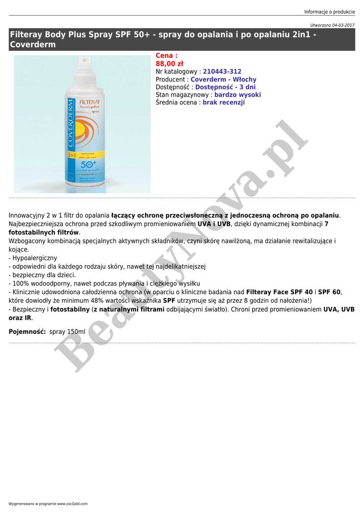 Informacje o produkcie Utworzono 04-03-2017 Filteray Body Plus Spray SPF 50+ - spray do opalania i po opalaniu 2in1 Coverderm Cena : 88,00 zł ov a. pl Nr katalogowy : 210443-312 Producent : Coverderm - Włochy Dostępność : Dostępność - 3 dni Stan magazynowy : bardzo wysoki Średnia ocena : brak recenzji ea ut yN Innowacyjny 2 w 1 filtr do opalania łączący ochronę przeciwsłoneczną z jednoczesną ochroną po opalaniu. Najbezpieczniejsza ochrona przed szkodliwym promieniowaniem UVA i UVB, dzięki dynamicznej kombinacji 7 fotostabilnych filtrów. Wzbogacony kombinacją specjalnych aktywnych składników, czyni skórę nawilżoną, ma działanie rewitalizujące i kojące. - Hypoalergiczny - odpowiedni dla każdego rodzaju skóry, nawet tej najdelikatniejszej - bezpieczny dla dzieci. - 100% wodoodporny, nawet podczas pływania i ciężkiego wysiłku - Klinicznie udowodniona całodzienna ochrona (w oparciu o kliniczne badania nad Filteray Face SPF 40 i SPF 60, które dowiodły że minimum 48% wartości wskaźnika SPF utrzymuje się aż przez 8 godzin od nałożenia!) - Bezpieczny i fotostabilny (z naturalnymi filtrami odbijającymi światło). Chroni przed promieniowaniem UVA, UVB oraz IR. B Pojemność: spray 150ml Wygenerowano w programie www.oscGold.com