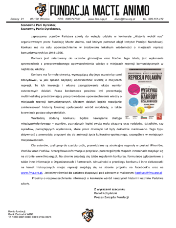 Bielany 21 06-120 Winnica KRS: 0000747350 www.fma.org.pl [email protected] tel. 509-151-412 Szanowna Pani Dyrektor, Szanowny Panie Dyrektorze, zapraszamy uczniów Państwa szkoły do wzięcia udziału w konkursie „Historia wokół nas” organizowanym przez Fundację Macte Animo, nad którym patronat objął Instytut Pamięci Narodowej. Konkurs ma na celu upowszechnienie w środowisku lokalnym wiadomości o miejscach represji komunistycznych lat 1944-1956. Konkurs jest skierowany do uczniów gimnazjów oraz liceów. Jego istotą jest wykonanie sprawozdania z przeprowadzonego upowszechnienia wiedzy o miejscach represji komunistycznych w najbliższej okolicy. Konkurs ma formułę otwartą, wymagającą aby jego uczestnicy sami zdecydowali, w jaki sposób najlepiej upowszechnić wiedzę o miejscach represji. To ich inwencja i własne zaangażowanie ukaże wymiar ostatecznych działań. Praca konkursowa powinna być prezentacją multimedialną przedstawiającą przeprowadzone upowszechnienia wiedzy o miejscach represji komunistycznych. Efektem działań będzie rozwijanie zainteresowań historią lokalnej społeczności wśród młodzieży, a także krzewienie postaw obywatelskich. Wartością dodaną konkursu będzie nawiązanie dialogu międzypokoleniowego – uczniów, poznających lepiej swoją małą ojczyznę oraz rodziców, dziadków, czy sąsiadów, pamiętających wydarzenia, które przez dziesiątki lat były dokładnie maskowane. Tego typu aktywność z pewnością przyczyni się do animacji życia kulturalno-społecznego, szczególnie w mniejszych miejscowościach. Dla autorów, czyli grup do sześciu osób, przewidziane są atrakcyjne nagrody w postaci iPhon’ów, iPad’ów oraz iPod’ów. Szczegółowa informacja o projekcie, poszczególnych etapach i terminach znajduje się na stronie www.fma.org.pl. Na stronie znajdują się także regulamin konkursu, formularze zgłoszeniowe a także inne informacje o Organizatorach i Partnerach. Aktualności o przebiegu konkursu i inne ciekawostki na temat historycznych miejsc represji znajdują się na stronie projektu na Facebook’u oraz na www.fma.org.pl. Jesteśmy również do państwa dyspozycji pod adresem e-mailowym: [email protected] Prosimy o rozpowszechnienie informacji o konkursie wśród nauczycieli historii i uczniów Państwa szkoły. Z wyrazami szacunku Karol Kobyliński Prezes Zarządu Fundacji Konto fundacji: Bank Zachodni WBK: 15 1090 2851 0000 0001 2194 3973