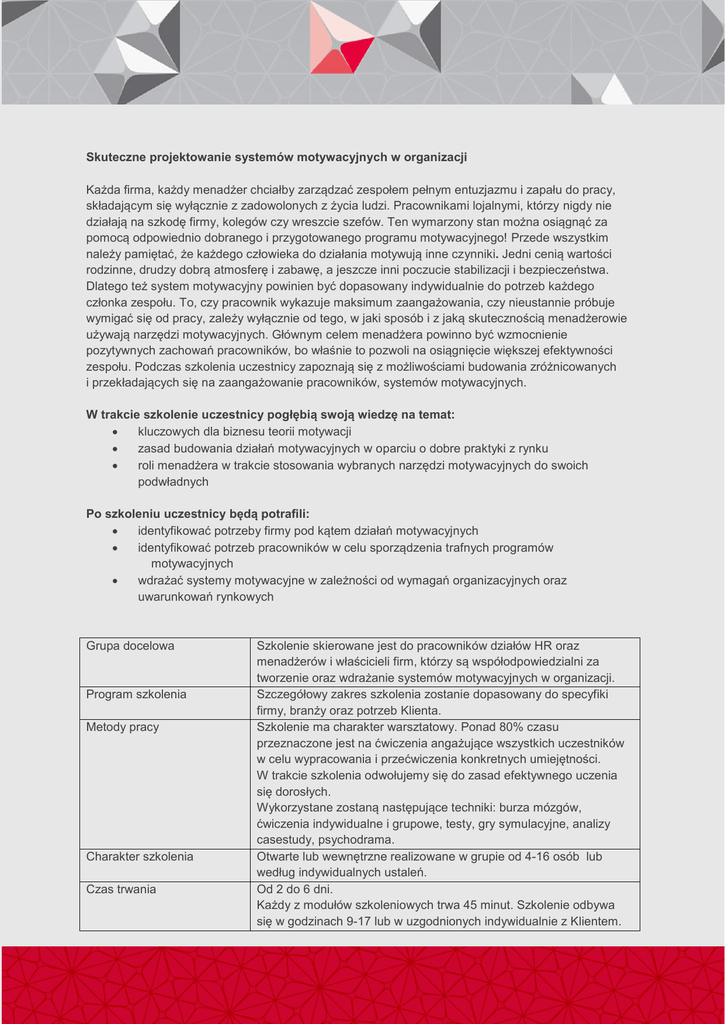 Skuteczne projektowanie systemów motywacyjnych w organizacji Każda firma, każdy menadżer chciałby zarządzać zespołem pełnym entuzjazmu i zapału do pracy, składającym się wyłącznie z zadowolonych z życia ludzi. Pracownikami lojalnymi, którzy nigdy nie działają na szkodę firmy, kolegów czy wreszcie szefów. Ten wymarzony stan można osiągnąć za pomocą odpowiednio dobranego i przygotowanego programu motywacyjnego! Przede wszystkim należy pamiętać, że każdego człowieka do działania motywują inne czynniki. Jedni cenią wartości rodzinne, drudzy dobrą atmosferę i zabawę, a jeszcze inni poczucie stabilizacji i bezpieczeństwa. Dlatego też system motywacyjny powinien być dopasowany indywidualnie do potrzeb każdego członka zespołu. To, czy pracownik wykazuje maksimum zaangażowania, czy nieustannie próbuje wymigać się od pracy, zależy wyłącznie od tego, w jaki sposób i z jaką skutecznością menadżerowie używają narzędzi motywacyjnych. Głównym celem menadżera powinno być wzmocnienie pozytywnych zachowań pracowników, bo właśnie to pozwoli na osiągnięcie większej efektywności zespołu. Podczas szkolenia uczestnicy zapoznają się z możliwościami budowania zróżnicowanych i przekładających się na zaangażowanie pracowników, systemów motywacyjnych. W trakcie szkolenie uczestnicy pogłębią swoją wiedzę na temat: kluczowych dla biznesu teorii motywacji zasad budowania działań motywacyjnych w oparciu o dobre praktyki z rynku roli menadżera w trakcie stosowania wybranych narzędzi motywacyjnych do swoich podwładnych Po szkoleniu uczestnicy będą potrafili: identyfikować potrzeby firmy pod kątem działań motywacyjnych identyfikować potrzeb pracowników w celu sporządzenia trafnych programów motywacyjnych wdrażać systemy motywacyjne w zależności od wymagań organizacyjnych oraz uwarunkowań rynkowych Grupa docelowa Program szkolenia Metody pracy Charakter szkolenia Czas trwania Szkolenie skierowane jest do pracowników działów HR oraz menadżerów i właścicieli firm, którzy są współodpowiedzialni za tworzenie oraz wdrażanie systemów motywacyjnych w organizacji. Szczegółowy zakres szkolenia zostanie dopasowany do specyfiki firmy, branży oraz potrzeb Klienta. Szkolenie ma charakter warsztatowy. Ponad 80% czasu przeznaczone jest na ćwiczenia angażujące wszystkich uczestników w celu wypracowania i przećwiczenia konkretnych umiejętności. W trakcie szkolenia odwołujemy się do zasad efektywnego uczenia się dorosłych. Wykorzystane zostaną następujące techniki: burza mózgów, ćwiczenia indywidualne i grupowe, testy, gry symulacyjne, analizy casestudy, psychodrama. Otwarte lub wewnętrzne realizowane w grupie od 4-16 osób lub według indywidualnych ustaleń. Od 2 do 6 dni. Każdy z modułów szkoleniowych trwa 45 minut. Szkolenie odbywa się w godzinach 9-17 lub w uzgodnionych indywidualnie z Klientem. Materiały szkoleniowe Miejsce realizacji szkolenia Raport poszkoleniowy Wsparcie szkoleniowe Materiały szkoleniowe są uzupełnieniem do materiału omawianego w trakcie szkolenia. Uczestnicy otrzymują je w formie drukowanej. W siedzibie Klienta lub w miejscu przez niego wskazanym. Po realizacji szkolenia przygotowywany jest raport zawierający podsumowanie szkolenia, najważniejsze wnioski, rekomendacje dotyczące działań na przyszłość. W ciągi jednego miesiąca po szkoleniu służymy wsparciem. Zapraszamy do kontaktu, zadawania pytania odnośnie zagadnień realizowanych na szkoleniu. Wyślij zapytanie, a przedstawimy Ci szkolenie dostosowane do specyfiki i potrzeb Twojej firmy! Zapraszamy do kontaktu, tel. 22/ 839 55 99 wew. 225 MCS sp. z o.o. sp. k., ul. Czerska 14, 00-732 Warszawa [email protected], www.mcs.edu.pl