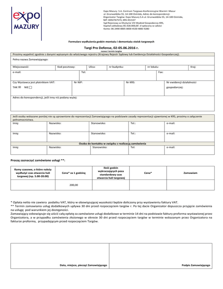 Expo Mazury S.A. Centrum Targowo-Konferencyjne Warmii i Mazur ul. Grunwaldzka 55, 14-100 Ostróda, Adres do korespondencji: Organizator Targów: Expo Mazury S.A ul. Grunwaldzka 55, 14-100 Ostróda, NIP: 8392767573, KRS:351537 Sąd Rejonowy w Olsztynie VIII Wydział Gospodarczy KRS, Kapitał zakładowy 85.428.000,00 zł opłacony w całości Konto: 06 2490 0005 0000 4530 4883 9280 Formularz wydłużenia godzin montażu i demontażu stoisk targowych Targi Pro Defense, 02-05.06.2016 r. nazwa i termin targów Prosimy wypełnić zgodnie z danymi wpisanym do właściwego rejestru (Krajowy Rejestr Sądowy lub Ewidencja Działalności Gospodarczej). Pełna nazwa Zamawiającego: Miejscowość: Kod pocztowy: e-mail: nr budynku: nr lokalu: Tel: Czy Wystawca jest płatnikiem VAT: TAK Ulica: Kraj: Fax: Nr NIP: Nr KRS: Nr ewidencji działalności NIE gospodarczej: Adres do korespondencji, jeśli inny niż podany wyżej: Jeśli osoby wskazane poniżej nie są uprawnione do reprezentacji Zamawiającego na podstawie zasady reprezentacji ujawnionej w KRS, prosimy o załączenie pełnomocnictwa. Imię: Nazwisko: Stanowisko: Tel.: e-mail: Imię: Nazwisko: Imię: Nazwisko: Stanowisko: Tel.: e-mail: Osoba do kontaktu w związku z realizacją zamówienia Stanowisko: Tel: e-mail: Proszę zaznaczyć zamówione usługi **: Ramy czasowe, o które należy wydłużyć czas otwarcia hali targowej (np. 5.00-20.00) Cena* za 1 godzinę Ilość godzin wykraczających poza standardowy czas otwarcia hali targowej Cena* Zamawiam 200,00 * Opłata netto nie zawiera podatku VAT, który w obowiązującej wysokości będzie doliczony przy wystawieniu faktury VAT. ** Termin zamawiania usług dodatkowych upływa 30 dni przed rozpoczęciem targów r. Po tej dacie Organizator dopuszcza przyjęcie zamówienia na usługę pod warunkiem jej dostępności. Zamawiający zobowiązuje się uiścić całą opłatę za zamówione usługi dodatkowe w terminie 14 dni na podstawie faktury proforma wystawionej przez Organizatora, a w przypadku zamówienia złożonego w okresie 30 dni przed rozpoczęciem targów w terminie wskazanym przez Organizatora na fakturze proforma, przypadającym przed rozpoczęciem Targów. Data, miejsce, pieczęć Zamawiającego Podpis Zamawiającego