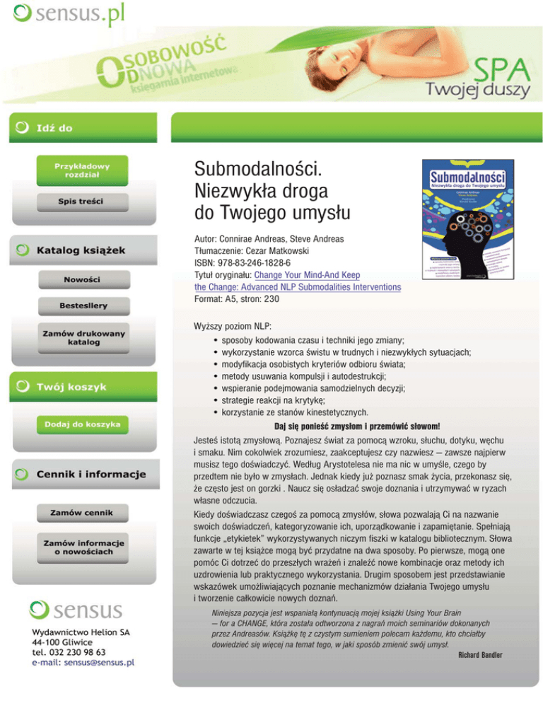 Submodalnoœci. Niezwyk³a droga do Twojego umys³u Autor: Connirae Andreas, Steve Andreas T³umaczenie: Cezar Matkowski ISBN: 978-83-246-1828-6 Tytu³ orygina³u: Change Your Mind-And Keep the Change: Advanced NLP Submodalities Interventions Format: A5, stron: 230 Wy¿szy poziom NLP: • sposoby kodowania czasu i techniki jego zmiany; • wykorzystanie wzorca œwistu w trudnych i niezwyk³ych sytuacjach; • modyfikacja osobistych kryteriów odbioru œwiata; • metody usuwania kompulsji i autodestrukcji; • wspieranie podejmowania samodzielnych decyzji; • strategie reakcji na krytykê; • korzystanie ze stanów kinestetycznych. Daj siê ponieœæ zmys³om i przemówiæ s³owom! Jesteœ istot¹ zmys³ow¹. Poznajesz œwiat za pomoc¹ wzroku, s³uchu, dotyku, wêchu i smaku. Nim cokolwiek zrozumiesz, zaakceptujesz czy nazwiesz — zawsze najpierw musisz tego doœwiadczyæ. Wed³ug Arystotelesa nie ma nic w umyœle, czego by przedtem nie by³o w zmys³ach. Jednak kiedy ju¿ poznasz smak ¿ycia, przekonasz siê, ¿e czêsto jest on gorzki . Naucz siê os³adzaæ swoje doznania i utrzymywaæ w ryzach w³asne odczucia. Kiedy doœwiadczasz czegoœ za pomoc¹ zmys³ów, s³owa pozwalaj¹ Ci na nazwanie swoich doœwiadczeñ, kategoryzowanie ich, uporz¹dkowanie i zapamiêtanie. Spe³niaj¹ funkcje „etykietek” wykorzystywanych niczym fiszki w katalogu bibliotecznym. S³owa zawarte w tej ksi¹¿ce mog¹ byæ przydatne na dwa sposoby. Po pierwsze, mog¹ one pomóc Ci dotrzeæ do przesz³ych wra¿eñ i znaleŸæ nowe kombinacje oraz metody ich uzdrowienia lub praktycznego wykorzystania. Drugim sposobem jest przedstawianie wskazówek umo¿liwiaj¹cych poznanie mechanizmów dzia³ania Twojego umys³u i tworzenie ca³kowicie nowych doznañ. Niniejsza pozycja jest wspania³¹ kontynuacj¹ mojej ksi¹¿ki Using Your Brain — for a CHANGE, która zosta³a odtworzona z nagrañ moich seminariów dokonanych przez Andreasów. Ksi¹¿kê tê z czystym sumieniem polecam ka¿demu, kto chcia³by dowiedzieæ siê wiêcej na temat tego, w jaki sposób zmieniæ swój umys³. Richard Bandler Spis treci Przedmowa Richarda Bandlera Podzikowania Wprowadzenie 1. Linie czasu 5 7 9 13 – 40 Sposób, w jaki postrzegamy czas, ma bardzo silny wpyw na nasze dowiadczenia. W tym rozdziale przybliymy metody rozpoznawania sposobu kodowania czasu i techniki jego zmiany, a take przedstawimy interesujce przykady modyfikacji linii czasu, które wywoay istotne zmiany w yciu innych ludzi. 2. Wykorzystanie czasu 41 – 54 Czasy gramatyczne mog zwikszy lub ograniczy skuteczno pracy nad zmian osobist. 3. Wzorzec wistu 55 – 79 W rozdziale tym opisane zostay szczegóowe instrukcje wykorzystywania tego wzorca odnonie do konkretnego problemu, a take metody stosowania go w systemach dwikowym i kinestetycznym. Oprócz tego przedstawilimy przykady wykorzystania tego wzorca w sytuacjach „trudnych” bd „niezwykych”. 4. Zmiana wanoci kryteriów 81 – 110 Nasze kryteria, takie jak „potrzeba posiadania racji”, „zadowalanie innych” czy „wadza”, czasami bywaj dla nas zbyt istotne, podczas gdy inne kryteria, jak na przykad „troska o zdrowie” lub „reakcje na potrzeby innych”, nie s tak wane, jak bymy chcieli. Zmiana wanoci tych kryteriów moe jednak zosta dokonana za pomoc submodalnoci. 5. Usuwanie kompulsji 111 – 139 Silne reakcje, takie jak objadanie si, gniew czy uzalenienia, których trudno si pozby za pomoc innych metod, mog zosta szybko usunite dziki zastosowaniu takich strategii, jak zwarcie kompulsji i wzorzec wistu. 3 4 Submodalnoci. Niezwyka droga do Twojego umysu 6. Wzorzec progowy „ostatniej kropli” 141 – 159 Czyli w jaki sposób wyrwa kogo ze szponów destrukcyjnego zachowania czy toksycznego zwizku. 7. Autorytet zewntrzny i wewntrzny 161 – 176 Niektórzy ludzie w „naturalny” sposób decyduj o sobie, podczas gdy inni z atwoci poddaj si sugestiom innych. Zawarte tu informacje mog pomóc tym, którzy maj problemy z podejmowaniem samodzielnych decyzji. 8. Strategia reakcji na krytyk 177 – 194 Szczegóowy opis procedury wykorzystywanej w naturalny sposób przez osoby odporne na krytyk. Dowiedz si, jak pozostawa w stanie zasobnym podczas oceny lub krytyki i wykorzystywa „informacje zwrotne” w celu poprawienia wasnych zachowa. 9. Korzystanie ze stanów kinestetycznych 195 – 212 Przywoywanie stanów narkotycznych moe by czym wicej ni czyst rozrywk. Metoda ta stosowana jest równie przez ludzi, którzy musz bra rodki znieczulajce, ale jednoczenie pragn unikn zwizanych z tym efektów ubocznych. Opisywany wzorzec pozwala skutecznie przywoa dowolny stan opierajcy si w duej mierze na doznaniach kinestetycznych. 10. Inne zmiany submodalnoci 213 – 223 Zebrane metody „najkrótszej terapii” sucej do zmian naszego sposobu mylenia. Modelowanie doskonaoci. 1 Linie czasu W ikszo z nas spotyka od czasu do czasu ludzi, o których mówimy: „On cigle yje przeszoci”, „Jedyne, o czym on myli, to przyszo; nigdy nie ma czasu zatrzyma si i rozejrze wokó”, „Ona yje tylko dniem dzisiejszym i nigdy nie zastanawia si nad tym, dokd zmierza”. Pojcia te odzwierciedlaj sposób, w jaki rozumiemy czas (czyli przeszo, teraniejszo i przyszo), który stanowi podstaw naszych ogranicze i nabywanych umiejtnoci. Z tego powodu niektórych problemów nie da si rozwiza, jeeli najpierw nie zmieni si sposobu postrzegania czasu przez dan osob. Niektórzy ludzie mówi o „pozostawianiu przeszoci za sob” i tak wanie postpuj w yciu. Jeeli zostawisz przeszo za plecami, przestajesz j widzie i zniknie ona z twojego ycia. Inni z kolei mówi o mglistej przyszoci i, faktycznie, rozcigajca si przed nimi cz linii czasu jest mglista. S nawet ludzie, którzy w ogóle nie maj przyszoci. Czas jest jednym z najbardziej podstawowych skadowych naszych dowiadcze. Pomyl tylko, jak moglibymy dowiadcza wiata, nie majc poczucia czasu. Bez niego nie byoby bowiem przyczynowoci, nie wiedzielibymy, jak zaspokoi swoje potrzeby, i nie mie