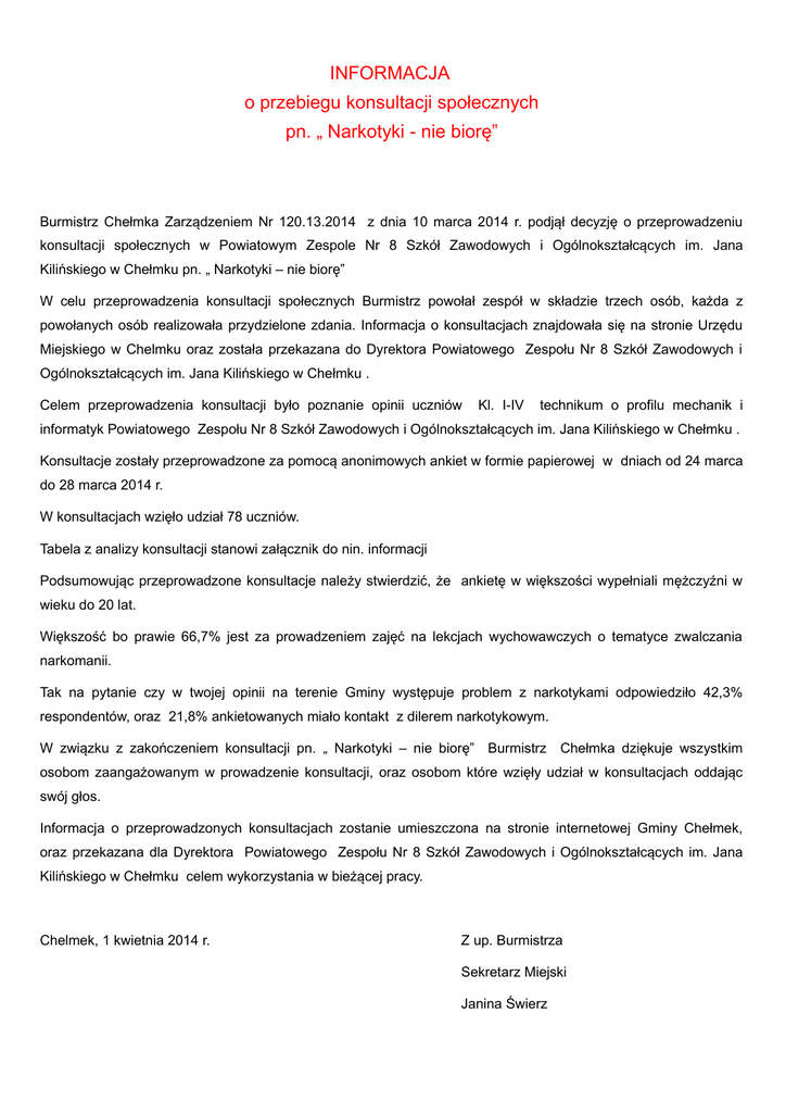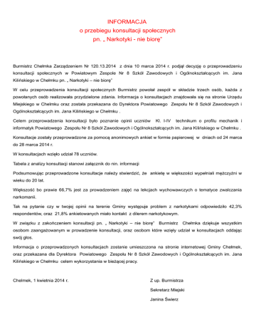 INFORMACJA o przebiegu konsultacji społecznych pn. „ Narkotyki - nie biorę” Burmistrz Chełmka Zarządzeniem Nr 120.13.2014 z dnia 10 marca 2014 r. podjął decyzję o przeprowadzeniu konsultacji społecznych w Powiatowym Zespole Nr 8 Szkół Zawodowych i Ogólnokształcących im. Jana Kilińskiego w Chełmku pn. „ Narkotyki – nie biorę” W celu przeprowadzenia konsultacji społecznych Burmistrz powołał zespół w składzie trzech osób, każda z powołanych osób realizowała przydzielone zdania. Informacja o konsultacjach znajdowała się na stronie Urzędu Miejskiego w Chelmku oraz została przekazana do Dyrektora Powiatowego Zespołu Nr 8 Szkół Zawodowych i Ogólnokształcących im. Jana Kilińskiego w Chełmku . Celem przeprowadzenia konsultacji było poznanie opinii uczniów Kl. I-IV technikum o profilu mechanik i informatyk Powiatowego Zespołu Nr 8 Szkół Zawodowych i Ogólnokształcących im. Jana Kilińskiego w Chełmku . Konsultacje zostały przeprowadzone za pomocą anonimowych ankiet w formie papierowej w dniach od 24 marca do 28 marca 2014 r. W konsultacjach wzięło udział 78 uczniów. Tabela z analizy konsultacji stanowi załącznik do nin. informacji Podsumowując przeprowadzone konsultacje należy stwierdzić, że ankietę w większości wypełniali mężczyźni w wieku do 20 lat. Większość bo prawie 66,7% jest za prowadzeniem zajęć na lekcjach wychowawczych o tematyce zwalczania narkomanii. Tak na pytanie czy w twojej opinii na terenie Gminy występuje problem z narkotykami odpowiedziło 42,3% respondentów, oraz 21,8% ankietowanych miało kontakt z dilerem narkotykowym. W związku z zakończeniem konsultacji pn. „ Narkotyki – nie biorę” Burmistrz Chełmka dziękuje wszystkim osobom zaangażowanym w prowadzenie konsultacji, oraz osobom które wzięły udział w konsultacjach oddając swój głos. Informacja o przeprowadzonych konsultacjach zostanie umieszczona na stronie internetowej Gminy Chełmek, oraz przekazana dla Dyrektora Powiatowego Zespołu Nr 8 Szkół Zawodowych i Ogólnokształcących im. Jana Kilińskiego w Chełmku celem wykorzystania w bieżącej pracy. Chelmek, 1 kwietnia 2014 r. Z up. Burmistrza Sekretarz Miejski Janina Świerz ANALIZA KONSULTACJI „ Narkotyki – nie biorę” Wiek osoby wypełniającej ankietę Płeć osoby wypełniającej ankietę Czy program lekcji wychowawczych powinien obejmować tematy zwalczania narkomanii Czy w twojej opinii na terenie Gminy występuje problem z narkotykami Czy miałeś kontakt z dilerem narkotykowym Do 20 lat Powyżej K M Tak Nie Tak Nie Tak Nie 76 2 13 65 52 26 33 45 17 61