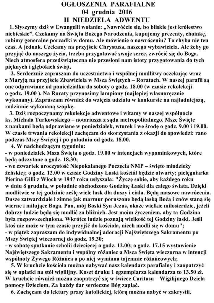 OGŁOSZENIA PARAFIALNE 04 grudnia 2016 II NIEDZIELA
