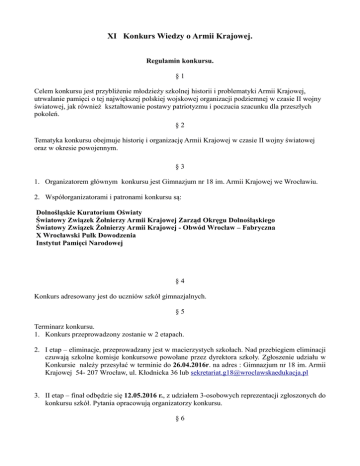 XI Konkurs Wiedzy o Armii Krajowej. Regulamin konkursu. §1 Celem konkursu jest przybliżenie młodzieży szkolnej historii i problematyki Armii Krajowej, utrwalanie pamięci o tej największej polskiej wojskowej organizacji podziemnej w czasie II wojny światowej, jak również kształtowanie postawy patriotyzmu i poczucia szacunku dla przeszłych pokoleń. §2 Tematyka konkursu obejmuje historię i organizację Armii Krajowej w czasie II wojny światowej oraz w okresie powojennym. §3 1. Organizatorem głównym konkursu jest Gimnazjum nr 18 im. Armii Krajowej we Wrocławiu. 2. Współorganizatorami i patronami konkursu są: Dolnośląskie Kuratorium Oświaty Światowy Związek Żołnierzy Armii Krajowej Zarząd Okręgu Dolnośląskiego Światowy Związek Żołnierzy Armii Krajowej - Obwód Wrocław – Fabryczna X Wrocławski Pułk Dowodzenia Instytut Pamięci Narodowej §4 Konkurs adresowany jest do uczniów szkół gimnazjalnych. §5 Terminarz konkursu. 1. Konkurs przeprowadzony zostanie w 2 etapach. 2. I etap – eliminacje, przeprowadzany jest w macierzystych szkołach. Nad przebiegiem eliminacji czuwają szkolne komisje konkursowe powołane przez dyrektora szkoły. Zgłoszenie udziału w Konkursie należy przesyłać w terminie do 26.04.2016r. na adres : Gimnazjum nr 18 im. Armii Krajowej 54- 207 Wrocław, ul. Kłodnicka 36 lub [email protected] 3. II etap – finał odbędzie się 12.05.2016 r., z udziałem 3-osobowych reprezentacji zgłoszonych do konkursu szkół. Pytania opracowują organizatorzy konkursu. §6 Konkurs składa się z dwóch części: 1. quiz historyczny ,,Co wiem o AK?”, 2. konkurencje sprawnościowe. §7 1. W quizie historycznym ,,Co wiem o AK?” biorą udział 3-osobowe reprezentacje szkół. 2. Wszyscy uczestnicy przystępują do konkursu równocześnie zajmując miejsca przy stołach. 3. Każdy uczestnik otrzymuje zestaw (tych samych) pytań z historii i organizacji AK. Pytania mają formę otwartą i zamkniętą. 4. Uczestnicy otrzymują pytania w formie pisemnej na arkuszu, na którym zapisują odpowiedzi samodzielnie, bez porozumiewania się z innymi uczestnikami konkursu. 5. Ocena odpowiedzi dokonywana jest wg skali punktowej. Sprawdzenia prac dokonuje jury konkursu. 6. Uczestnicy konkursu oceniani są w kategoriach indywidualnej i zespołowej. 7. Kategoria indywidualna ma charakter dwustopniowy: a. część pisemna – po jej sprawdzeniu wyłaniana jest grupa 6 uczniów z najwyższymi wynikami, którzy przechodzą do części ustnej, b. część ustna – uczniowie odpowiadają na wylosowane pytanie otwarte, jury konkursu dokonuje oceny wypowiedzi wg skali punktowej. 8. Do punktacji zespołowej liczą się wyniki z części pisemnej wszystkich 3 zawodników z danej szkoły. 9. Puchar im. Armii Krajowej zdobywa szkoła, która w sumie uzyska najlepszy wynik w części pisemnej i sprawnościowej. §8 1. W Konkursie uczniowie powinni wykazać się wiedzą z zakresu historii i organizacji Armii Krajowej. 2. Lekturą podstawową w II etapie konkursu jest : ,,Od niepodległości do niepodległości. Historia Polski 1918 – 1989.” Warszawa 2010, wyd. IPN - rozdziały poświęcone historii narodu polskiego w czasie II wojny światowej . §9 1. Konkurencje sprawnościowe odbywają się na boisku szkolnym lub sali gimnastycznej ( uczniowie zabierają ze sobą stroje i obuwie sportowe). 2. Zespoły rywalizują ze sobą w następujących konkurencjach : - bieg z rannym na noszach na czas, - zakładanie opatrunku rannemu, - rzut piłeczką palantową do celu. 3. Punkty zdobyte w konkurencjach sprawnościowych doliczane są do punktacji generalnej w kategorii zespołowej. § 10 1. Na każdym etapie konkursu nad jego przebiegiem czuwa jury. 2. W I etapie – szkolne komisje konkursowe powoływane przez dyrektorów i złożone z nauczycieli danej szkoły. 3. W II etapie – Jury Konkursu Wiedzy o Armii Krajowej złożone z członków Światowego Związku Żołnierzy Armii Krajowej oraz pracowników Instytutu Pamięci Narodowej. 4. Przed rozpoczęciem zmagań przewodniczący jury zapoznaje uczniów z regulaminem, a w szczególności ze sposobem odpowiedzi na pytania oraz podaje zasady oceny odpowiedzi ( w konkurencjach sprawnościowych - czas i zasady przyznawania punktów). 5. Do zadań jury należy: zadawanie pytań, ocena wypowiedzi uczestników, sprawdzenie prac pisemnych, ustalanie kolejności osób, przyjmowanie i rozpatrywanie na miejscu protestów, ogłaszanie wyników. § 11 1. Po zakończeniu wszystkich części konkursu jury przyznaje uczestnikom nagrody. 2. Nagrodę główną w klasyfikacji zespołowej – Puchar im. Armii Krajowej, otrzymują zespoły, które zajęły kolejno I, II i III miejsca. 3. W kategorii indywidualnej nagradzane są miejsca I,II i III. Dyrektor Gimnazjum nr18 mgr Anna Krupowicz Koordynator konkursu: Agnieszka Maziarska Gimnazjum nr 18 54-218 Wrocław Tel. 71 798 67 09 Fax. 71 798 42 09
