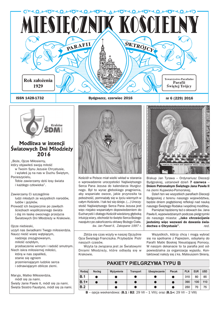 ISSN 1428-1732 „Boże, Ojcze Miłosierny, który objawiłeś swoją miłość w Twoim Synu Jezusie Chrystusie, i wylałeś ją na nas w Duchu Świętym, Pocieszycielu, Tobie zawierzamy dziś losy świata i każdego człowieka”. Zawierzamy Ci szczególnie ludzi młodych ze wszystkich narodów, ludów i języków. Prowadź ich bezpiecznie po zawiłych ścieżkach współczesnego świata i daj im łaskę owocnego przeżycia Światowych Dni Młodzieży w Krakowie. Ojcze niebieski, uczyń nas świadkami Twego miłosierdzia. Naucz nieść wiarę wątpiącym, nadzieję zrezygnowanym, miłość oziębłym, przebaczenie winnym i radość smutnym. Niech iskra miłosiernej miłości, którą w nas zapaliłeś, stanie się ogniem przemieniającym ludzkie serca i odnawiającym oblicze ziemi. Bydgoszcz, czerwiec 2016 Kościół w Polsce miał wielki wkład w starania o wprowadzenie uroczystości Najświętszego Serca Pana Jezusa do kalendarza liturgicznego. Był to wyraz głebokiego pragnienia, aby wspaniałe owoce, jakie przynosiła ta pobożność, pomnażały się w życiu wiernych w całym Kościele. I tak też się dzieje. (...) Uroczystość Najświętszego Serca Pana Jezusa jest więc niejako wspaniałym dopowiedzeniem do Eucharystii i dlatego Kościół wiedziony głęboką intuicją wiary, obchodzi to święto Serca Bożego nazajutrz po zakończeniu oktawy Bożego Ciała. św. Jan Paweł II, Zakopane 1997 r. Biskup Jan Tyrawa – Ordynariusz Diecezji Bydgoskiej, ustanowił dzień 7 czerwca – Dniem Patronalnym Świętego Jana Pawła II na ziemi Kujawsko-Pomorskiej. Dzień ten we wszystkich parafiach Diecezji Bydgoskiej z terenu naszego województwa, będzie dniem pogłębionej refleksji nad nauką naszego Świętego Rodaka i wspólnej modlitwy. Pamiętać będziemy też o słowach św. Jana Pawła II, wypowiedzianych podczas pielgrzymki do naszego miasta: „Jako chrześcijanie jesteśmy więc wezwani do dawania świadectwa o Chrystusie”. red. Zbliża się czas wizyty w naszej Ojczyźnie Ojca Świętego Franciszka. Przybędzie Piotr naszych czasów. Wizyta ta związana jest ze Światowymi Dniami Młodzieży, które odbędą się w Krakowie. Wszystkich, którzy chcą i mogą wybrać się na spotkanie z Papieżem, odsyłamy do Parafii Matki Boskiej Nieustającej Pomocy. W naszym dekanacie to ta parafia jest odpowiedzialna za organizację wyjazdu. Kontaktować należy się z ks. Mateuszem Skierą. 3$.,(7<3,(/*5=<0$7<38% 5RG]DM Maryjo, Matko Miłosierdzia, módl się za nami. Święty Janie Pawle II, módl się za nami. Święta Siostro Faustyno, módl się za nami. nr 6 (229) 2016 % % % 1RFOHJ :\ī\ZLHQLH 7UDQVSRUW 8EH]SLHF]HQLH 3OHFDN 3/1 (85 86' B – opcja weekendowa: (B.1 i B2: 29 VII – 1 VIII); oraz (B.1+: 29 VII – 2 VIII) O MSZY ŚWIĘTEJ W DWÓCH SŁOWACH Nabożeństwa czer wcowe ku czci Najświętszego Serca Pana Jezusa odprawiane będą codziennie po wieczornej Mszy św. ok. godz. 1830, a we wtorki o godz. 2030. Zapraszamy. Czerwiec 2016 1 VI – wspomnienie św. Justyna – męczennika 2 VI – pierwszy czwartek m-ca 3 VI – Uroczystość Najświętszego Serca Pana Jezusa. Światowy Dzień Modlitwy o Uświęcenie Kapłanów. Pierwszy piątek m-ca 4 VI – wspomnienie Niepokalanego Poczęcia NMP. Pier wsza sobota m-ca. Nawiedzenie chorych i niepełnosprawnych od godz. 830 5 VI – 10. niedziela zwykła 7 VI – 17. rocznica pielgrzymki Ojca Świętego Jana Pawła II do Bydgoszczy 8 VI – wspomnienie św. Jadwigi – Królowej 10 VI – wspomnienie bł. Bogumiła – biskupa 11 VI – wspomnienie bł. Barnaby – Apostoła 12 VI – 11. niedziela zwykła 13 VI – wspomnienie św. Antoniego z Padwy – prezbitera i d-ra Kościoła 14 VI – wspomnienie bł. Michała Kozala – b-pa i męczennika, współpatrona diecezji bydgoskiej 15 VI – wspomnienie bł. Jolanty – zakonnicy 17 VI – wspomnienie św. Alberta Chmielowskiego – zakonnika 19 VI – 12. niedziela zwykła 21 VI – wspomnienie św. Alojzego Gonzagi – zakonnika 24 VI – Uroczystość Narodzenia św. Jana Chrzciciela 26 VI – 13. niedziela zwykła 28 VI – wspomnienie św. Ireneusza – b-pa i męczennika 29 VI – Uroczystość Świętych Apostołów Piotra i Pawła. Ofiary z tacy przeznaczone będą na potrzeby Stolicy red. Apostolskiej. OFIAROWANIE Są jeszcze pośród nas osoby, które pamiętają liturgię Mszy Świętej sprawowaną przed Soborem Watykańskim II. Druga jej część – liturgia eucharystyczna – rozpoczynała się od ofiarowania. Podczas Soboru, dzięki Duchowi Świętemu, Kościół głębiej wniknął w istotę Mszy Świętej, odkrywając m.in. to, że ofiarowanie (złożenie ofiary) następuje krótko po aklamacji (opisanej w poprzednim rozdziale) i posiada znacznie głębszą treść. W każdej Modlitwie Eucharystycznej ujęto to niezwykłe, duchowe wydarzenie w nieco innych słowach. W najczęściej stosowanej Drugiej Modlitwie Euchar ystycznej opisano je zaledwie 7 słowami: „ofiarujemy Tobie, Boże, Chleb życia i Kielich zbawienia”. Podobnie ujmuje to Tr zecia Modlitwa: „składamy Ci wśród dziękczynnych modłów tę żywą i świętą Ofiarę”. Piąta Modlitwa Euchar ystyczna jest bardziej rozbudowana: „Wejrzyj, Ojcze święty, na tę Ofiarę: jest nią Chr ystus, któr y w swoim Ciele i w swojej Kr wi wydaje się za nas i swoją Ofiarą otwiera nam drogę do Ciebie”. Redakcja Miesięcznika Kościelnego ogłasza kolejny Wakacyjny Konkurs Fotograficzny. Tematem przewodnim tegorocznego konkursu będzie: CHRZCIELNICA. Na materiały konkursowe czekamy jak zwykle do 15 września. Zdjęcia zamieszczone zostaną na łamach Miesięcznika Kościelnego i wystawione będą na planszach w bocznej nawie kościoła. Szczegóły zamieścimy red. w następnym numerze MK. 23 czerwca Dzień Ojca Jak w maju, miesiącu poświęconym Maryi, obchodziliśmy święto naszych ziemskich Mam, tak w czerwcu, kiedy czcimy Najświętsze Serce Jezusa, mamy Dzień Ojca. Jak ważna jest jego