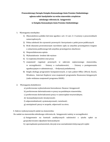 Przewodniczący Zarządu Związku Komunalnego Gmin Powiatu Chełmińskiego ogłasza nabór kandydatów na wolne stanowisko urzędnicze młodszego referenta ds. księgowości w Związku Komunalnym Gmin Powiatu Chełmińskiego 1. Wymagania niezbędne: 1) Obywatelstwo polskie lub inne zgodne z art. 11 ust. 2 i 3 ustawy o pracownikach samorządowych, 2) Pełna zdolność do czynności prawnych i korzystanie z pełni praw publicznych 3) Brak skazania prawomocnym wyrokiem sądu za umyślne przestępstwo ścigane z oskarżenia publicznego lub umyślne przestępstwo skarbowe 4) Nieposzlakowana opinia 5) Wykształcenie średnie lub wyższe 6) Co najmniej dwuletni staż pracy 7) znajomość regulacji w szczególności: prawnych w zakresie - Ustawy o rachunkowości, zajmowanego stanowiska, - Ustawy o postępowaniu egzekucyjnym w administracji , - Ordynacji podatkowej; 8) biegła obsługa programów komputerowych, w tym pakiet Office (Word, Excel), Windows, Internet Explorer oraz znajomość programów finansowo-księgowych (mile widziana znajomość programu SIGID) 2. Wymagania dodatkowe: a) preferowane wykształcenie kierunkowe: finanse i księgowość b) preferowane doświadczenie w pracy na podobnym stanowisku; c) preferowane doświadczenie pracy w samorządzie terytorialnym; d) komunikatywność, kreatywność; f) odpowiedzialność, systematyczność, rzetelność; g) umiejętność pracy w zespole, odporność na stres. 3. Zakres wykonywanych zadań na stanowisku: Do zadań na stanowisku młodszego referenta ds. księgowości należy w szczególności: a) księgowanie na kontach analitycznych należności z tytułu opłat gospodarowanie odpadami komunalnymi b) sporządzanie postanowień, decyzji oraz zawiadomień dotyczących wpłat za c) pomoc przy prowadzeniu windykacji i egzekucji należności z tytułu opłat za gospodarowanie odpadami d) wykonywanie innych zadań zlecanych przez Głównego księgowego 4. Informacja o warunkach zatrudnienia na stanowisku: a) Środowisko pracy: godziny pracy stałe, zgodnie z pracą Związku Komunalnego Gmin Powiatu Chełmińskiego . Praca jest wykonywana na terenie jednostki. Osoba zatrudniona na ww. stanowisku obsługuje sprzęt komputerowy, biurowy, pracuje na dokumentach. b) Środki pracy: komputer z drukarką, kserokopiarka i typowe narzędzia ręczne niezbędne w pracy biurowej. c) Wymagania psychologiczne, fizyczne i zdrowotne: pracę na tym stanowisku zalicza się do prac lekkich pod względem obciążenia fizycznego. Nie wymaga ona szczególnych właściwości psychofizycznych, choć wymaga dobrej komunikatywności, aktywności , odporności na stres. Praca na tym stanowisku nie wymaga szczególnych wymagań zdrowotnych, jedynie ogólnego dobrego stanu zdrowia. Od pracowników wymaga się podstawowych badań lekarskich. Wymagana jest sprawność komunikowania się na poziomie interpersonalnym. d) przewidziany termin zatrudnienia: 1 sierpnia 2016 r. 5. Wymagane dokumenty: a) list motywacyjny i CV (w CV należy podać obowiązkowo numer telefonu kontaktowego w celu umożliwienia powiadomienia o terminie kolejnego etapu naboru), b) kopie dokumentów: potwierdzających wykształcenie i kwalifikacje, świadectw pracy oraz kopia dowodu osobistego; c) Kwestionariusz osobowy (do pobrania poniżej) d) oświadczenia: - posiadaniu obywatelstwa polskiego lub obywatelstwa Unii Europejskiej lub obywatelstwa innego państwa, któremu na podstawie umów międzynarodowych lub przepisów prawa wspólnotowego przysługuje prawo do podjęcia zatrudnienia na terytorium Rzeczypospolitej Polskiej wraz z dokumentem potwierdzającym znajomość języka polskiego; - posiadaniu pełnej zdolności do czynności prawnych oraz o korzystaniu z pełni praw publicznych; - posiadaniu odpowiedniego stanu zdrowia pozwalającego na zatrudnienie na określonym stanowisku; - że kandydat nie był skazany prawomocnym wyrokiem sądu za umyślne przestępstwo ścigane z oskarżenia publicznego lub umyślne przestępstwo skarbowe; Wymagane dokumenty: list motywacyjny, CV, kwestionariusz osobowy oraz oświadczenia należy własnoręcznie podpisać. Wymagane dokumenty aplikacyjne: list motywacyjny, CV powinny być opatrzone klauzulą: "Wyrażam zgodę na przetwarzanie moich danych osobowych zawartych w ofercie pracy dla potrzeb niezbędnych do realizacji procesu rekrutacji zgodnie z Ustawą z dnia 29.08.1997 r. o ochronie danych osobowych (Dz. U. z 2002 r. Nr 101, poz. 926 z późn. zm.) oraz ustawą z dnia 21.11.2008 r. o pracownikach samorządowych (Dz. U. z 2008 r. Nr 223, poz. 1458)"oraz podpisane. 7. Informacja o wskaźniku zatrudnienia osób niepełnosprawnych: Wskaźnik zatrudnienia osób niepełnosprawnych w Związku Komunalnym Gmin Powiatu Chełmińskiego w Stolnie, w rozumieniu przepisów o rehabilitacji zawodowej i społecznej oraz zatrudnieniu osób niepełnosprawnych w miesiącu poprzedzającym opublikowanie ogłoszenia jest niższy niż 6%. 8. Termin, sposób i miejsce składania dokumentów: Wymagane dokumenty aplikacyjne należy składać w zamkniętych kopertach z dopiskiem: "Dotyczy naboru na stanowisko młodszego referent ds. księgowości ” pocztą na adres: Związek Komunalny Gmin Powiatu Chełmińskiego , Stolno 105, 86-212 Stolno lub dostarczyć do Sekretariatu Związku Komunalnego Gmin Powiatu Chełmińskiego w nieprzekraczalnym terminie do 25 lipca do godz. 09.00. Dokumenty, które wpłyną do Związku po wyżej określonym terminie nie będą rozpatrywane. Postępowanie konkursowe obejmie analizę wszystkich złożonych dokumentów oraz rozmowy z kandydatami. Postępowanie konkursowe przeprowadzi Komisja Konkursowa powołana przez Przewodniczącego Kandydaci spełniający wymogi formalne zostaną poinformowani o terminie rozmowy kwalifikacyjnej. Informacja o wyniku naboru będzie umieszczona na stronie internetowej Biuletynu Informacji Publicznej www.bip.zkgpch.pl oraz na tablicy ogłoszeń Związku. Stolno, dnia 08.07.2016 r.