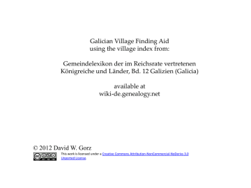 Galician Village Finding Aid using the village index from: Gemeindelexikon der im Reichsrate vertretenen Königreiche und Länder, Bd. 12 Galizien (Galicia) available at wiki-de.genealogy.net © 2012 David W. Gorz This work is licensed under a Creative Commons Attribution-NonCommercial-NoDerivs 3.0 Unported License. We’ll be discussing the Gemeindelexikon in a moment. The first place to look for your village is in the index for the Galicia map found on the Galizien German Descendants Society (GGDS) web site. If you find your village, the map co-ordinates given in the index will allow you to locate your village on the Galicia map, also available on the GGDS web site. In many cases the index will have the name of the parish that the village belonged to, which is necessary to find church records. If you don’t find your village in the Galicia map index, there’s an excellent chance that you’ll find it in Brian Lenius’ Genealogical Gazetteer of Galicia, if you have access to a copy. The gazetteer will give you additional information as to the administrative district and sub-districts, where the parishes were for the various denominations, maps to locate the village, and much more. Links are provided on the GGDS web site to Brian’s web site where the gazetteer can be purchased. For those who do not have access to a copy of Brian’s gazetteer, or who do not wish to purchase a copy at this time, the Gemeindelexikon, viewable on-line at wiki-de.genealogy.net, offers a good alternative. Look in the index of the Gemeindelexikon for your village and note the page number. You can, at this point, go to the indicated page in the Gemeindelexikon and get the district and sub-district, or you can use the table at the end of this document to find which administrative district and sub-district corresponds to the page number you found in the index. The district number (arbitrarily assigned) shown in the table will allow you to locate the district on the administrative district map included in this document. The table also tells you whether the district is now in Poland, Ukraine, or split between them. Minor parts of southern Galicia are now in Slovakia. Note that there is page overlap between the start and end of some districts and sub-districts, so check your page number carefully. The Gemeindelexikon will have more information on your village (in German). A guide to using the data in the Gemeindelexikon is given on halgal.com and a link to that web site also is given on the GGDS web site. It appears that the index for the Gemeindelexikon treats umlaut vowels as though they use the common two letter combination form, e.g., Königsau and Königsberg are found indexed as though the names were spelled Koenigsau and Koenigsberg. The administrative district map, below, shows the seventy-eight administrative districts used in the Gemeindelexikon, which match those listed on the web site of the Polish Genealogy Society of America. Note that Brian Lenius’ Genealogical Gazetteer of Galicia uses eighty-two administrative districts, which resulted from the splitting of four of the seventy-eight districts, along with other changes made to the district borders. Sub-districts that later became separate districts are shown in bold Italics in the table. Jewishgen.org and other web sites devoted to Jewish genealogy often use the seventy-three districts from the 1877 census. Brian’s district breakdown can be seen on Veit Olschinski’s web site. Another map in this document is the derived from the administrative district map. The district numbers have been removed for clarity and some of the major towns in Galicia are noted on the map. This should help you relate the location of your village’s district to the Galicia map found on the GGDS web site. And following that is a map of the administrative districts with the Lutheran parish boundaries sketched in, which should serve as a guide to determining which parish the administrative district was in. Note that some districts are split between parishes. The map on the next page, cropped from a map of Austria-Hungary (copyright expired; available from the Library of Congress web site) shows Galicia and Bukovina along with the scale bars from the original map. The reddish-brown squares running down the middle of the map are an approximation of the current border between Poland and Ukraine. Consult a modern map to better determine the current location of a village near the border. The GGDS web site has links to many maps. For a Ukrainian perspective on eastern Galicia, see John-Paul Himka’s Galicia and Bukovina : a research handbook about Western Ukraine, late 19th and 20th centuries, which can be found on www.ourroots.ca Himka’s book looks at the history of eastern Galicia from a Ukrainian point of view and talks about the culture of the region and has information on the Greek Catholic parishes. Additional references and sources are given in the document. Administrative districts alphabetically Biala 2 Kamionka Strumilowa 53 Ropczyce 23 Bobrka 50 Kolbuszowa 22 Rudki 44 Bochnia 11 Kolomea 68 Rzeszow 27 Bohorodczany 62 Kosów 70 Sambor 39 Borszczow 75 Krakau 4 Sanok 29 Brody 57 Krosno 25 Saybusch 3 Brzesko 12 Lancut 30 Skalat 72 Brzezany 59 Lemberg 49 Sniatyn 78 Brzozow 28 Limanowa 10 Sokal 47 Buczacz 66 Lisko 35 Stanislau 61 Chrzanow 1 Mielec 18 Stary Sambor 40 Cieszanow 36 Mosciska 38 Stryj 46 Czortkow 74 Myslenice 7 Strzyzow 24 Dabrowa 14 Nadworna 63 Tarnobrzeg 21 Dobromil 34 Neumarkt 8 Tarnopol 64 Dolina 52 Neusandez 13 Tarnow 15 Drohobycz 45 Nisko 26 Tlumacz 67 Gorlice 17 Peczenizyn 69 Trembowla 65 Grodek 43 Pilzno 19 Turka 41 Grybow 16 Podgorze 6 Wadowice 5 Horodenka 77 Podhajce 60 Wieliczka 9 Husiatyn 73 Przemysl 33 Zaleszczyki 76 Jaroslau 32 Przemyslany 54 Zbaraz 71 Jaslo 20 Przeworsk 31 Zloczow 58 Jaworow 37 Rawa Ruska 42 Zolkiew 48 Kalusz 56 Rohatyn 55 Zydaczow 51 Administrative districts numerically Chrzanow 1 Rzeszow 27 Kamionka Strumilowa 53 Biala 