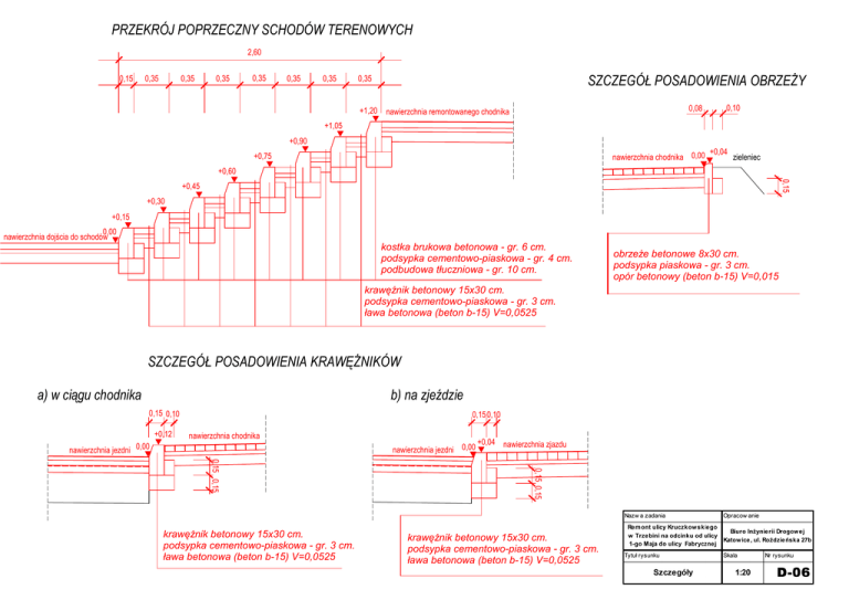 PRZEKRÓJ POPRZECZNY SCHODÓW TERENOWYCH 2,60 0,15 0,35 0,35 0,35 0,35 0,35 0,35 SZCZEGÓŁ POSADOWIENIA OBRZEśY 0,35 +1,20 0,08 nawierzchnia remontowanego chodnika 0,10 +1,05 +0,90 +0,04 nawierzchnia chodnika 0,00 zieleniec +0,75 +0,60 0,15 +0,45 +0,30 +0,15 0,00 nawierzchnia dojścia do schodów kostka brukowa betonowa - gr. 6 cm. podsypka cementowo-piaskowa - gr. 4 cm. podbudowa tłuczniowa - gr. 10 cm. krawęŜnik betonowy 15x30 cm. podsypka cementowo-piaskowa - gr. 3 cm. ława betonowa (beton b-15) V=0,0525 SZCZEGÓŁ POSADOWIENIA KRAWĘśNIKÓW a) w ciągu chodnika b) na zjeździe 0,15 0,10 +0,12 0,15 0,10 nawierzchnia chodnika nawierzchnia jezdni 0,00 nawierzchnia jezdni 0,00 0,15 0,15 0,15 0,15 krawęŜnik betonowy 15x30 cm. podsypka cementowo-piaskowa - gr. 3 cm. ława betonowa (beton b-15) V=0,0525 +0,04 nawierzchnia zjazdu krawęŜnik betonowy 15x30 cm. podsypka cementowo-piaskowa - gr. 3 cm. ława betonowa (beton b-15) V=0,0525 obrzeŜe betonowe 8x30 cm. podsypka piaskowa - gr. 3 cm. opór betonowy (beton b-15) V=0,015