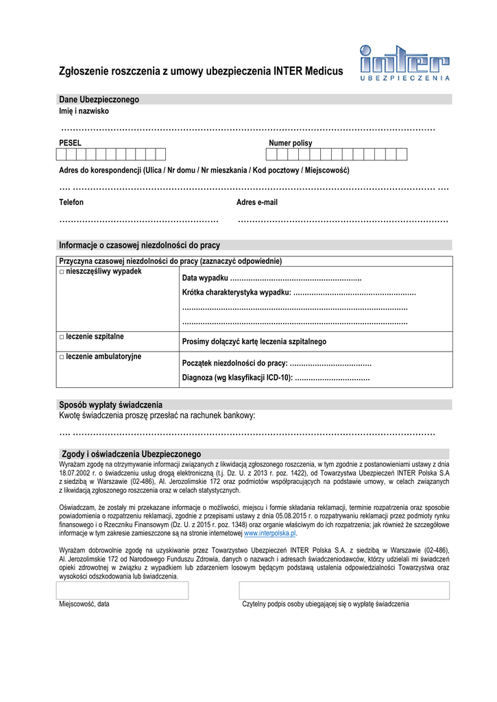 Zgłoszenie roszczenia z umowy ubezpieczenia INTER Medicus Dane Ubezpieczonego Imię i nazwisko ................................................................................................................................. PESEL Numer polisy Adres do korespondencji (Ulica / Nr domu / Nr mieszkania / Kod pocztowy / Miejscowość) .... ............................................................................................................................. .... Telefon Adres e-mail ........................................................ .......................................................................... Informacje o czasowej niezdolności do pracy Przyczyna czasowej niezdolności do pracy (zaznaczyć odpowiednie) □ nieszczęśliwy wypadek Data wypadku ……………………………………………….… Krótka charakterystyka wypadku: ……………………………………………… ……………………………………………………………………………………… ……………………………………………………………………………………… □ leczenie szpitalne □ leczenie ambulatoryjne Prosimy dołączyć kartę leczenia szpitalnego Początek niezdolności do pracy: ……………………………… Diagnoza (wg klasyfikacji ICD-10): …………………………… Sposób wypłaty świadczenia Kwotę świadczenia proszę przesłać na rachunek bankowy: .... ............................................................................................................................. Zgody i oświadczenia Ubezpieczonego Wyrażam zgodę na otrzymywanie informacji związanych z likwidacją zgłoszonego roszczenia, w tym zgodnie z postanowieniami ustawy z dnia 18.07.2002 r. o świadczeniu usług drogą elektroniczną (t.j. Dz. U. z 2013 r. poz. 1422), od Towarzystwa Ubezpieczeń INTER Polska S.A z siedzibą w Warszawie (02-486), Al. Jerozolimskie 172 oraz podmiotów współpracujących na podstawie umowy, w celach związanych z likwidacją zgłoszonego roszczenia oraz w celach statystycznych. Oświadczam, że zostały mi przekazane informacje o możliwości, miejscu i formie składania reklamacji, terminie rozpatrzenia oraz sposobie powiadomienia o rozpatrzeniu reklamacji, zgodnie z przepisami ustawy z dnia 05.08.2015 r. o rozpatrywaniu reklamacji przez podmioty rynku finansowego i o Rzeczniku Finansowym (Dz. U. z 2015 r. poz. 1348) oraz organie właściwym do ich rozpatrzenia; jak również że szczegółowe informacje w tym zakresie zamieszczone są na stronie internetowej www.interpolska.pl. Wyrażam dobrowolnie zgodę na uzyskiwanie przez Towarzystwo Ubezpieczeń INTER Polska S.A. z siedzibą w Warszawie (02-486), Al. Jerozolimskie 172 od Narodowego Funduszu Zdrowia, danych o nazwach i adresach świadczeniodawców, którzy udzielali mi świadczeń opieki zdrowotnej w związku z wypadkiem lub zdarzeniem losowym będącym podstawą ustalenia odpowiedzialności Towarzystwa oraz wysokości odszkodowania lub świadczenia. Miejscowość, data Czytelny podpis osoby ubiegającej się o wypłatę świadczenia Do prawidłowo wypełnionego formularza zgłoszenia roszczenia prosimy dołączyć: a) orzeczenie lekarskie na druku ZLA lub jeśli wystawienie na druku ZLA nie jest możliwe - inne orzeczenie lekarskie stwierdzające czasową niezdolność do pracy, długość trwania oraz jej przyczynę/diagnozę zgodnie z aktualnie obowiązującą Międzynarodową klasyfikacją chorób i problemów zdrowotnych ICD-10, b) dokumenty potwierdzające wykonywanie działalności zarobkowej, tj. kopię wpisu do ewidencji działalności gospodarczej lub kopię kontraktu menadżerskiego, c) w przypadku nieszczęśliwego wypadku - kopię karty informacyjnej leczenia szpitalnego lub kopię karty wypisu ze szpitala, kopie wyników badań diagnostycznych, opinie lekarskie i inne dokumenty stwierdzające zakres udzielonej pomocy medycznej oraz określające dokładną diagnozę (zgodnie z aktualnie obowiązującą Międzynarodową klasyfikacją chorób i problemów zdrowotnych ICD-10), przyczynę oraz datę zajścia nieszczęśliwego wypadku, d) w przypadku leczenia szpitalnego - kopię karty informacyjnej leczenia szpitalnego lub kopię karty wypisu ze szpitala z określeniem diagnozy, e) kopię dokumentów potwierdzających wysokość przychodu Ubezpieczonego, np. kopię książki przychodów, formularz PIT, zaświadczenie o zarobkach. INTER Polska zastrzega sobie prawo do wystąpienia z prośbą o udzielenie dodatkowych informacji koniecznych do stwierdzenia zaistnienia zdarzenia ubezpieczeniowego lub obowiązku realizacji świadczeń przez INTER Polska. Korespondencję prosimy kierować na adres: TU INTER Polska S.A. Biuro Ubezpieczeń Zdrowotnych Al. Jerozolimskie 172 02-486 Warszawa