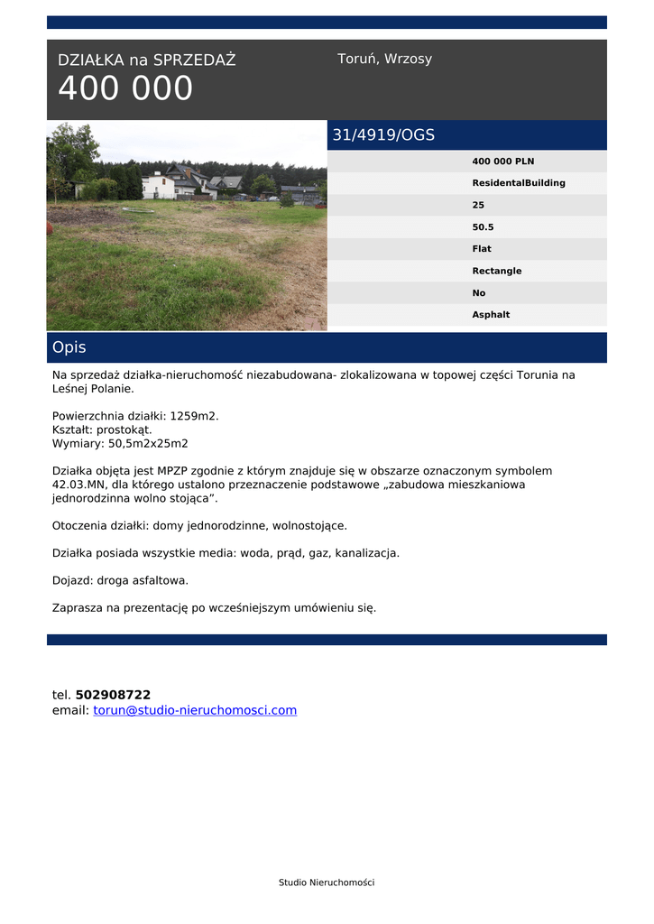 DZIAŁKA na SPRZEDAŻ 31/4919/OGS Opis
