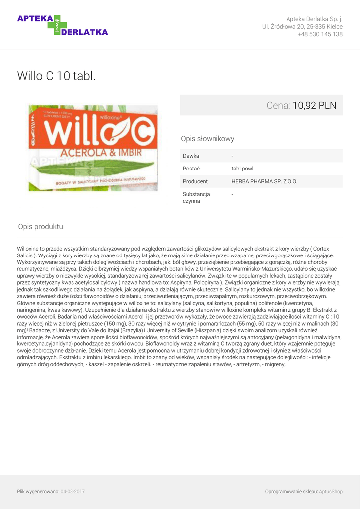 Apteka Derlatka Sp. j. Ul. Źródłowa 20, 25-335 Kielce +48 530 145 138 Willo C 10 tabl. Cena: 10,92 PLN Opis słownikowy Dawka - Postać tabl.powl. Producent HERBA PHARMA SP. Z O.O. Substancja czynna - Opis produktu Willoxine to przede wszystkim standaryzowany pod względem zawartości glikozydów salicylowych ekstrakt z kory wierzby ( Cortex Salicis ). Wyciągi z kory wierzby są znane od tysięcy lat jako, że mają silne działanie przeciwzapalne, przeciwgorączkowe i ściągające. Wykorzystywane są przy takich dolegliwościach i chorobach, jak: ból głowy, przeziębienie przebiegające z gorączką, różne choroby reumatyczne, miażdżyca. Dzięki olbrzymiej wiedzy wspaniałych botaników z Uniwersytetu Warmińsko-Mazurskiego, udało się uzyskać uprawy wierzby o niezwykle wysokiej, standaryzowanej zawartości salicylanów. Związki te w popularnych lekach, zastąpione zostały przez syntetyczny kwas acetylosalicylowy ( nazwa handlowa to: Aspiryna, Polopiryna ). Związki organiczne z kory wierzby nie wywierają jednak tak szkodliwego działania na żołądek, jak aspiryna, a działają równie skutecznie. Salicylany to jednak nie wszystko, bo willoxine zawiera również duże ilości flawonoidów o działaniu; przeciwutleniającym, przeciwzapalnym, rozkurczowym, przeciwobrzękowym. Główne substancje organiczne występujące w willoxine to: salicylany (salicyna, salikortyna, populina) polifenole (kwercetyna, naringenina, kwas kawowy). Uzupełnienie dla działania ekstraktu z wierzby stanowi w willoxine kompleks witamin z grupy B. Ekstrakt z owoców Aceroli. Badania nad właściwościami Aceroli i jej przetworów wykazały, że owoce zawierają zadziwiające ilości witaminy C : 10 razy więcej niż w zielonej pietruszce (150 mg), 30 razy więcej niż w cytrynie i pomarańczach (55 mg), 50 razy więcej niż w malinach (30 mg)! Badacze, z University do Vale do Itajaí (Brazylia) i University of Seville (Hiszpania) dzięki swoim analizom uzyskali również informację, że Acerola zawiera spore ilości bioflawonoidów, spośród których najważniejszymi są antocyjany (pelargonidyna i malwidyna, kwercetyna,cyjanidyna) pochodzące ze skórki owocu. Bioflawonoidy wraz z witaminą C tworzą zgrany duet, który wzajemnie potęguje swoje dobroczynne działanie. Dzięki temu Acerola jest pomocna w utrzymaniu dobrej kondycji zdrowotnej i słynie z właściwości odmładzających. Ekstraktu z imbiru lekarskiego. Imbir to znany od wieków, wspaniały środek na następujące dolegliwości: - infekcje górnych dróg oddechowych, - kaszel - zapalenie oskrzeli. - reumatyczne zapaleniu stawów, - artretyzm, - migreny, Plik wygenerowano: 04-03-2017 Powered by TCPDF (www.tcpdf.org) Oprogramowanie sklepu: AptusShop