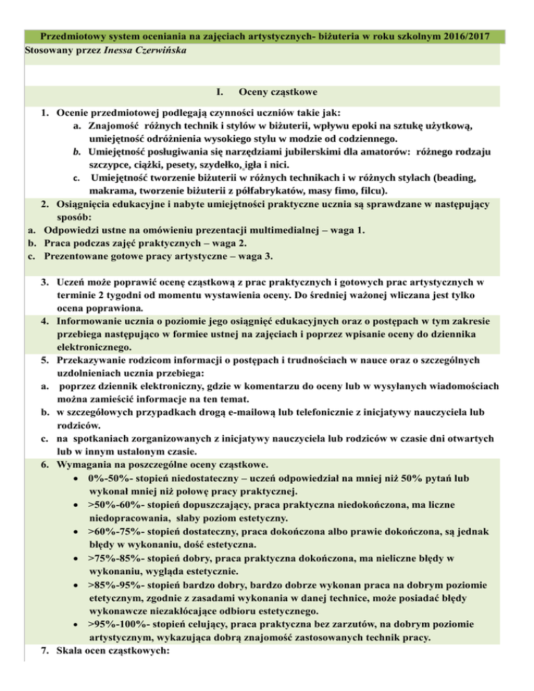 Przedmiotowy system oceniania na zajęciach artystycznych- biżuteria w roku szkolnym 2016/2017 Stosowany przez Inessa Czerwińska I. Oceny cząstkowe 1. Ocenie przedmiotowej podlegają czynności uczniów takie jak: a. Znajomość różnych technik i stylów w biżuterii, wpływu epoki na sztukę użytkową, umiejętność odróżnienia wysokiego stylu w modzie od codziennego. b. Umiejętność posługiwania się narzędziami jubilerskimi dla amatorów: różnego rodzaju szczypce, ciążki, pesety, szydełko, igła i nici. c. Umiejętność tworzenie biżuterii w różnych technikach i w różnych stylach (beading, makrama, tworzenie biżuterii z półfabrykatów, masy fimo, filcu). 2. Osiągnięcia edukacyjne i nabyte umiejętności praktyczne ucznia są sprawdzane w następujący sposób: a. Odpowiedzi ustne na omówieniu prezentacji multimedialnej – waga 1. b. Praca podczas zajęć praktycznych – waga 2. c. Prezentowane gotowe pracy artystyczne – waga 3. 3. Uczeń może poprawić ocenę cząstkową z prac praktycznych i gotowych prac artystycznych w terminie 2 tygodni od momentu wystawienia oceny. Do średniej ważonej wliczana jest tylko ocena poprawiona. 4. Informowanie ucznia o poziomie jego osiągnięć edukacyjnych oraz o postępach w tym zakresie przebiega następująco w formiee ustnej na zajęciach i poprzez wpisanie oceny do dziennika elektronicznego. 5. Przekazywanie rodzicom informacji o postępach i trudnościach w nauce oraz o szczególnych uzdolnieniach ucznia przebiega: a. poprzez dziennik elektroniczny, gdzie w komentarzu do oceny lub w wysyłanych wiadomościach można zamieścić informacje na ten temat. b. w szczegółowych przypadkach drogą e-mailową lub telefonicznie z inicjatywy nauczyciela lub rodziców. c. na spotkaniach zorganizowanych z inicjatywy nauczyciela lub rodziców w czasie dni otwartych lub w innym ustalonym czasie. 6. Wymagania na poszczególne oceny cząstkowe. 0%-50%- stopień niedostateczny – uczeń odpowiedział na mniej niż 50% pytań lub wykonał mniej niż połowę pracy praktycznej. >50%-60%- stopień dopuszczający, praca praktyczna niedokończona, ma liczne niedopracowania, słaby poziom estetyczny. >60%-75%- stopień dostateczny, praca dokończona albo prawie dokończona, są jednak błędy w wykonaniu, dość estetyczna. >75%-85%- stopień dobry, praca praktyczna dokończona, ma nieliczne błędy w wykonaniu, wygląda estetycznie. >85%-95%- stopień bardzo dobry, bardzo dobrze wykonan praca na dobrym poziomie etetycznym, zgodnie z zasadami wykonania w danej technice, może posiadać błędy wykonawcze niezakłócające odbioru estetycznego. >95%-100%- stopień celujący, praca praktyczna bez zarzutów, na dobrym poziomie artystycznym, wykazująca dobrą znajomość zastosowanych technik pracy. 7. Skala ocen cząstkowych: stopień Wartość do średniej Celujący Celujący z minusem Bardzo dobry z plusem Bardzo dobry Bardzo dobry z minusem Dobry z plusem Dobry Dobry z minusem Dostateczny z plusem Dostateczny Dostateczny z minusem Dopuszczający z plusem Dopuszczający Dopuszczający z minusem Niedostateczny 6 5,75 5,5 5 4,75 4,5 4 3,75 3,5 3 2,75 2,5 2 1,75 1 II. Prace ucznia 1. W razie nieobecności w dniu przedstawiania lub wykonywania danej pracy uczeń musi wywiązać się z tego zadania w ustalonym z nauczycielem terminie nie później niż w ciągu dwóch tygodni po ustaniu nieobecności. 2. Uczeń zatrzymuje dla siebie wszystkie wykonane i ocenione prace praktyczne, jeśli są wykonane z materiałów zakupionych przez ucznia, zgodnie z terminami zawartymi w Statucie ZS 54. Uczeń jest zobowiązany do przechowywania ich do dnia, w którym mija roczny termin zgłaszania zastrzeżeń rodziców, jeżeli stwierdzą, uznają, że roczna ocena klasyfikacyjna z zajęć edukacyjnych została ustalona niezgodnie z przepisami dotyczącymi trybu ustalania tych ocen. Jeżeli uczeń korzystał z cudzych materiałów, to musi uzgodnić z właścicielem materiałów formę rozliczenia, tym nie mniej musi mieć zdjęcie wykonanej pracy w celu udostępnia rodzicom i przechowywania tego zdjęcia do dnia, w którym mija roczny termin zgłaszania zastrzeżeń rodziców. 3. Uczeń przechowujący swoje prace udostępnia je swoim rodzicom. III. Nieprzygotowania 1. W przypadku zdarzeń losowych uczeń ma prawo jeden raz w trymestrze skorzystać z tzw. nieprzygotowania bez wyjaśniania jego powodów. 2. W przypadkach losowych rodzice mogą wielokrotnie korzystać z prawa pisemnego zgłoszenia w dzienniczku informacji o nieprzygotowaniu dziecka z podaniem powodu i terminem nadrobienia, którego rodzic zobowiązuje się dopilnować. 3. Nieprzygotowania zgłasza się przy stoliku nauczyciela pisemnie bezpośrednio po wejściu do klasy. IV. Oceny klasyfikacyjne 1. Podstawą wystawienia oceny klasyfikacyjnej jest wskazana w dzienniku elektronicznym średnia ważona z ocen: w przypadku oceny trymestralnej- z danego trymestru; w przypadku oceny końcoworocznej lub końcowej – z całego roku. 2. Propozycję oceny klasyfikacyjnej wystawia się wg poniższej skali: Ocena klasyfikacyjna Średnia ważona Celujący 5,66-6 Bardzo dobry 4,66-5,65 Dobry 3,66-4,65 Dostateczny 2, 66-3,65 Dopuszczający 1, 66-2,65 Niedostateczny 1-1,65 *Możliwe jest wystawienie oceny celującej przy średniej niższej niż wskazana, jeżeli uczeń: a. jest laureatem konkursu artystycznego i wystawiał na konkurs swoją pracę biżuteryjną; b. dba o swój rozwój przedmiotowy, realizując zadania dodatkowe praktyczne lub teoretyczne co najmniej dwukrotnie w każdym trymestrze. 3. O niższą niż celująca, ale wyższą o jeden stopień niż przewidywana trymestralną/ końcoworoczną/ końcową ocenę klasyfikacyjną może wystąpić do nauczyciela uczeń spełniający wszystkie poniższe warunki: a. wykonał w trymestrze wszystkie obowiązkowe zadania; b. systematycznie korzystał z możliwości poprawiania ocen; c. przechowuje wszystkie sprawdzone i ocenione swoje prace prakt