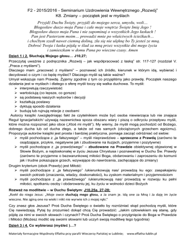 F2 - 2015/2016 - Seminarium Uzdrowienia Wewnętrznego „Rozwój” K8. Zmiany – początek jest w myślach Przyjdź Duchu Święty, przyjdź do mojego serca, umysłu, woli… Błogosław duszo moja Pana i całe moje wnętrze Święte Imię Jego ! Błogosław duszo moja Pana i nie zapominaj o wszystkich Jego łaskach ! Pan jest Pasterzem moim… prowadzi mnie po właściwych ścieżkach… i choćbym szedł nawet ciemną doliną, zła się nie ulęknę bo Ty jesteś ze mną. Dobroć Twoja i łaska pójdą w ślad za mną przez wszystkie dni mego życia i zamieszkam w domu Pana po wieczne czasy. Amen Dzień 1 i 2. Słuchają Mojego głosu… J10,27; Przeczytaj uważnie z podręcznika „Rozwój – jak współpracować z łaską” str. 117-127 (rozdział V. „Praca z myślami”). Dlaczego mam „pracować z myślami” – poznawać ich źródło, kierunek w którym idą, wybierać i decydować o czym i co będę myśleć? Dlaczego myśli są takie ważne? Umysł wskazuje nam Prawdę. Żyjemy zgodnie z tym co przyjęliśmy jako prawdę. Początek naszego działania jest w myślach i dlatego o sferę myśli toczy się walka duchowa. To myśli: interpretują rzeczywistość wartościują (co lepsze, co gorsze) są podstawą naszych wyborów i decyzji kształtują postawy dyktują sposób działania budują lub rujnują relacje z osobami Autorzy książki /uwzględniając fakt że czytelnikiem może być osoba niewierząca lub nie znająca Reguł Ignacjańskich/ używają nazewnictwa spoza obszaru wiary i piszą o odkryciu przepływu myśli, które można rozpoznać jako obce („Ktoś mi myśli”). My wiemy, że myśli mogą pochodzić od Bożego, dobrego ducha lub od ducha złego, a także od nas samych (obciążonych grzechem egoizmu). Propozycja autorów książki jest prosta i bardziej praktyczna, pomaga zacząć odróżniać od siebie: myśli pochodzące z „ja fałszywego” – myśli nieprawdziwe – sprzeczne z Prawdą (zarówno te osądzające, przykre, negatywne jak i zbudowane na iluzjach, przyjemne i pozytywne) myśli pochodzące z „ja prawdziwego” – zbudowane na Prawdzie obiektywnej objawionej w Słowie Bożym, a najdoskonalej w życiu Jezusa Chrystusa i poznawalnej w Duchu Św. Prawdy (zarówno te przyjemne o bezwarunkowej miłości Boga, obdarowaniu i zaproszeniu do komunii jak i trudne pokazujące grzech, wzywające do nawrócenia, zachęcające do zmiany) Drugim kryterium (obok Prawdy) jest Miłość: myśli pochodzące z „ja fałszywego” /ukierunkowują nas/ prowadzą ku ego: zaspakajaniu swoich potrzeb (znaczenia, władzy, doskonałości), ku zyskom materialnym i przyjemnościom myśli pochodzące z „ja prawdziwego” /ukierunkowują nas/ prowadzą w rozwoju ku pełni miłości, spotkaniu osoby i obdarowaniu jej, ku życiu w wolności dzieci Bożych Rozważ na modlitwie – w Duchu Świętym: J10,25a. 27-28; „Rzekł do niego Jezus: „Moje owce słuchają mego głosu, a Ja znam je. Idą one za Mną i Ja daję im życie wieczne. Nie zginą one na wieki i nikt nie wyrwie ich z mojej ręki.” Czy znasz głos Jezusa? Proś Ducha Świętego o światło by rozróżniać skąd pochodzą myśli, które Cię nawiedzają. Pytaj by zrozumieć dokąd chcą Cię prowadzić: „Jakim człowiekiem się stanę, gdy pójdę za nimi w swoich słowach i czynach? Proś Ducha Świętego o przylgnięcie do Boga w Prawdzie i Miłości (Możesz modlić się swoimi słowami lub uczyń swoją modlitwę tego tygodnia) Dzień 3 i 4. Co wybierasz (myśleć )…? Materiały formacyjne Wspólnoty Effatha przy parafii Wieczerzy Pańskiej w Lublinie; www.effatha-lublin.pl „Niemal każdy, komu proponujemy radykalne odcięcie się od fałszywego myślenia, wykazuje na początku opór, jakby mu było żal zostawić coś cennego, nawet jeśli intelektualnie zgadza się z tym, że jego myślenie jest błędne i hamuje go w rozwoju.” (str121) Prawda jest taka, że „stary człowiek” nie chce zmian bo dostosował się do bagna grzechu. Wezwanie do nowego życia oznacza wysiłek: poznawanie prawdy, wybór i decyzje oraz praktyczne ćwiczenie się w odnawianiu swojego umysłu. Praktyczne wskazówki – o czym warto pamiętać: 1. Definiuje nas dobro (jest bytem) a nie zło (to brak dobra) 2. Żyjemy tu i teraz – unikać oderwania od rzeczywistości (spiętrzenia wyobraźni: rozpamiętywanie przeszłości lub marzenia o przyszłości) 3. Wybrać dialog wewnętrzny z Bogiem (modlitwa nieustanna, zawierzanie mu tego czym żyję) zamiast rozpamiętywania krzywd i dialogu ze złym duchem (który drażni i pobudza do sporu lub napompowywania swojego ego) 4. Odróżniać myślenie pozytywne nieprawdziwe (oparte na iluzjach i życzeniowych mantrach) od myślenia pozytywnego prawdziwego opartego na obietnicach Boga (nadziei chrześcijańskiej) Rozważ na modlitwie – w Duchu Świętym: Rz12,2; „(2) Nie bierzcie więc wzoru z tego świata, lecz przemieniajcie się przez odnawianie umysłu, abyście umieli rozpoznać, jaka jest wola Boża: co jest dobre, co Bogu przyjemne i co doskonałe.” Istnieje pierwszy wybór – opcja fundamentalna – decyzja pójścia za Jezusem, który jest Prawdą i Miłością ucieleśnioną, Bogiem wcielonym. Każdy następny wybór potwierdza ten pierwszy – także w sferze myślenia, (mowy, działania, postawy) chodzi o naśladowanie Pana. Gdy wybierasz – mów wyraźnie czego chcesz, wydobywając te elementy, które istotnie akceptuje wola. To bardzo ważne! Definiuje nas to, co wybieramy a nie to co nam się udaje. Czy decydujesz się odrzucać myśli złorzeczące innym, pochlebiające Tobie albo porównywanie się z innymi, zazdrosne lub wyniosłe? Czy wybierasz prawdę w miłości i miłość w prawdzie? Czy tego chcesz? Proś Ducha Świętego o światło by rozróżniać skąd pochodzą myśli, o moc do odrzucania tego co fałszywe i wybierania natchnień Bożych. Proś Ducha Świętego o przylgnięcie do Boga w Prawdzie i Miłości (Możesz modlić 