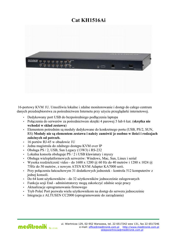 Cat KH1516Ai 16-portowy KVM 1U. Umożliwia lokalne i zdalne monitorowanie i dostęp do całego centrum danych przedsiębiorstwa za pośrednictwem Internetu przy użyciu przeglądarki internetowej. • • • • • • • • • • • • • • • Dedykowany port USB do bezpośredniego podłączenia laptopa Połączenia do serwerów za pośrednictwem skrętki 4 parowej 5 lub 6 kat. (skrętka nie wchodzi w skład zestawu) Elementem pośrednim są moduły dedykowane do konkretnego portu (USB, PS/2, SUN, RS) Moduły nie są elementem zestawu i należy zamówić je osobno w ilości i rodzajach zależnych od potrzeb. 16 portów RJ-45 w obudowie 1U Jedna magistrala do zdalnego dostępu KVM over IP Obsługa PS / 2, USB, Sun Legacy (13W3) i RS-232 Lokalna konsola obsługuje PS / 2 i USB klawiatury i myszy Obsługa wieloplatformowych serwerów: Windows, Mac, Sun, Linux i serial Wysoka rozdzielczość video - do 1600 x 1200 @ 60 Hz do 40 metrów i 1280 x 1024 @ 75Hz do 50 metrów, z nowym ATEN KVM Adapter KA7000 serii. Przy połączeniu łańcuchowym 31 dodatkowych jednostek - kontrola 512 komputerów z jednej konsoli. Do 64 kont użytkowników - do 32 użytkowników jednocześnie zalogowanych Funkcja sesji End - administratorzy mogą zakończyć zdalnie sesje pracy Aktualizacje oprogramowania firmowego Tryb Poleć Port pozwala wielu użytkownikom na dostęp do serwera jednocześnie Integracja z ALTUSEN CC2000 (oprogramowanie do zarządzania) ul. Wiertnicza 129, 02-952 Warszawa, tel. 22 6517242 wew 131, fax 22 6517246 e-mail: [email protected] http://www.meditronik.com.pl [email protected] • • • • • • • • • • • • • • • • • Jednolity wielojęzyczny interfejs Multiplatform obsługi klienta (Windows, Mac OS X, Linux, Sun) Multi-wsparcie przeglądarki (IE, Mozilla, Firefox, Safari, Opera, Netscape) Oparty na przeglądarce interfejs użytkownika w czystej technologii Web umożliwia administratorom wykonywanie zadań administracyjnych bez konieczności instalowania Javy Użytkownik może uruchomić wiele wirtualnych pulpitów zdalnych kontroli wielu połączonych serwerów z tej samej sesji logowania Tryb Panel Array Obsługa zdalnego uwierzytelniania: RADIUS, LDAP, LDAPS i MS Active Directory Zaawansowane funkcje bezpieczeństwa z ochroną hasłem oraz zaawansowanymi technologiami szyfrowania - 1024 bit RSA, 56 bit DES, 256 bit AES oraz 128 bit SSL Elastyczna konstrukcja szyfrowania pozwala użytkownikowi na wybór dowolnej kombinacji 56 - bit DES, 168-bit 3DES 256-bit AES, 128-bitowe RC4 lub Losowe niezależnych KB / Mouse, wideo i wirtualnych mediów Wsparcie dla IP / MAC Filter Konfigurowalne uprawnienia użytkowników i grup dla dostępu do serwera Jakość obrazu i tolerancji wideo można regulować w celu optymalizacji prędkości transferu danych, monochromatycznych kolorów ustawienie progu i hałasu ustawienia dla kompresji danych w sytuacjach słabego łącza Pełny ekran lub skalowalne wyświetlanie wideo Forum do komunikacji między użytkownikami zdalnymi Mouse DynaSync ™ - automatycznie synchronizuje lokalne i zdalne ruchy myszy Klawiatura ekranowa z obsługą wielu języków Port RJ-45 PON do podłączenia dedykowanej listwy zasilającej kontrolowanej przez sieć ul. Wiertnicza 129, 02-952 Warszawa, tel. 22 6517242 wew 131, fax 22 6517246 e-mail: [email protected] http://www.meditronik.com.pl [email protected] Przyłącza komputerowe Bezpośredni 16 Daisy Chain lub kaskadowe 512 Wybór portu OSD / Skrót / Przycisk Złącza Klawiatura 1 x 6-pin Mini-DIN Female / 1 x USB typu A żeńskie Mysz 1 x 6-pin Mini-DIN Female / 1 x USB typu A żeńskie Wyjście wideo AC Wloty zasilania 1 x HDB-15 Female 1 x 3-bolcowe gniazda AC LAN 1 x RJ-45 Female Moc 1 x 3-bolcowe gniazda AC PON 1 x RJ-45 Female ul. Wiertnicza 129, 02-952 Warszawa, tel. 22 6517242 wew 131, fax 22 6517246 e-mail: [email protected] http://www.meditronik.com.pl [email protected] USB 1 x USB Mini typu B Kobieta [VNC konsoli] Połączenia KVM Side Klawiatura, Video, Mysz 16 x RJ-45 Female Daisy Chain 1 x DB-25 Male Przełączniki Moc 1 x Rocker Wybór portu 16 x Przycisk Resetuj 1 x Semi wbudowania Przycisk Diody LED Power On 1 (Blue) On Line 16 (zielony) Wybrany 16 (Orange) Station ID 1 x 2-cyfrowy 7-segmentowy (Orange) Łącze 10/100 Mbps 1 (pomarańczowy / zielony) Wydajność wideo Lokalny 1600 x 1200 @ 60Hz (40m; 1280 x 1024 @ 75Hz Zdalny 1600 x 1200 @ 60Hz Interwał skanowania 1a € "255 sekund Moc Napięcie 100a € "240 V AC, 50/60Hz Wzmacniacze 1 Pobór mocy @ 120VAC - 12.5W - 43 BTU / h Właściwości fizyczne Waga urządzenia 6,2 kg Wymiary jednostki 17.2x 6.3x 1,7 cala Waga urządzenia z pakietem 9,0 kg Wymiary opakowania jednostki 21.2x 9.5x 4,5 cala ul. Wiertnicza 129, 02-952 Warszawa, tel. 22 6517242 wew 131, fax 22 6517246 e-mail: [email protected] http://www.meditronik.com.pl [email protected]