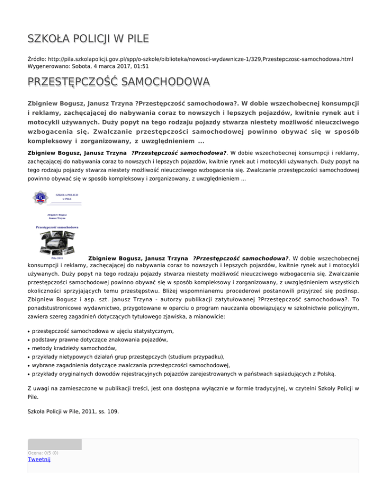 SZKOŁA POLICJI W PILE Źródło: http://pila.szkolapolicji.gov.pl/spp/o-szkole/biblioteka/nowosci-wydawnicze-1/329,Przestepczosc-samochodowa.html Wygenerowano: Sobota, 4 marca 2017, 01:51 PRZESTĘPCZOŚĆ SAMOCHODOWA Zbigniew Bogusz, Janusz Trzyna ?Przestępczość samochodowa?. W dobie wszechobecnej konsumpcji i reklamy, zachęcającej do nabywania coraz to nowszych i lepszych pojazdów, kwitnie rynek aut i motocykli używanych. Duży popyt na tego rodzaju pojazdy stwarza niestety możliwość nieuczciwego wzbogacenia się. Zwalczanie przestępczości samochodowej powinno obywać się w sposób kompleksowy i zorganizowany, z uwzględnieniem ... Zbigniew Bogusz, Janusz Trzyna ?Przestępczość samochodowa?. W dobie wszechobecnej konsumpcji i reklamy, zachęcającej do nabywania coraz to nowszych i lepszych pojazdów, kwitnie rynek aut i motocykli używanych. Duży popyt na tego rodzaju pojazdy stwarza niestety możliwość nieuczciwego wzbogacenia się. Zwalczanie przestępczości samochodowej powinno obywać się w sposób kompleksowy i zorganizowany, z uwzględnieniem ... Zbigniew Bogusz, Janusz Trzyna ?Przestępczość samochodowa?. W dobie wszechobecnej konsumpcji i reklamy, zachęcającej do nabywania coraz to nowszych i lepszych pojazdów, kwitnie rynek aut i motocykli używanych. Duży popyt na tego rodzaju pojazdy stwarza niestety możliwość nieuczciwego wzbogacenia się. Zwalczanie przestępczości samochodowej powinno obywać się w sposób kompleksowy i zorganizowany, z uwzględnieniem wszystkich okoliczności sprzyjających temu przestępstwu. Bliżej wspomnianemu procederowi postanowili przyjrzeć się podinsp. Zbigniew Bogusz i asp. szt. Janusz Trzyna - autorzy publikacji zatytułowanej ?Przestępczość samochodowa?. To ponadstustronicowe wydawnictwo, przygotowane w oparciu o program nauczania obowiązujący w szkolnictwie policyjnym, zawiera szereg zagadnień dotyczących tytułowego zjawiska, a mianowicie: ● przestępczość samochodowa w ujęciu statystycznym, ● podstawy prawne dotyczące znakowania pojazdów, ● metody kradzieży samochodów, ● przykłady nietypowych działań grup przestępczych (studium przypadku), ● wybrane zagadnienia dotyczące zwalczania przestępczości samochodowej, ● przykłady oryginalnych dowodów rejestracyjnych pojazdów zarejestrowanych w państwach sąsiadujących z Polską. Z uwagi na zamieszczone w publikacji treści, jest ona dostępna wyłącznie w formie tradycyjnej, w czytelni Szkoły Policji w Pile. Szkoła Policji w Pile, 2011, ss. 109. Ocena: 0/5 (0) Tweetnij