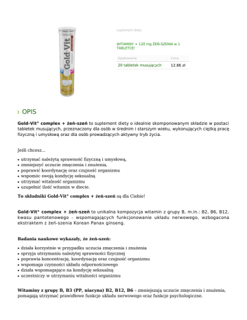 suplement diety WITAMINY + 120 mg ŻEŃ-SZENIA w 1 TABLETCE! Opakowanie Cena 20 tabletek musujących 12.86 zł OPIS Gold-Vit® complex + żeń-szeń to suplement diety o idealnie skomponowanym składzie w postaci tabletek musujących, przeznaczony dla osób w średnim i starszym wieku, wykonujących ciężką pracę fizyczną i umysłową oraz dla osób prowadzących aktywny tryb życia. Jeśli chcesz... ● ● ● ● ● ● utrzymać należytą sprawność fizyczną i umysłową, zmniejszyć uczucie zmęczenia i znużenia, poprawić koordynację oraz czujność organizmu wspomóc swoją kondycję seksualną utrzymać witalność organizmu uzupełnić ilość witamin w diecie. To składniki Gold-Vit® complex + żeń-szeń są dla Ciebie! Gold-Vit® complex + żeń-szeń to unikalna kompozycja witamin z grupy B, m.in.: B2, B6, B12, kwasu pantotenowego - wspomagających funkcjonowanie układu nerwowego, wzbogacona ekstraktem z żeń-szenia Korean Panax ginseng. Badania naukowe wykazały, że żeń-szeń: ● ● ● ● ● ● działa korzystnie w przypadku uczucia zmęczenia i znużenia sprzyja utrzymaniu należytej sprawności fizycznej poprawia koncentrację, koordynację oraz czujność organizmu wspomaga czynności układu odpornościowego działa wspomagająco na kondycję seksualną uczestniczy w utrzymaniu witalności organizmu Witaminy z grupy B, B3 (PP, niacyna) B2, B12, B6 – zmniejszają uczucie zmęczenia i znużenia, pomagają utrzymać prawidłowe funkcje układu nerwowego oraz funkcje psychologiczne. Przyczyniają się także do utrzymania prawidłowego metabolizmu energetycznego. Witamina B1 (tiamina) - pomaga utrzymać prawidłowe funkcje układu nerwowego oraz funkcje psychologiczne. Przyczynia się także do utrzymania prawidłowego metabolizmu energetycznego. Korzystnie wpływa na serce. B1 – pomaga w prawidłowym funkcjonowaniu serca. B5 – (kwas pantotenowy) pomaga w utrzymaniu sprawności umysłowej na prawidłowym poziomie. Kwas foliowy – pomaga w prawidłowej produkcji krwi oraz przyczynia się do zmniejszenia uczucia zmęczenia i znużenia, ma pozytywny wpływ na funkcjonowanie układu odpornościowego, pomaga w zachowaniu funkcji psychologicznych. Biotyna – przyczynia się do prawidłowego metabolizmu makroskładników odżywczych, wspiera funkcjonowanie układu nerwowego i funkcji psychologicznych. SKŁAD Informacja żywieniowa 1 tabletka *% RWS Witamina A (RE) 800 µg 100% Witamina C 80 mg 100% Witamina D 5 µg 100% Witamina E (á-TE) 12 mg 100% Witamina B1 1,1 mg 100% Niacyna (NE) 16 mg 100% Biotyna 50 µg 100% Kwas foliowy 200 µg 100% Kwas pantotenowy 9 mg 150% Witamina B2 2,1 mg 150% Witamina B6 2,1 mg 150% Witamina B12 3,75 µg 150% Żeń-szeń koreański (Korean Panax ginseng) 120 mg - *RWS - referencyjna wartość spożycia. Składniki: regulator kwasowości – kwas cytrynowy, substancja wypełniająca – sorbitol, regulator kwasowości - węglany sodu, witaminy (kwas L-askorbinowy – wit. C, octan DL-alfa-tokoferylu – wit. E, amid kwasu nikotynowego – niacyna, octan retinylu – wit. A, D-pantotenian wapnia – kwas pantotenowy, D-biotyna – biotyna, cyjanokobalamina – wit. B12, cholekalcyferol – wit. D, kwas pteroilomonoglutaminowy – folian, chlorowodorek pirydoksyny – wit B6, ryboflawina – wit. B2, monoazotan tiaminy – wit. B1); aromaty, ekstrakt żeń-szenia koreańskiego (Korean Panax ginseng), substancje słodzące – cyklaminian sodu, sukraloza, acesulfam K; nośnik (substancji słodzącej) – glikol polietylenowy, barwnik – beta-karoten (dla smaku pomarańczowego), ryboflawina (dla smaku cytrynowego). Preparat zawiera substancje słodzące. PRZEZNACZENIE Preparat przeznaczony: jako suplement diety dla osób dążących do utrzymania należytej sprawności fizycznej i umysłowej oraz do zmniejszenia uczucia zmęczenia i znużenia, a także jako uzupełnienie witamin w diecie. Szczególnie polecany osobom w średnim i podeszłym wieku, wykonującym ciężką pracę fizyczną i umysłową oraz sportowcom. DAWKOWANIE Zalecana dzienna porcja: 1 tabletkę, rozpuścić w 200 ml wody. Najlepiej smakuje schłodzony. Nie należy przekraczać zalecanej porcji do spożycia w ciągu dnia. Suplement diety nie może być stosowany jako substytut zróżnicowanej diety. Zalecany jest zrównoważony sposób żywienia i zdrowy tryb życia. Uwaga: preparat nie wskazany w okresie ciąży i karmienia piersią lub nadwrażliwości na którykolwiek ze składników preparatu. W przypadku nadciśnienia lub przyjmowania leków w tym także leków bez recepty, m.in.: aspiryna, stosowanie preparatu zaleca się skonsultować z lekarzem.