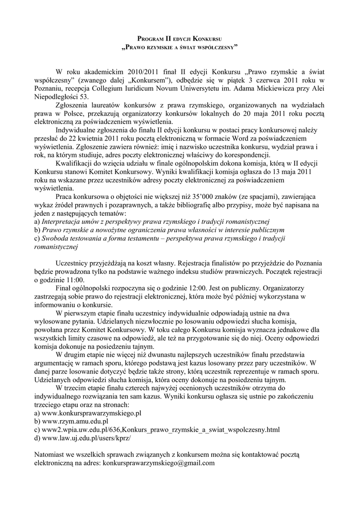 PROGRAM II EDYCJI KONKURSU „PRAWO RZYMSKIE A ŚWIAT WSPÓŁCZESNY” W roku akademickim 2010/2011 finał II edycji Konkursu „Prawo rzymskie a świat współczesny” (zwanego dalej „Konkursem”), odbędzie się w piątek 3 czerwca 2011 roku w Poznaniu, recepcja Collegium Iuridicum Novum Uniwersytetu im. Adama Mickiewicza przy Alei Niepodległości 53. Zgłoszenia laureatów konkursów z prawa rzymskiego, organizowanych na wydziałach prawa w Polsce, przekazują organizatorzy konkursów lokalnych do 20 maja 2011 roku pocztą elektroniczną za poświadczeniem wyświetlenia. Indywidualne zgłoszenia do finału II edycji konkursu w postaci pracy konkursowej należy przesłać do 22 kwietnia 2011 roku pocztą elektroniczną w formacie Word za poświadczeniem wyświetlenia. Zgłoszenie zawiera również: imię i nazwisko uczestnika konkursu, wydział prawa i rok, na którym studiuje, adres poczty elektronicznej właściwy do korespondencji. Kwalifikacji do wzięcia udziału w finale ogólnopolskim dokona komisja, którą w II edycji Konkursu stanowi Komitet Konkursowy. Wyniki kwalifikacji komisja ogłasza do 13 maja 2011 roku na wskazane przez uczestników adresy poczty elektronicznej za poświadczeniem wyświetlenia. Praca konkursowa o objętości nie większej niż 35’000 znaków (ze spacjami), zawierająca wykaz źródeł prawnych i pozaprawnych, a także bibliografię albo przypisy, może być napisana na jeden z następujących tematów: a) Interpretacja umów z perspektywy prawa rzymskiego i tradycji romanistycznej b) Prawo rzymskie a nowożytne ograniczenia prawa własności w interesie publicznym c) Swoboda testowania a forma testamentu – perspektywa prawa rzymskiego i tradycji romanistycznej Uczestnicy przyjeżdżają na koszt własny. Rejestracja finalistów po przyjeździe do Poznania będzie prowadzona tylko na podstawie ważnego indeksu studiów prawniczych. Początek rejestracji o godzinie 11:00. Finał ogólnopolski rozpoczyna się o godzinie 12:00. Jest on publiczny. Organizatorzy zastrzegają sobie prawo do rejestracji elektronicznej, która może być później wykorzystana w informowaniu o konkursie. W pierwszym etapie finału uczestnicy indywidualnie odpowiadają ustnie na dwa wylosowane pytania. Udzielanych niezwłocznie po losowaniu odpowiedzi słucha komisja, powołana przez Komitet Konkursowy. W toku całego Konkursu komisja wyznacza jednakowe dla wszystkich limity czasowe na odpowiedź, ale też na przygotowanie się do niej. Oceny odpowiedzi komisja dokonuje na posiedzeniu tajnym. W drugim etapie nie więcej niż dwunastu najlepszych uczestników finału przedstawia argumentację w ramach sporu, którego podstawą jest kazus losowany przez pary uczestników. W danej parze losowanie dotyczyć będzie także strony, którą uczestnik reprezentuje w ramach sporu. Udzielanych odpowiedzi słucha komisja, która oceny dokonuje na posiedzeniu tajnym. W trzecim etapie finału czterech najwyżej ocenionych uczestników otrzyma do indywidualnego rozwiązania ten sam kazus. Wyniki konkursu ogłasza się ustnie po zakończeniu trzeciego etapu oraz na stronach: a) www.konkursprawarzymskiego.pl b) www.rzym.amu.edu.pl c) www2.wpia.uw.edu.pl/636,Konkurs_prawo_rzymskie_a_swiat_wspolczesny.html d) www.law.uj.edu.pl/users/kprz/ Natomiast we wszelkich sprawach związanych z konkursem można się kontaktować pocztą elektroniczną na adres: [email protected] Zalecana literatura obejmuje: a) W. Dajczak, T. Giaro, F. Longchamps de Bérier, Prawo rzymskie. U podstaw prawa prywatnego, Warszawa 2009 b) A. Dębiński, rozdział III z Kościół i prawo rzymskie, Lublin 2007 i 2008 c) H. Kupiszewski, rozdział VI i VII z Prawo rzymskie a współczesność, Warszawa 1988 d) B. Sitek, rozdział X z Infamia w ustawodawstwie cesarzy rzymskich, Olsztyn 2003 Nagroda główna to 6 dniowy wyjazd do Rzymu dla laureatów Konkursu. Liczbę laureatów nie większa niż trzech wskazuje komisja konkursowa. Wyjazd ma organizować biuro podróży księży pallotynów jako współfundator nagrody. Decyzje komisji w sprawie nagród są ostateczne i nie podlega kontroli sądowej.
