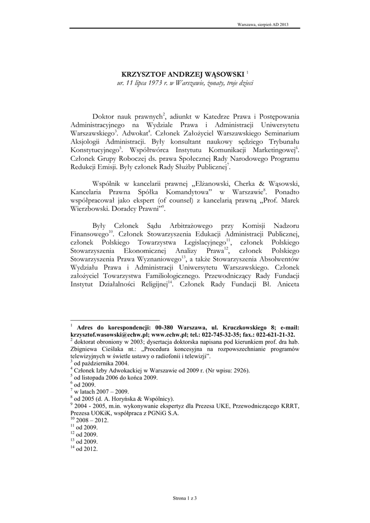 Warszawa, sierpień AD 2013 KRZYSZTOF ANDRZEJ WĄSOWSKI 1 ur. 11 lipca 1973 r. w Warszawie, żonaty, troje dzieci Doktor nauk prawnych2, adiunkt w Katedrze Prawa i Postępowania Administracyjnego na Wydziale Prawa i Administracji Uniwersytetu Warszawskiego3. Adwokat4. Członek Założyciel Warszawskiego Seminarium Aksjologii Administracji. Były konsultant naukowy sędziego Trybunału Konstytucyjnego5. Współtwórca Instytutu Komunikacji Marketingowej6. Członek Grupy Roboczej ds. prawa Społecznej Rady Narodowego Programu Redukcji Emisji. Były członek Rady Służby Publicznej7. Wspólnik w kancelarii prawnej „Elżanowski, Cherka & Wąsowski, Kancelaria Prawna Spółka Komandytowa” w Warszawie8. Ponadto współpracował jako ekspert (of counsel) z kancelarią prawną „Prof. Marek Wierzbowski. Doradcy Prawni”9. Były Członek Sądu Arbitrażowego przy Komisji Nadzoru Finansowego10. Członek Stowarzyszenia Edukacji Administracji Publicznej, członek Polskiego Towarzystwa Legislacyjnego11, członek Polskiego Stowarzyszenia Ekonomicznej Analizy Prawa12, członek Polskiego Stowarzyszenia Prawa Wyznaniowego13, a także Stowarzyszenia Absolwentów Wydziału Prawa i Administracji Uniwersytetu Warszawskiego. Członek założyciel Towarzystwa Familiologicznego. Przewodniczący Rady Fundacji Instytut Działalności Religijnej14. Członek Rady Fundacji Bł. Aniceta 1 Adres do korespondencji: 00-380 Warszawa, ul. Kruczkowskiego 8; e-mail: [email protected]; www.echw.pl; tel.: 022-745-32-35; fax.: 022-621-21-32. 2 doktorat obroniony w 2003; dysertacja doktorska napisana pod kierunkiem prof. dra hab. Zbigniewa Cieślaka nt.: „Procedura koncesyjna na rozpowszechnianie programów telewizyjnych w świetle ustawy o radiofonii i telewizji”. 3 od października 2004. 4 Członek Izby Adwokackiej w Warszawie od 2009 r. (Nr wpisu: 2926). 5 od listopada 2006 do końca 2009. 6 od 2009. 7 w latach 2007 – 2009. 8 od 2005 (d. A. Horyńska & Wspólnicy). 9 2004 - 2005, m.in. wykonywanie ekspertyz dla Prezesa UKE, Przewodniczącego KRRT, Prezesa UOKiK, współpraca z PGNiG S.A. 10 2008 – 2012. 11 od 2009. 12 od 2009. 13 od 2009. 14 od 2012. Strona 1 z 3 Warszawa, sierpień AD 2013 Kopińskiego (działającej na rzecz bezdomnych)15. Były Współprzewodniczący Komisji Majątkowej16. Ponadto wykładowca na warszawskich wyższych uczelniach, prowadzący zajęcia z następujących przedmiotów: 1) „Zasady prawidłowej legislacji – technika legislacyjna”, „Postępowanie administracyjne”, „Gospodarka nieruchomościami”, „Zarządzanie kryzysowe”, „Procedury administracyjne w prawie bankowym”, „Procedury regulacyjne w prawie telekomunikacyjnym”17; 2) „Nauka administracji”, „Prawo administracyjne”, „Wstęp do prawoznawstwa”, „Współczesne Doktryny Polityczno – Prawne”18; 3) „Prawo bankowe”19, 4) „Prawo Samorządu Terytorialnego”20, 5) „Prawo mediów elektronicznych”, „Prawo ochrony środowiska – zagadnienia administracyjno-prawne”, „Prawo administracyjne”, „Postępowanie administracyjne”21. Prowadzący szkolenia i warsztaty z zakresu procedur administracyjnych oraz prawa gospodarczego, m.in. dla Wolters Kluwer Polska Sp. z o.o. (gdzie otrzymał tytuł „Trenera Roku”)22; Ogólnopolskiego Centrum Edukacji Samorządu i Administracji Sp. z o.o.; LOGOS Europejskie Centrum Kształcenia Kadr. Autor publikacji z zakresu prawa i postępowania administracyjnego (w tym w szczególności – administracyjnych procedur regulacyjnych i gospodarczych), koncesjonowania radiofonii i telewizji, prawa zamówień publicznych oraz prawa własności intelektualnej23. Pełnił także funkcje, m.in.: doradcy Ministra Skarbu Państwa24, doradcy prawnego w Państwowej Agencji Radiokomunikacyjnej25, doradcy prawnego w 15 od 2012. Powołany przez Sekretarza Konferencji Episkopatu Polski w 2001 na Współprzewodniczącego Zespołu Orzekającego, a w 2009 na Współprzewodniczącego Komisji Majątkowej (do 2011), pełnomocnik Komisji w postępowaniach przed sądami administracyjnymi. 17 na Wydziale Prawa i Administracji Uniwersytetu Kardynała Stefana Wyszyńskiego dla studentów studiów prawniczych i administracyjnych. 18 w Wyższej Szkole Bezpieczeństwa i Ochrony dla studentów studiów administracyjnych. 19 w Wyższej Szkole Działalności Gospodarczej w Warszawie. 20 w Wyższej Szkole Przedsiębiorczości i Zarządzania im. L. Koźmińskiego w Warszawie 21 na Wydziale Prawa i Administracji Uniwersytetu Warszawskiego. 22 Dla jednostek samorządu terytorialnego (szczebla gminnego i powiatowego), inspektoratów nadzoru budowlanego, urzędników organów regulacyjnych (w tym cykl szkoleń dla Urzędu Komunikacji Elektronicznej), administracji bezpieczeństwa itp. 23 około 50 publikacji, w następujących publikatorach: Studia Iuridica, Kwartalnik Prawa Publicznego, Rynek Zamówień Publicznych, Serwis Administracyjno - Samorządowy. Współredaktor monografii Prawne aspekty procesu inwestycyjnego, wyd. 1, Wolters Kluwer Polska, Warszawa 2009. 24 w latach 1999 – 2000. 16 Strona 2 z 3 Warszawa, sierpień AD 2013 Państwowej Agencji Inwestycji Zagranicznych26, doradcy prawnego spółki Ciech – Serwis Sp. z o.o.27, kierownika działu nadzoru właścicielskiego przy Biurze Zarządu Polskich Sieci Elektroenergetycznych S. A. w Warszawie28, prokurenta spółki Polski Monopol Loteryjny Sp. z o.o.29, biegłego w kontroli Krajowej Rady Radiofonii i Telewizji przeprowadzanej przez Najwyższą Izbę Kontroli30, członka rad nadzorczych w następujących spółkach: Gaspol S.A., Polskie Konsorcjum Gospodarcze S.A., Petrochemia Blachownia S.A.31, Presspublica Sp. z o.o. w Warszawie32 oraz Elterix S.A. z siedzibą w Gdyni (potem w Warszawie)33. Był też członkiem Rady Naukowej Instytutu Nauk Prawno – Administracyjnych oraz członkiem Rady Wydziału Prawa i Administracji Uniwersytetu Warszawskiego, a także członkiem Senackiej Komisji ds. Socjalno – Bytowych Uniwers