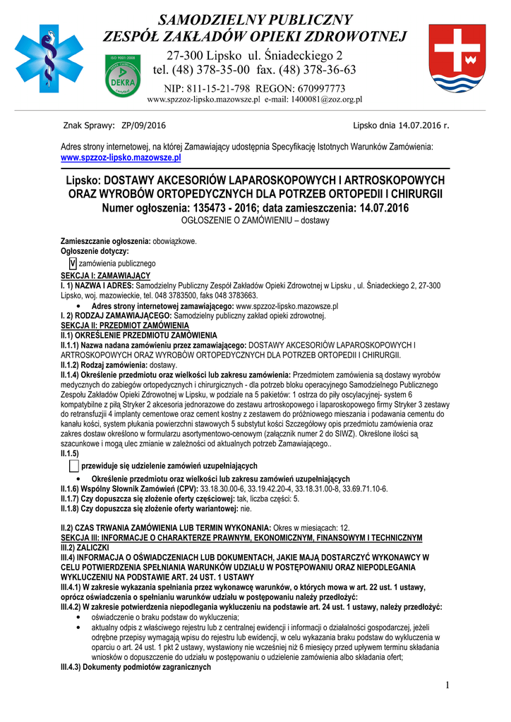 Znak Sprawy: ZP/09/2016 Lipsko dnia 14.07.2016 r. Adres strony internetowej, na której Zamawiający udostępnia Specyfikację Istotnych Warunków Zamówienia: www.spzzoz-lipsko.mazowsze.pl Lipsko: DOSTAWY AKCESORIÓW LAPAROSKOPOWYCH I ARTROSKOPOWYCH ORAZ WYROBÓW ORTOPEDYCZNYCH DLA POTRZEB ORTOPEDII I CHIRURGII Numer ogłoszenia: 135473 - 2016; data zamieszczenia: 14.07.2016 OGŁOSZENIE O ZAMÓWIENIU – dostawy Zamieszczanie ogłoszenia: obowiązkowe. Ogłoszenie dotyczy: V zamówienia publicznego SEKCJA I: ZAMAWIAJĄCY I. 1) NAZWA I ADRES: Samodzielny Publiczny Zespół Zakładów Opieki Zdrowotnej w Lipsku , ul. Śniadeckiego 2, 27-300 Lipsko, woj. mazowieckie, tel. 048 3783500, faks 048 3783663. • Adres strony internetowej zamawiającego: www.spzzoz-lipsko.mazowsze.pl I. 2) RODZAJ ZAMAWIAJĄCEGO: Samodzielny publiczny zakład opieki zdrowotnej. SEKCJA II: PRZEDMIOT ZAMÓWIENIA II.1) OKREŚLENIE PRZEDMIOTU ZAMÓWIENIA II.1.1) Nazwa nadana zamówieniu przez zamawiającego: DOSTAWY AKCESORIÓW LAPAROSKOPOWYCH I ARTROSKOPOWYCH ORAZ WYROBÓW ORTOPEDYCZNYCH DLA POTRZEB ORTOPEDII I CHIRURGII. II.1.2) Rodzaj zamówienia: dostawy. II.1.4) Określenie przedmiotu oraz wielkości lub zakresu zamówienia: Przedmiotem zamówienia są dostawy wyrobów medycznych do zabiegów ortopedycznych i chirurgicznych - dla potrzeb bloku operacyjnego Samodzielnego Publicznego Zespołu Zakładów Opieki Zdrowotnej w Lipsku, w podziale na 5 pakietów: 1 ostrza do piły oscylacyjnej- system 6 kompatybilne z piłą Stryker 2 akcesoria jednorazowe do zestawu artroskopowego i laparoskopowego firmy Stryker 3 zestawy do retransfuzjii 4 implanty cementowe oraz cement kostny z zestawem do próżniowego mieszania i podawania cementu do kanału kości, system płukania powierzchni stawowych 5 substytut kości Szczegółowy opis przedmiotu zamówienia oraz zakres dostaw określono w formularzu asortymentowo-cenowym (załącznik numer 2 do SIWZ). Określone ilości są szacunkowe i mogą ulec zmianie w zależności od aktualnych potrzeb Zamawiającego.. II.1.5) przewiduje się udzielenie zamówień uzupełniających • Określenie przedmiotu oraz wielkości lub zakresu zamówień uzupełniających II.1.6) Wspólny Słownik Zamówień (CPV): 33.18.30.00-6, 33.19.42.20-4, 33.18.31.00-8, 33.69.71.10-6. II.1.7) Czy dopuszcza się złożenie oferty częściowej: tak, liczba części: 5. II.1.8) Czy dopuszcza się złożenie oferty wariantowej: nie. II.2) CZAS TRWANIA ZAMÓWIENIA LUB TERMIN WYKONANIA: Okres w miesiącach: 12. SEKCJA III: INFORMACJE O CHARAKTERZE PRAWNYM, EKONOMICZNYM, FINANSOWYM I TECHNICZNYM III.2) ZALICZKI III.4) INFORMACJA O OŚWIADCZENIACH LUB DOKUMENTACH, JAKIE MAJĄ DOSTARCZYĆ WYKONAWCY W CELU POTWIERDZENIA SPEŁNIANIA WARUNKÓW UDZIAŁU W POSTĘPOWANIU ORAZ NIEPODLEGANIA WYKLUCZENIU NA PODSTAWIE ART. 24 UST. 1 USTAWY III.4.1) W zakresie wykazania spełniania przez wykonawcę warunków, o których mowa w art. 22 ust. 1 ustawy, oprócz oświadczenia o spełnianiu warunków udziału w postępowaniu należy przedłożyć: III.4.2) W zakresie potwierdzenia niepodlegania wykluczeniu na podstawie art. 24 ust. 1 ustawy, należy przedłożyć: • oświadczenie o braku podstaw do wykluczenia; • aktualny odpis z właściwego rejestru lub z centralnej ewidencji i informacji o działalności gospodarczej, jeżeli odrębne przepisy wymagają wpisu do rejestru lub ewidencji, w celu wykazania braku podstaw do wykluczenia w oparciu o art. 24 ust. 1 pkt 2 ustawy, wystawiony nie wcześniej niż 6 miesięcy przed upływem terminu składania wniosków o dopuszczenie do udziału w postępowaniu o udzielenie zamówienia albo składania ofert; III.4.3) Dokumenty podmiotów zagranicznych 1 Jeżeli wykonawca ma siedzibę lub miejsce zamieszkania poza terytorium Rzeczypospolitej Polskiej, przedkłada: III.4.3.1) dokument wystawiony w kraju, w którym ma siedzibę lub miejsce zamieszkania potwierdzający, że: • nie otwarto jego likwidacji ani nie ogłoszono upadłości - wystawiony nie wcześniej niż 6 miesięcy przed upływem terminu składania wniosków o dopuszczenie do udziału w postępowaniu o udzielenie zamówienia albo składania ofert; III.4.4) Dokumenty dotyczące przynależności do tej samej grupy kapitałowej • lista podmiotów należących do tej samej grupy kapitałowej w rozumieniu ustawy z dnia 16 lutego 2007 r. o ochronie konkurencji i konsumentów albo informacji o tym, że nie należy do grupy kapitałowej; III.5) INFORMACJA O DOKUMENTACH POTWIERDZAJĄCYCH, ŻE OFEROWANE DOSTAWY, USŁUGI LUB ROBOTY BUDOWLANE ODPOWIADAJĄ OKREŚLONYM WYMAGANIOM W zakresie potwierdzenia, że oferowane roboty budowlane, dostawy lub usługi odpowiadają określonym wymaganiom należy przedłożyć: • próbki, opisy lub fotografie produktów, które mają zostać dostarczone, których autentyczność musi zostać poświadczona przez wykonawcę na żądanie zamawiającego; • zaświadczenie niezależnego podmiotu uprawnionego do kontroli jakości potwierdzającego, że dostarczane produkty odpowiadają określonym normom lub specyfikacjom technicznym; • inne dokumenty Oświadczenie o zarejestrowaniu oczekiwanego przedmiotu zamówienia jako wyrób medyczny, dopuszczeniu do obrotu na terytorium RP oraz oznakowaniu opakowania zgodnie z ustawą o wyrobach medycznych ( tekst jednolity Dz.U. Nr 107 z 2010 roku ) - wzór załącznik nr 7 do SIWZ. III.6) INNE DOKUMENTY Inne dokumenty niewymienione w pkt III.4) albo w pkt III.5) V.1. druk oferty - zgodnie z załącznikiem nr 1 do SIWZ, V.2. wypełniony formularz asortymentowo - cenowy - zgodnie z załącznikiem nr 2 do SIWZ, V.3. upoważnienie (pełnomocnictwo) do podpisania oferty powinno być dołączone do oferty, o ile nie wynika ono z dokumentów dołączonych do oferty. Upoważnienie (pełnomocnictwo) powinno być złożone w formie oryginału albo notarialnie poświadczonej kopii. V.4. Pisemne zobowiązanie innych podmiotów zgodnie z art. 26 ust. 2 b) ustawy do oddania