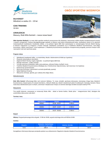 Oferta obozów letnich Akademii Kusznierewicza 2016 OBÓZ SPORTÓW WODNYCH DLA KOGO? Młodzież w wieku 15 – 19 lat CZAS TRWANIA 14 dni LOKALIZACJA Mazury, Klub Mila Kamień – nasza nowa baza! Obóz Sportów Wodnych to nowy obóz sportów wodnych przeznaczony dla młodzieży. Gwarantuje solidną dawkę niezapomnianych przeżyć i nowych umiejętności. Podczas dwutygodniowego wyjazdu na Mazury, pod okiem doświadczonej kadry, spróbujecie swoich sił w sportach motorowodnych (wakeboard, kneeboard, kółko), a na jachtach Sigma 600 Club wystartujecie w emocjonującej formule Match Racing, w których rozgrywane są zmagania o Puchar Ameryki. Dodatkowo sprawdzicie się w Triathlonie Akademii Kusznierewicza, czyli biegu terenowym, rajdzie rowerowym i torze kajakowym. Z Akademią Kusznierewicza przeżyjecie niezapomnianą przygodę, poznacie nowych ludzi i poczujecie czym jest sportowa pasja. Program obozu ✓ ✓ ✓ ✓ ✓ ✓ ✓ ✓ ✓ ✓ Wakeboard, kneeboard, kółko - za motorówką. Nauka i doskonalenie (4 bloki po 3 godziny). Pływanie motorówką ze sternikiem. Żeglarski Match Racing i regaty żeglarskie - na jachtach Sigma 600 Club. Wyścigi rowerowe – próby czasowe. Turnieje sportowe (siatkówka i piłka nożna plażowa, ultimate frisbee, korfball i inne). Triathlon Akademii Kusznierewicza składający się z 3 konkurencji: bieg terenowy, rajd rowerowy i tor kajakowy Konkurencje sprawnościowe Nocne gry terenowe z elementami survivalu (podchody, questy). Spływ kajakowy Krutynią. Wieczorne animacje, ogniska, gry i zabawy dla całego obozu. Zakwaterowanie Klub Mila Kamień k/Rucianego-Nidy nad Jeziorem Bełdany. To nowy ośrodek sportowo-rekreacyjny stanowiący drugą bazę Akademii Kusznierewicza. Dysponujemy 15 nowymi domkami, z których składa się z dwóch niezależnych pokoi 4-osobowych z łazienką i tarasem. Nasza nowa baza zlokalizowana jest w cichym, ustronnym i bezpiecznym miejscu na terenie dawnego ośrodka turystyki wodnej PTTK. Wyżywienie Trzy posiłki dziennie, serwowane w restauracji Klubu Mila - obiad w formie bufetu. Woda pitna - nieograniczona ilość, dostępna dla uczestników obozu przez cały dzień. Terminy i ceny Kod imprezy OADK1 Termin 26.06 - 09.07 Cena 2 599 zł OADK2 10.07 - 23.07 2 599 zł OADK3 24.07 - 06.08 2 599 zł Dojazd Własny. Przyjazd pierwszego dnia od godz. 17:00 do 19:00, wyjazd ostatniego dnia od 9:00 do 10:00. Autokar. Wyjazd z Cena Katowice, Częstochowa, Piotrków Trybunalski 200 zł Gdańsk, Ostróda Warszawa 200 zł 120 zł Szczegółowe informacje dotyczące przejazdu podane są w dokumencie: Regulamin dojazdu Akademii Kusznierewicza. Strona 1 z 2 Oferta obozów letnich Akademii Kusznierewicza 2016 Co ze sobą zabrać? Latarka (najlepiej czołowa), strój kąpielowy, pianka żeglarska lub pływacka, strój sportowy, strój do zajęć w terenie (dresy, bluzy), przybory do mycia, 2 ręczniki (w tym jeden plażowy) kurtka przeciwdeszczowa (najlepiej sztormiak), pełne obuwie z miękką podeszwą (2 pary), nakrycie głowy, okulary przeciwsłoneczne, krem z filtrem, spray na komary, bidon na wodę. Świadczenia w cenie Żeglowanie na jachtach Sigma 600 Club, zakwaterowanie w Klubie Mila w Kamieniu (13 noclegów), pełne wyżywienie, opieka wykwalifikowanej kadry, realizacja programu, ubezpieczenie NNW uczestnika w wysokości 10 000 zł. Jachty Nowoczesny i specjalnie zmodyfikowany dla Akademii Kusznierewicza jacht Sigma 600 Club. Jest to jednostka otwartopokładowa nowej generacji – stabilna, bezpieczna, estetyczna i nowoczesna, wyposażona w osprzęt renomowanych producentów. Długość: 6 m, szer. 2,42 m, pow. ożaglowania 16,5 m2. W ocenie naszych ekspertów, w tym Mateusza Kusznierewicza, jest to obecnie jeden z najlepszych na świecie jachtów uniwersalnych: do szkolenia, dla bezpiecznej zabawy dla dzieci i początkujących, a jednocześnie satysfakcjonujący nautycznie w pływaniu regatowym. Na jachcie pływa do 5 osób plus instruktor. Kadra Akademia Kusznierewicza to ludzie z pasją, współpracujący z nami od lat - wysokiej klasy specjaliści, instruktorzy, sternicy, trenerzy, wychowawcy, posiadający wieloletnie doświadczenie w pracy z młodzieżą, predyspozycje pedagogiczne, a przede wszystkim radość dzielenia się wiedzą i umiejętnościami. Przykładowy plan dnia 8:00 8:30 9:15 10:00 13:30 14:00 15:00 19:00 20:00 22:00 Gimnastyka poranna Śniadanie Apel organizacyjny Zajęcia programowe Obiad Przerwa poobiednia Zajęcia programowe Kolacja Zajęcia wieczorne Cisza nocna Opcjonalnie Wyżywienie W przypadku młodzieży wymagającej specjalnej diety, istnieje możliwość dostosowania posiłków do potrzeb uczestnika (np. dieta wegetariańska) bez dodatkowych opłat. Prosimy o zgłoszenie takiej potrzeby w momencie dokonywania rezerwacji. Kontakt i rezerwacje Akademia Kusznierewicza T: (22) 844 77 99 lub 661 070 000 E: [email protected] | www.AkademiaKusznierewicza.pl Strona 2 z 2