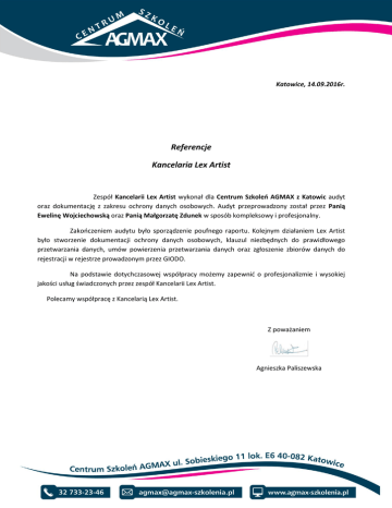 Katowice, 14.09.2016r. Referencje Kancelaria Lex Artist Zespół Kancelarii Lex Artist wykonał dla Centrum Szkoleń AGMAX z Katowic audyt oraz dokumentację z zakresu ochrony danych osobowych. Audyt przeprowadzony został przez Panią Ewelinę Wojciechowską oraz Panią Małgorzatę Zdunek w sposób kompleksowy i profesjonalny. Zakończeniem audytu było sporządzenie poufnego raportu. Kolejnym działaniem Lex Artist było stworzenie dokumentacji ochrony danych osobowych, klauzul niezbędnych do prawidłowego przetwarzania danych, umów powierzenia przetwarzania danych oraz zgłoszenie zbiorów danych do rejestracji w rejestrze prowadzonym przez GIODO. Na podstawie dotychczasowej współpracy możemy zapewnić o profesjonalizmie i wysokiej jakości usług świadczonych przez zespół Kancelarii Lex Artist. Polecamy współpracę z Kancelarią Lex Artist. Z poważaniem Agnieszka Paliszewska