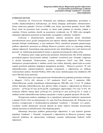 Rozprawa doktorska pt. Mapowanie genów odporności na mączniaka prawdziwego u odmian pszenżyta ozimego ‘Lamberto’ i ‘Grenado’ Ewa Ciszkowicz STRESZCZENIE Pszenżyto (X Triticosecale Wittmack) jest stabilnym amfiploidem, powstałym w wyniku międzyrodzajowej hybrydyzacji, po której następuje podwojenie chromosomów, formy matecznej gatunku Triticum (AABB) oraz formy ojcowskiej gatunku Secale (RR). Przez wiele lat pszenżyto było uważane za zboże mało podatne na choroby, jednak w ostatnim 10-leciu nasilenie chorób na pszenżycie zwiększało się. W 2004 roku nastąpiło załamanie odporności pszenżyta na mączniaka, szczególnie u odmiany ‘Lamberto’. Celowym i ekonomicznym sposobem ochrony pszenżyta przed chorobami powodowanymi przez grzyby patogeniczne jest uprawa odmian odpornych. Wykorzystanie narzędzi biologii molekularnej, w tym markerów DNA, umożliwia poznanie genetycznego podłoża odporności pszenżyta na infekcję Blumeria graminis, przez co wspomaga selekcję odmian odpornych. Konstrukcja map genetycznych oraz identyfikacja loci cech ilościowych pozwala na lokalizację potencjalnych miejsc w genomie powiązanych z daną cechą. W niniejszej pracy mapę genetyczną pszenżyta skonstruowano dla dwóch populacji powstałych poprzez skrzyżowanie odmian ‘Lamberto’ (wrażliwa) oraz ‘Grenado’ (odporna) w dwóch kierunkach. Wykorzystano systemy markerowe DArT oraz SSR. Ocena fenotypowa, przeprowadzona w stadium siewki oraz rośliny dojrzałej, oparta była na ocenie stopnia porażenia populacji mapującej patogennym grzybem – Blumeria graminis. W celu zidentyfikowania rejonów/markerów genomu związanych z odpornością na infekcję wykorzystano analizy: Kruskal-Wallisa, SMA (dla oceny inokulacyjnej) oraz dodatkowo IM oraz CIM (dla oceny polowej). Wynikiem pracy jest mapa genetyczna dwukierunkowej populacji pszenżyta ozimego, o długości 1 813.6 cM, złożona z 547 markerów DArT oraz 7 markerów SSR. Zidentyfikowane zostały translokacje niehomeologiczne 5BS.3BL oraz 7A.1A. W stadium rośliny dojrzałej zidentyfikowano dwa główne efekty związane z odpornością na Blumeria graminis – Q.Pm.lgl.1R oraz Q.Pm.lgl.6R, wyjaśniające odpowiednio 15% oraz 33.4%. Do istotnych efektów należą także Q.Pm.lgl.2A2, Q.Pm.lgl.3A oraz Q.Pm.lgl.1B. U roślin w stadium siewki zidentyfikowano markery sprzężone z cechą w grupach sprzężeń 1R oraz 6R. Wytypowano markery znajdujące się w sąsiedztwie opisanych markerów sprzężonych z genami Pm50 i Pm4 na chromosomie 2A, oraz Pm39 na chromosomie 1B. Wskazuje to na możliwe występowanie w dwukierunkowej populacji ‘Lamberto’ i ‘Grenado’ w/w genów. Uzyskane wyniki dostarczyły nowych danych na temat wpływu kierunku krzyżowania odmian pszenżyta na dziedziczenie i/lub ekspresję genów. Informacje dotyczące podłoża genetycznego odporności, w tym rejonów genomu populacji ‘Lamberto’ i ‘Grenado’ związanych z odpornością na Blumeria graminis, mogą stanowić podstawę do opracowania wydajnego systemu selekcyjnego hodowli roślin odpornych. Rozprawa doktorska pt. Mapowanie genów odporności na mączniaka prawdziwego u odmian pszenżyta ozimego ‘Lamberto’ i ‘Grenado’ Ewa Ciszkowicz SUMMARY Triticale (X Triticosecale Wittmack) is an amphiploid stably carrying the genomes of wheat (AABB or AABBDD) and rye (RR). Triticales are the fertile progenies of an intergeneric hybridization between a female parent from the genus Triticum and male parent from the genus Secale, followed by chromosome doubling. The economic importance of triticale systematically grows thanks to its better performance in less favorable environments. In recent years, resistance to pathogenic fungus – Blumeria graminis, that causes powdery mildew, significantly decreased in triticale. Deliberate and economical way to protect triticale against diseases caused by pathogenic fungi is the cultivation of resistant varieties. The identification of natural sources of resistance and breeding resistant varieties is the most effective way to control powdery mildew disease. Phenotypic selection based on molecular markers linked to genes for resistance can also facilitate resistance breeding. All triticale breeding programs require saturated genetic maps to locate quantitative traits of resistance. Genetic map construction and analysis of quantitative trait loci allows for the location of potential sites in the genome associated with the interesting trait. In the present study, bidirectional crosses between ‘Lamberto’ and ‘Grenado’ as susceptible and resistant parent, respectively, were developed in order to obtain F2 and F3 mapping populations. Genetic linkage maps based on genotyping of ‘Lamberto’ × ‘Grenado’ (LG) and ‘Grenado’ × ‘Lamberto’ (GL) populations with DArT and SSR markers were constructed. Both populations were inoculated and evaluated in controlled conditions and field tests. QTLs were identified by single marker analysis, interval mapping, composite interval mapping analyses and validated by Kruskal-Wallis test. The result of this study is a genetic map of winter triticale of total length 1 813.6 cM with 554 loci (547 DArT markers and 7 SSR markers). Translocations of chromosomes fragments from different homeologic groups (5BS.3BL and 7A.1A) were identified. Two main, stable QTLs on chromosomes 1R (Q.Pm.lgl.1R) and 6R (Q.Pm.lgl.6R) were identified, explaining 15% and 33.4% of variation, respectively. Three DArT markers mapped on 6R chromosome (rPt-398825, tPt-513060, rPt-411235) were associated with resistance to powdery mildew. Minor effects in adult plant stage were also identified in 2A2, 3A and 1B linkage groups. The possible occurrence of powdery mildew resistance genes: Pm4, Pm 50 (on chromosome 2A) and Pm39 (on chromosome 1B) was discussed. Genomic regions/markers of the bidirectional population ‘Lamberto’ and ‘Grenado’ associated with resistance to Blumeria gr