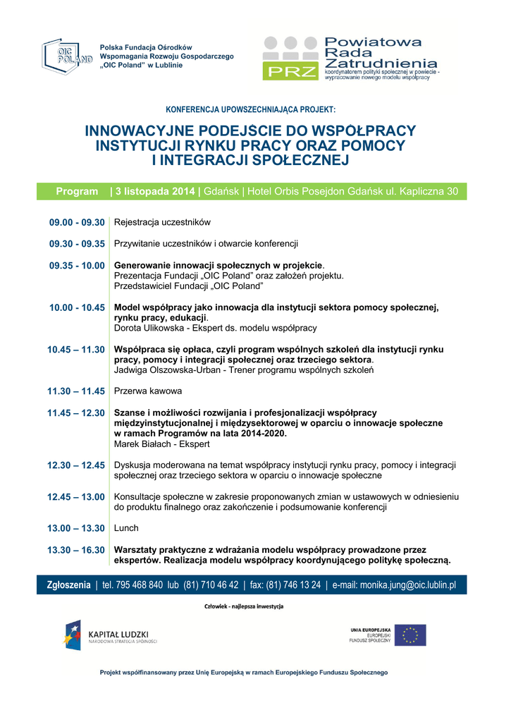 KONFERENCJA UPOWSZECHNIAJĄCA PROJEKT: INNOWACYJNE PODEJŚCIE DO WSPÓŁPRACY INSTYTUCJI RYNKU PRACY ORAZ POMOCY I INTEGRACJI SPOŁECZNEJ Program | 3 listopada 2014 | Gdańsk | Hotel Orbis Posejdon Gdańsk ul. Kapliczna 30 09.00 - 09.30 Rejestracja uczestników 09.30 - 09.35 Przywitanie uczestników i otwarcie konferencji 09.35 - 10.00 Generowanie innowacji społecznych w projekcie. Prezentacja Fundacji „OIC Poland” oraz założeń projektu. Przedstawiciel Fundacji „OIC Poland” 10.00 - 10.45 Model współpracy jako innowacja dla instytucji sektora pomocy społecznej, rynku pracy, edukacji. Dorota Ulikowska - Ekspert ds. modelu współpracy 10.45 – 11.30 Współpraca się opłaca, czyli program wspólnych szkoleń dla instytucji rynku pracy, pomocy i integracji społecznej oraz trzeciego sektora. Jadwiga Olszowska-Urban - Trener programu wspólnych szkoleń 11.30 – 11.45 Przerwa kawowa 11.45 – 12.30 Szanse i możliwości rozwijania i profesjonalizacji współpracy międzyinstytucjonalnej i międzysektorowej w oparciu o innowacje społeczne w ramach Programów na lata 2014-2020. Marek Białach - Ekspert 12.30 – 12.45 Dyskusja moderowana na temat współpracy instytucji rynku pracy, pomocy i integracji społecznej oraz trzeciego sektora w oparciu o innowacje społeczne 12.45 – 13.00 Konsultacje społeczne w zakresie proponowanych zmian w ustawowych w odniesieniu do produktu finalnego oraz zakończenie i podsumowanie konferencji 13.00 – 13.30 Lunch 13.30 – 16.30 Warsztaty praktyczne z wdrażania modelu współpracy prowadzone przez ekspertów. Realizacja modelu współpracy koordynującego politykę społeczną. Zgłoszenia | tel. 795 468 840 lub (81) 710 46 42 | fax: (81) 746 13 24 | e-mail: [email protected]