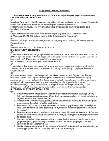 Regulamin i zasady Konkursu "Inspiracje końca lata: manicure. Konkurs na najładniejszą stylizację paznokci" I. POSTANOWIENIA OGÓLNE §1 Niniejszy Regulamin określa warunki, na jakich odbywa się konkurs pod nazwą "Inspiracje końca lata: manicure. Konkurs na najładniejszą stylizację paznokci" Przedmiotem Konkursu jest wybór najbardziej oryginalnego manicure zgodnego z tematyką konkursu. §2 Organizatorem konkursu oraz fundatorem nagrody jest Quanta Piotr Ciszewski. ul. Wrońska 4A, 20-327 Lublin, zwany dalej („Organizator Konkursu”), §3 Konkurs jest organizowany na terytorium Rzeczypospolitej Polskiej, na stronie serwisu Pinterest.com §4 Konkurs trwa od 03.09.2013 do 22.09.2013 r. II. UCZESTNICY KONKURSU §5 Uczestnikami Konkursu mogą być osoby pełnoletnie, które w dniach 03.09.2013 do 22.09. 2013 r. zgłoszą prace w formie zdjęcia obrazującego hasło konkursowe „Inspiracje końca lata: manicure". Prace można składać pod adresem http://pinterest.com/ekobiecapl/konkurs-ekobiecapl/ §6 Uczestnikami Konkursu nie mogą być pracownicy oraz osoby pozostające w stosunku zlecenia lub w innym stosunku prawnym, do którego stosuje się przepisy o zleceniu z Organizatorem. §7 Administratorem danych osobowych uczestników Konkursu jest Organizator. Dane osobowe przekazane Organizatorowi przez wyłonionych laureatów Konkursu będą przetwarzane w celu realizacji Konkursu oraz w celach marketingowych. Dane osobowe mogą być także przetwarzane, gdy jest to niezbędne dla wypełnienia prawnie usprawiedliwionych celów administratora danych. Podanie danych osobowych jest dobrowolne, jednak ich niepodanie uniemożliwi laureatom otrzymanie nagród. III. ZASADY I PRZEBIEG KONKURSU §8 1. Nad prawidłowym przebiegiem Konkursu i przyznaniem nagród czuwają Osoby Odpowiedzialne powołane przez Organizatora (zwane w dalszej części niniejszego regulaminu również "Moderatorami"). 2. Uczestnicy Konkursu mogą zgłosić zdjęcie prezentujące manicure wykonany przez siebie na modelce lub na sobie osobiście. 3. Praca musi być opatrzona komantarzem na temat użytych artykułów do makijażu oraz uzasdnieniem co było inspiracją do wykonania manicure (zgodnie z tematem Konkursu) 4. Przesłana praca musi zostaćzaakceptowana przez Moderatora Konkursu, która ma prawo do odrzucenia pracy bez podania przyczyny. Następnie zostaje przeniesiona do galerii prac. 5. Ostateczny wybór najlepszego makijażu zostanie dokonany przez Jury ekobieca (nagroda I) oraz poprzez użytkowników serwisu Pinterest (największa liczba udostępnienień) (nagrody II-IV). 6. Każdy użytkownik serwisu Pinterest może "przpiąć" (udostępnić na swojej tablicy za pomocą przyciku "Pin it") dowolną ilość prac konkursowych. §9 1. Aby przystąpić do Konkursu należy: • Posiadać konto w serwisie społecznościowym Pinterest • Śledzić profil Drogerii internetowej eKobieca.pl, dostępnego w serwisie Pinterest na stronie: http://pinterest.com/ekobiecapl/boards/ • zapoznać się z Regulaminem Konkursu • Na stronie inspiracjekoncalata.ekobieca.pl podać adres e-mail związany z kontem na Pinterest. Na ten adres zostanie wysłane zaproszenie od eKobieca na profil http://pinterest.com/ekobiecapl/konkurs-ekobiecapl/. Potwierdzenie zaproszenia umożliwi uczestnikom Konkursu publikację prac na tablicy konkursowej. 2. Celem postawionym przed uczestnikami Konkursu jest zaprezentowanie za pomocą zdjęcia manicure własnego wykonania i pomysłu. 3. Każdy z uczestników Konkursu może wysłać maksymalnie do trzech zdjęć JEDNEGO projektu manicure. 4. Wysyłając swoje zgłoszenie, Uczestnik oświadcza i potwierdza, że zgłoszone do Konkursu zdjęcie jest jego własnością i zostało wykonane przez niego samego oraz, że przysługują mu autorskie prawa majątkowe i osobiste do tego zdjęcia, w tym prawo do wysyłania go na Konkurs. 5. Rozstrzygnięcie Konkursu (opublikowanie wyników) nastąpi po 22.09.2013 r. Wyniki Konkursu oraz zwycięzcy zostaną opublikowane w formie notatki na tablicy portalu Pinterest IV. NAGRODY § 10 W konkursie przewidziano nagrody: 1 nagroda (wyłaniana przez Jury ekobieca): Zestaw kosmetyków do pielęgnacji paznokci złożony z: Sally Hansen Nailgrowth Miracle Serum- Profesjonalne "złote serum" pobudzające wzrost paznokci, 11 ml Essie Instant Dry Oil - Oliwka do paznokci zabezpieczająca lakier, 15 ml Sally Hansen Mega Shine Essie 3-Way Glaze - Odżywka do paznokci 3w1, 15 ml plus wybrany lakier Sally Hansen z serii Salon 2, 3, 4 nagroda (wyłaniania przez użytkowników portalu Pinterest) – Zestaw kosmetyków do pielęgnacji paznokci złożony z: Sally Hansen Nailgrowth Miracle Serum- Profesjonalne "złote serum" pobudzające wzrost paznokci, 11 ml Essie Instant Dry Oil - Oliwka do paznokci zabezpieczająca lakier, 15 ml plus wybrany lakier Sally Hansen z serii Salon V. PRAWO DO PRAC KONKURSOWYCH § 11 Wykorzystanie prac konkursowych złożonych w Konkursie będzie obejmowało prawo Organizatora do wykorzystania zgłoszonych prac bez ograniczeń czasowych i terytorialnych na następujących polaeksploatacji, na co każdy z Uczestników Konkursu wyraża zgodę: 1)Wykorzystanie do celów marketingowych, w tym reklamy, promocji, oznaczenia lub identyfikacji Organizatora; obejmuje to również utrwalanie i zwielokrotnianie poligraficzne oraz wykorzystanie tych utrwaleń; utrwalanie audiowizualne dowolną techniką niezależnie do standardu, systemu i formatu; nagrywanie na urządzeniach służących do wielokrotnego odtwarzania za pomocą nośników dźwięku i obrazu, w tym powielania, rozpowszechniania i odtwarzania nagrań, przekazywanie, odtwarzanie i emitowanie w audycjach w środkach masowego przekazu, po utrwaleniu na nośnikach dźwięku i/lub obrazu 2)Wprowadzanie do pamięci komputera i sporządzanie kopii takich zapisów dla potrzeb eksploatacji oraz trwałe lub czasowe zwielokrotnianie komputerowego zapisu w całości lub w części dowolnymi środkami i