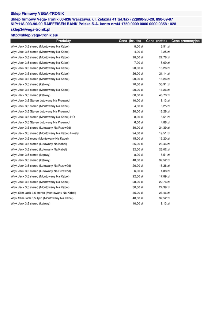 Sklep Firmowy VEGA-TRONIK Sklep firmowy Vega-Tronik 00-836 Warszawa, ul. Żelazna 41 tel./fax (22)890-20-20, 890-09-97 NIP:118-003-90-90 RAIFFEISEN BANK Polska S.A. konto nr:44 1750 0009 0000 0000 0358 1028 [email protected] http://sklep.vega-tronik.eu/ Produkty Cena (brutto) Cena (netto) Wtyk Jack 3,5 stereo (Montowany Na Kabel) 8,00 zł 6,51 zł Wtyk Jack 3,5 stereo (Montowany Na Kabel) 4,00 zł 3,25 zł Wtyk Jack 3,5 stereo (Montowany Na Kabel) 28,00 zł 22,76 zł Wtyk Jack 3,5 stereo (Montowany Na Kabel) 7,00 zł 5,69 zł Wtyk Jack 3,5 stereo (Montowany Na Kabel) 20,00 zł 16,26 zł Wtyk Jack 3,5 stereo (Montowany Na Kabel) 26,00 zł 21,14 zł Wtyk Jack 3,5 stereo (Montowany Na Kabel) 20,00 zł 16,26 zł Wtyk Jack 3,5 stereo (kątowy) 70,00 zł 56,91 zł Wtyk Jack 3,5 stereo (Montowany Na Kabel) 20,00 zł 16,26 zł Wtyk Jack 3,5 stereo (kątowy) 60,00 zł 48,78 zł Wtyk Jack 3,5 Stereo Lutowany Na Przewód 10,00 zł 8,13 zł Wtyk Jack 3,5 stereo (Montowany Na Kabel) 4,00 zł 3,25 zł Wtyk Jack 3,5 Stereo Lutowany Na Przewód 20,00 zł 16,26 zł Wtyk Jack 3,5 stereo (Montowany Na Kabel) HQ 8,00 zł 6,51 zł Wtyk Jack 3,5 Stereo Lutowany Na Przewód 6,00 zł 4,88 zł Wtyk Jack 3,5 stereo (Lutowany Na Przewód) 30,00 zł 24,39 zł Wtyk Jack 3,5 stereo (Montowany Na Kabel) Prosty 24,00 zł 19,51 zł Wtyk Jack 3,5 mono (Montowany Na Kabel) 15,00 zł 12,20 zł Wtyk Jack 3,5 stereo (Lutowany Na Kabel) 35,00 zł 28,46 zł Wtyk Jack 3,5 stereo (Lutowany Na Kabel) 32,00 zł 26,02 zł Wtyk Jack 3,5 stereo (kątowy) 8,00 zł 6,51 zł Wtyk Jack 3,5 stereo (kątowy) 40,00 zł 32,52 zł Wtyk Jack 3,5 stereo (Lutowany Na Przewód) 20,00 zł 16,26 zł Wtyk Jack 3,5 stereo (Lutowany Na Przewód) 6,00 zł 4,88 zł Wtyk Jack 3,5 stereo (Montowany Na Kabel) 22,00 zł 17,89 zł Wtyk Jack 3,5 stereo (Montowany Na Kabel) 28,00 zł 22,76 zł Wtyk Jack 3,5 stereo (Montowany Na Kabel) 30,00 zł 24,39 zł Wtyk Slim Jack 3,5 stereo (Montowany Na Kabel) 35,00 zł 28,46 zł Wtyk Slim Jack 3,5 4pin (Montowany Na Kabel) 40,00 zł 32,52 zł Wtyk Jack 3,5 stereo (kątowy) 10,00 zł 8,13 zł Cena promocyjna