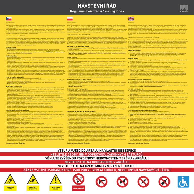 Návštěvní řád Regulamin zwiedzania / Visiting Rules Vážení návštěvníci, Szanowni Państwo, Dear visitors, srdečně Vás vítáme v areálu Dolních Vítkovic, národní kulturní a industriální památky, kde můžete kromě obhlídkových tras navštívit Bolt Tower, Malý svět techniky – U6, Velký svět techniky – Science and Technology Center, Multifunkční aulu Gong a areál Dolu Hlubina. I když je naším prvořadým cílem umožnit Vám co nejlepší zážitek a osobní komfort, jsme nuceni v zájmu Vaší bezpečnosti a s ohledem na charakter území usměrnit Váš pohyb zde malými omezeními. Prosíme, přečtete si proto text tohoto Návštěvního řádu a v rámci bezpečnosti Vaší a Vašich dětí jeho požadavky respektujte a dodržujte. Přejeme Vám příjemnou prohlídku a mnoho pozitivních chvil při setkání s historií průmyslu. witamy Państwa serdecznie na terenie narodowego zabytku kultury i techniki Dolne Witkowice. Oprócz trasy turystycznej mogą tu Państwo również zwiedzić wieżę widokową Bolt Tower. Następnie można zwiedzić Mały świat techniki–U6, Wielki świat techniki–Science and technology center, salę wielofunkcyjną Gong i teren kopalni Hlubina. Naszym głównym celem jest zapewnienie komfortu i bezpieczeństwa wszystkich zwiedzających, dlatego wprowadzono pewne ograniczenia w zwiedzaniu. Prosimy zatem o zapoznanie się z treścią niniejszego Regulaminu i o przestrzeganie wszystkich postanowień. Życzymy Państwu miłego zwiedzania i wielu pozytywnych wrażeń podczas spotkań z historią przemysłu. welcome to the area of Lower Vítkovice, a national cultural and industrial monument where you can, apart from the tour routes, also visit Bolt Tower, Small World of Technology – U6, Big World of Technology - Science and Technology Centre, Multifunctional Hall Gong and Mine Hlubina area. Although our primary goal is to provide you with the best possible experience and personal comfort, we are compelled to restrict your movement by applying certain limitations in the interest of your safety and with regard to the nature of the area. Please, read the text of this Visiting Rules and respect and follow the rules for your safety and the safety of your children. We wish you a pleasant visit and many positive moments during the encounter with the history of industry. Vedení sdružení Dolní oblast VÍTKOVICE Zakoupením vstupenky či obdržením identifikačního náramku, je mezi návštěvníkem a Dolní oblastí VÍTKOVICE, zájmovým sdružením právnických osob, IČ: 75125285, uzavřena smlouva o prohlídce. Návštěvník se touto smlouvou zavazuje v celém areálu dodržovat následující pokyny tohoto návštěvního řádu. Prohlídky se návštěvník účastní výlučně na vlastní odpovědnost a v případě dětí do 15 let na odpovědnost doprovodu (průvodce tuto odpovědnost nepřebírá). Prohlídkové trasy v areálu jsou přístupné pouze s průvodcem, bezbariérový je vysokopecní okruh s nástavbou. Pro školy platí, že na každých 20 osob do 15 let musí být zajištěn doprovod min. 1 pedagogického dozoru. KAPACITY SKUPIN: • • rohlídky jsou realizovány ve stanovených termínech pro počet osob určený kapacitou jednotlivých prohlídek P Každý návštěvník je povinen se seznámit s Návštěvním řádem a akceptovat jej, pokud to charakter prohlídky vyžaduje, stvrdí vlastním podpisem, resp. podpisem zákonného zástupce pod formulářem „BEZPEČNOST – Prohlášení o poučení“ a poskytne patřičné údaje, formulářem předepsané. OBECNÁ PRAVIDLA: • • • • • • Areál Dolních Vítkovic je veřejně přístupný prostor s výjimkou nezrekonstruovaných technologických objektů a zařízení, kde platí přísný zákaz vstupu. Během prohlídky je každý návštěvník povinen mít u sebe platnou vstupenku a dodržovat pravidla uvedená v tomto návštěvním řádu. Uposlechnout pokynů průvodce, pohybovat se pouze v doprovodu průvodce a po průvodcem vymezené trase. Zároveň je třeba dbát zvýšené opatrnosti. Během řízených prohlídek průvodcem platí přísný zákaz požívání alkoholu a zákaz kouření. Vstup do objektů v areálu může být průvodcem odepřen osobám (případně mohou být z prohlídky vykázány) pod zjevným vlivem alkoholu nebo návykových a omamných látek a osobám, jejichž chování narušuje výklad průvodce a ohrožuje bezpečnost ostatních. Každý návštěvník prohlídkové trasy obdrží ochrannou přilbu (je-li pro daný typ prohlídky požadována) a jeho povinností je individuálně si nastavit upínací mechanismus přilby tak, aby byla zajištěna dokonalá stabilita přilby na hlavě. Tuto přilbu je návštěvník povinen používat na hlavě po celou dobu prohlídky, pokud průvodce nestanoví jinak. Po ukončení prohlídky je návštěvník povinen přidělenou ochrannou přilbu vrátit na návštěvnickém centru nebo průvodcem určeném místě. VSTUP DO AREÁLU JE ZAKÁZÁN: • • • Osobám mladším 15 let bez doprovodu zodpovědné osoby starší 18 let. Osobám důvodně podezřelým z opilosti nebo požití návykových látek či osobám, u nichž je důvod se domnívat, že jejich návštěva by mohla narušit veřejný pořádek apod. Návštěvníkům v silně znečištěném, nedostatečném a jinak nevhodném oděvu nebo nevhodné obuvi. Doporučujeme pevnou uzavřenou obuv. NÁVŠTĚVNÍCI JSOU POVINNI: • • • • • • • • • • Uposlechnout pokynů a příkazů průvodce a provozovatele vydaných v zájmu bezpečnosti návštěvníků a ochrany objektů a exponátů. Při neuposlechnutí budou tito návštěvníci vykázáni bez náhrady vstupného. Mimo to se vystavují nebezpečí postihu dle obecně závazně právních předpisů. Pohybovat se pouze po vymezených a označených komunikacích nebo trasách a pouze v doprovodu průvodc