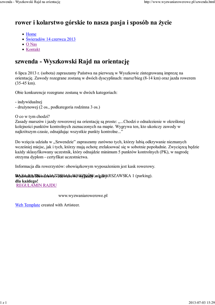 szwenda - Wyszkowski Rajd na orientację 1z1 http://www.wyzwaniarowerowe.pl/szwenda.html rower i kolarstwo górskie to nasza pasja i sposób na życie Home Świeradów 14 czerwca 2013 O Nas Kontakt szwenda - Wyszkowski Rajd na orientację 6 lipca 2013 r. (sobota) zapraszamy Państwa na pierwszą w Wyszkowie zintegrowaną imprezę na orientację. Zawody rozegrane zostaną w dwóch dyscyplinach: marsz/bieg (8-14 km) oraz jazda rowerem (35-45 km). Obie konkurencje rozegrane zostaną w dwóch kategoriach: - indywidualnej - drużynowej (2 os., podkategoria rodzinna 3 os.) O co w tym chodzi? Zasady marszów i jazdy rowerowej na orientację są proste: „...Chodzi o odnalezienie w określonej kolejności punktów kontrolnych zaznaczonych na mapie. Wygrywa ten, kto ukończy zawody w najkrótszym czasie, odnajdując wszystkie punkty kontrolne...” Do wzięcia udziału w „Szwendzie” zapraszamy zarówno tych, którzy lubią odkrywanie nieznanych wcześniej miejsc, jak i tych, którzy mają ochotę zrelaksować się w sobotnie popołudnie. Zwycięzcą będzie każdy sklasyfikowany uczestnik, który odnajdzie minimum 5 punktów kontrolnych (PK), w nagrodę otrzyma dyplom - certyfikat uczestnictwa. Informacja dla rowerzystów: obowiązkowym wyposażeniem jest kask rowerowy. BAZA RAJDU: ZAJAZD BIAS. WYSZKÓW, WARSZAWSKA 1 (parking). Wyzwania Rowerowe - Rowerowe wyjazdy wul.góry dla każdego! REGULAMIN RAJDU www.wyzwaniarowerowe.pl Web Template created with Artisteer. 2013-07-03 15:29 Szwenda - Regulamin (roboczy) 1z2 http://www.wyzwaniarowerowe.pl/szwenda-regulamin.html rower i kolarstwo górskie to nasza pasja i sposób na życie Home Świeradów 14 czerwca 2013 O Nas Kontakt Szwenda - Regulamin (roboczy) Organizatorzy : Pepisko Hufiec ZHP Wyszków Nadbużańskie Forum Samorządowe Miejsce: Zajazd "Bias", Wyszków, ul. Warszawska 1 (parking asfaltowy) Termin: 6 lipca 2013 (sobota), zapisy w miejscu imprezy godz. 9.00-10.30, start imprezy godz. 11.00 Forma: Klasyczna impreza na orientację o charakterze krajoznawczym rozegrana zostanie w kategoriach: rowery - indywidualna rowery - team - (2 osoby) rowery - rodzinna - (3 osoby) marsz - indywidualna marsz - team (2 osoby) marsz - rodzinna (3osoby) Nagrody: Statuetki, dyplomy, nagrody losowane. Program imprezy: 9.00-10.30 rozpoczęcie zapisów 10.45-11.00 odprawa techniczna, wyjaśnienie zasad imprezy, ustalenie listy startowej 11.00-15.00 zawody INO 16.00 ogłoszenie wyników i wręczenie nagród Organizatorzy zapewniają: nagrody i dyplomy dla uczestników zawodów, ciepły posiłek, materiały niezbędne do rozegrania zawodów tj. mapy kolorowe, karty startowe Zgłoszenie : termin dokonania zgłoszenia do dnia 1 lipca 2013 r. e-mailem: [email protected], lub w bazie rajdu, 2013-07-03 15:29 Szwenda - Regulamin (roboczy) 2z2 http://www.wyzwaniarowerowe.pl/szwenda-regulamin.html zgłoszenie uczestnika musi zawierać : imię, nazwisko , rok urodzenia, nazwę drużyny - teamu. Maksymalna liczba uczestników 100 osób. Ekwipunek uczestnika INO: Każdy uczestnik imprezy powinien posiadać strój dostosowany do warunków pogodowych , zegarek, ołówek i w miarę możliwości kompas. Uczestnicy w kategoriach rowerowych obowiązkowo kask rowerowy. Zasady imprezy na orientację „Szwenda”: W zalesionym terenie ustawiono 20 punktów kontrolnych w charakterystycznych miejscach wokół punktu START - META. Punkty kontrolne w terenie oznaczone są biało-czerwonymi lampionami i zaopatrzone są w znaczniki - pieczatki. Wygrywa uczestnik lub drużyna , która zaliczy wszystkie swoje punkty w jak najkrótszym czasie. Szczegółowe zasady i punktacja zostaną przekazane przed zawodami. Wyzwania Rowerowe - Rowerowe wyjazdy w góry dla każdego! www.wyzwaniarowerowe.pl Web Template created with Artisteer. 2013-07-03 15:29