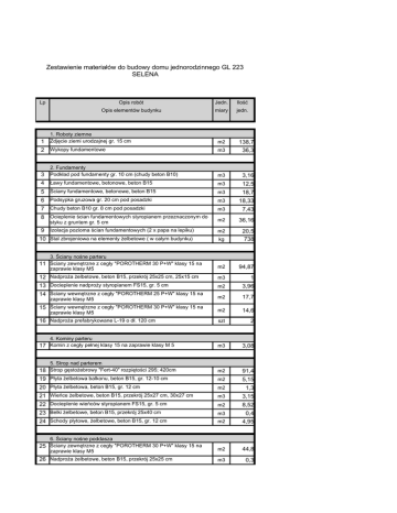Zestawienie materiałów do budowy domu jednorodzinnego GL 223 SELENA Lp Opis robót Jedn. Ilość Opis elementów budynku miary jedn. 1. Roboty ziemne 1 Zdjęcie ziemi urodzajnej gr. 15 cm m2 2 Wykopy fundamentowe m3 138,7 36,3 3 Podkład pod fundamenty gr. 10 cm (chudy beton B10) m3 3,16 4 Ławy fundamentowe, betonowe, beton B15 m3 12,5 5 Ściany fundamentowe, betonowe, beton B15 m3 18,7 6 Podsypka gruzowa gr. 20 cm pod posadzki m3 18,33 7 Chudy beton B10 gr. 8 cm pod posadzki m3 7,43 m2 36,16 m2 kg 20,5 738 m2 94,87 12 Nadproża żelbetowe, beton B15, przekrój 25x25 cm, 25x15 cm m3 1 13 Docieplenie nadproży styropianem FS15, gr. 5 cm m2 3,96 m2 17,7 m2 14,6 szt 2 m3 3,08 18 Strop gęstożebrowy "Fert-40" rozpiętości 295; 420cm m2 91,4 19 Płyta żelbetowa balkonu, beton B15, gr. 12-10 cm m2 5,15 20 Płyta żelbetowa, beton B15, gr. 12 cm m2 1,3 21 Wieńce żelbetowe, beton B15, przekrój 25x27 cm, 30x27 cm m3 3,15 22 Docieplenie wieńców styropianem FS15, gr. 5 cm m2 8,52 23 Belki żelbetowe, beton B15, przekrój 25x40 cm m3 24 Schody płytowe, żelbetowe, beton B15, gr. 12 cm m2 0,4 4,95 m2 44,8 m3 0,3 2. Fundamenty 8 Ocieplenie ścian fundamentowych styropianem przeznaczonym do styku z gruntem gr. 5 cm 9 Izolacja pozioma ścian fundamentowych (2 x papa na lepiku) 10 Stal zbrojeniowa na elementy żelbetowe ( w całym budynku) 3. Ściany nośne parteru 11 Ściany zewnętrzne z cegły "POROTHERM 30 P+W" klasy 15 na zaprawie klasy M5 14 Ściany wewnętrzne z cegły "POROTHERM 25 P+W" klasy 15 na zaprawie klasy M5 15 Ściany wewnętrzne z cegły "POROTHERM 30 P+W" klasy 15 na zaprawie klasy M5 16 Nadproża prefabrykowane L-19 o dł. 120 cm 4. Kominy parteru 17 Komin z cegły pełnej klasy 15 na zaprawie klasy M 5 5. Strop nad parterem 6. Ściany nośne poddasza 25 Ściany zewnętrzne z cegły "POROTHERM 30 P+W" klasy 15 na zaprawie klasy M5 26 Nadproża żelbetowe, beton B15, przekrój 25x25 cm 27 Docieplenie nadproży styropianem FS15, gr. 5 cm m2 1,18 m3 1,67 29 Docieplenie wieńców styropianem FS15, gr. 5 cm m2 6,71 30 Słupki kotwiące żelbetowe, beton B15, przekrój 25x25 cm m3 31 Docieplenie słupków kotwiących styropianem FS15, gr. 5 cm m2 0,38 1,5 m3 3,73 m3 1,03 m3 0,12 35 Drewno konstrukcyjne więźby klasy C30 m3 36 Konstrukcja dachu ( w rozwinięciu) m2 10 214 37 Krycie dachówką m2 214 38 Folia wiatroizolacyjna m2 214 39 Rynny f 100 mb 36 40 Rury spustowe f 70 mb 19,3 41 Wyłaz dachowy o wymiarach min. 80 x 80 cm szt 1 42 Okna połaciowe o wymiarach ościeżnicy 78x140 cm szt 3 43 Podbitka drewniana, heblowana gr. 2 cm m2 44 Podłoga z desek na jętkach gr. 3 cm m2 55,56 36,6 m2 30,95 szt 4 47 Izolacja pozioma przeciwwilgociowa (2 x papa na lepiku) m2 91,63 48 Wełna mineralna PAROC VL , gr. 10 cm m2 49 Wylewka betonowa, beton B15, gr. 6, 5 cm, zatarta na gładko m3 91,62 5,96 50 Płyta gipsowo-włóknowa FERMACELL gr. 1, 0 cm m2 9,4 51 Wełna mineralna gr. 12 cm m2 9,4 52 Płyta gipsowo-włóknowa FERMACELL gr. 2, 0 cm m2 53 Styropian FS 15 gr. 2 cm m2 9,4 9,4 m2 51,55 szt 4 56 Styropian FS 20 gr. 3 cm m2 57 Wylewka betonowa, beton B15, gr. 3, 5 cm, zatarta na gładko m3 70,32 2,47 28 Wieńce opaskowe żelbetowe, beton B15, przekrój 25x25, 25x15 cm 7. Kominy poddasza 32 Komin z cegły pełnej klasy 15 na zaprawie klasy M5 33 Komin z cegły klinkierowej klasy 15 na zaprawie klasy M5 ( nad dachem) 34 Nakrywy betonowe kominów, beton B15 8. Więźba 9. Dach 10. Ściany działowe parteru 45 Ściana gr. 12 cm z cegły pełnej klasy 10 na zaprawie klasy M2 46 Nadproża prefabrykowane L-19 o dł. 120 cm 11. Podłoga na parterze 12. Ścianki lukarny 13. Ściany działowe poddasza 54 Ściana gr. 12 cm z cegły dziurawki klasy 5 na zaprawie klasy M2 55 Nadproża prefabrykowane L-19 o dł. 120 cm 14. Podłoga na poddaszu 15. Roboty wykończeniowe Tynki 58 Tynk cementowo-wapienny na ścianach od wewnątrz m2 391,14 59 Tynk cementowo-wapienny na sufitach m2 72,92 m2 176,3 61 Ocieplenie cokołu styropianem gr. 5, 0cm m2 10,51 62 Oboknia z wełny mineralnej "PAROC RAL 4", gr. 5cm m2 2,45 63 Wełna mineralna "PAROC IL" gr. 12 cm m2 119,27 64 Wełna mineralna "PAROC IL" gr. 5 cm m2 104,88 m2 104,88 66 Posadzka z płytek gresowych m2 45 67 Posadzka z paneli podłogowych m2 118,25 68 Trepy dębowe na schodach m2 4,25 69 Styropian FS 15 gr. 2 cm m2 4,56 70 Izolacja pozioma przeciwwilgociowa (2 x papa na lepiku) m2 5,2 71 Styropian FS 20 gr. 3 cm m2 4,95 72 Wylewka betonowa, beton B15, gr. 4 cm, zatarta na gładko m3 0,17 73 Posadzka z płytek gresowych m2 5,6 74 Balustrada na schodach wysokości 90 cm mb 75 Balustrada na balkonie wysokości 100 cm mb 5,8 6,2 76 Okna o wymiarach ościeżnicy 56, 5x53, 5 cm szt 4 77 Okna o wymiarach ościeżnicy 116, 5x143, 5 cm szt 5 78 Okna o wymiarach ościeżnicy 236, 5x173, 5 cm szt 1 79 Drzwi wewnętrzne pokojowe o wymiarach ościeżnicy 88x205 cm szt 4 80 Drzwi wewnętrzne pokojowe o wymiarach ościeżnicy 98x205 cm szt 1 81 Drzwi wewnętrzne łazienkowe o wymiarach ościeżnicy 88x205 cm szt 2 82 Drzwi wewnętrzne łazienkowe o wymiarach ościeżnicy 78x205 cm szt 1 83 Drzwi wewnętrzne pełne o wymiarach ościeżnicy 78x205 cm szt 1 84 Drzwi zewnętrzne o wymiarach ościeżnicy 96, 5x234 cm szt 1 85 Drzwi balkonowe o wymiarach ościeżnicy 96, 5x219 cm szt 2 86 Drzwi balkonowe o wymiarach ościeżnicy 96, 5x234 cm szt 1 szt 1 Docieplenie ścian zewnętrznych 60 Ocieplenie ścian zewnętrznych wełną mineralną "PAROC RAL 4", gr. 10 cm Sufit podwieszany + skosy poddasza 65 Płyta gipsowo-włóknowa FERMACELL na ruszcie stalowym gr. 1, 0 cm Posadzki Balkon Balustrady 16. Okna i drzwi 87 Brama garażowa uchylna WIŚNIOWSKI o wymiarach otworu 250x207 cm 88 Wyłaz strychowy o wymiarach 70x80 cm szt 1 89 Parapety zewnętrzne mb 90 Parapety wewnętrzne mb 11,8 11,8 91 Schody zewnętrzne m2 10,9 92 Kostka brukowa gr. 6 cm m2 6,62 93 Palisady 12x12x40 cm mb 35,62 94 Tarasy zewnętrzne m2 13,7 17. Roboty terenowe 95 Kostka brukowa gr. 6 cm m2 96 Palis