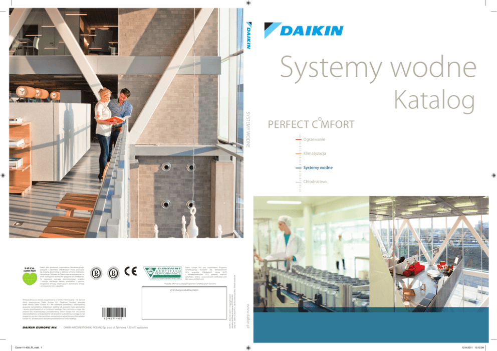 Systemy wodne SYSTEMY WODNE Katalog PERFECT C MFORT Ogrzewanie Klimatyzacja Systemy wodne Daikin jako producent wyposażenia klimatyzacyjnego, sprężarek i czynników chłodniczych może poszczycić się znaczną aktywnością w zakresie ochrony środowiska naturalnego. Od wielu lat Daikin stara się wprowadzać na rynek rozwiązania techniczne przyjazne dla środowiska. To wyzwanie wymaga ekonomicznego projektu i rozwoju szerokiego zakresu produktów i systemu zarządzania energią, obejmujących zachowanie energii i zmniejszenie ilości odpadów. Daikin Europe N.V. jest uczestnikiem Programu Certyfikującego Eurovent dla klimatyzatorów (AC), zespołów chłodzących cieczą (LCP) i klimakonwektorów (FC); sprawdź ważność certyfikatu online: www.eurovent-certification.com lub: www.certiflash.com Produkty VRV® nie są objęte Programem Certyfikacyjnym Eurovent. Dystrybucja produktów Daikin: DAIKIN AIRCONDITIONING POLAND Sp. z o.o. ul. Taśmowa 7, 02-677 warszawa Cover-11-400_PL.indd 1 www.daikin.pl Niniejsza broszura została przygotowana w formie informacyjnej i nie stanowi oferty prawomocnej Daikin Europe N.V. Zawartość broszury powstała dzięki wiedzy Daikin Europe N.V. Nie udzielamy pośredniej i bezpośredniej gwarancji na kompletno, dokładność, rzetelno lub stosowno treści, produktów i serwisu przedstawionych w niniejszym katalogu. Dane techniczne mogą ulec zmianie bez wcześniejszego powiadomienia. Daikin Europe N.V. nie ponosi odpowiedzialności za bezpośrednie lub pośrednie uszkodzenia, wynikające z lub związane z użyciem i/lub sposobem interpretacji niniejszej broszury. Firma Daikin Europe N.V. posiada prawa autorskie przedstawione w treści katalogu. ECPPL11-400 • CD • 03 /11 • Copyright Daikin Aktualna publikacja zastępuje ECPPL09-400. Odp. ed.: Daikin Europe N.V., Zandvoordestraat 300, B-8400 Oostende Chłodnictwo 12-8-2011 13:12:08 Bez względu na wielkość obiektu oraz jego zapotrzebowanie chłodnicze, system wody lodowej firmy DAIKIN, spełni wszystkie wymagania. To systemy, których wartość potwierdzają wielorakie zastosowania – począwszy od obiektów przemysłowych, poprzez hurtownie i magazyny, budynki hotelowe po domy towarowe. Pieczołowity rozwój dokładnie dostosowanych kombinacji sprężarka/czynnik, pozwoliły firmie DAIKIN na wyprodukowanie kompletnej gamy agregatów wody lodowej - zoptymalizowanych do zastosowania z czynnikiem chłodniczym : R-134a, R-407C i R-410A. Agregaty wody lodowej oferują najwyższy możliwy poziom wielofunkcyjności i kontroli - odzwierciedlający zaawansowaną technologię. Wyjątkowe dzięki swojej precyzji, mocy, niskiemu poziomowi hałasu roboczego, łatwej obsłudze i niskich kosztach pracy, agregaty DAIKIN gwarantują pewną i bezpieczną drogę do uzyskania we wnętrzach komfortowego, czystego i spójnego środowiska. Jako producent, który wytwarza własne czynniki chłodnicze i sprężarki, Daikin ma całkowitą kontrolę nad wszystkimi etapami produkcji. Unikalne połączenie zaawansowanej technologii, doświadczenia i niezawodności, sprawia, że Daikin jest oczywistym wyborem i długoterminowym rozwiązaniem dla profesjonalistów. Spis treści OFERTA AGREGATÓW CHŁODZONYCH POWIETRZEM 04 OFERTA AGREGATÓW CHŁODZONYCH WODĄ 06 OFERTA OPCJI 08 OFERTA WYPOSAŻENIA DODATKOWEGO 10 INFORMACJE NA TEMAT DAIKIN JEDNOSTKA SKRAPLAJĄCA 76 CHŁODZONE WODĄ 82 AGREGAT Z ODDZIELNYM SKRAPLACZEM 106 D.I.C.N. 116 12 MODUŁ HYDRAULICZNY I ZBIORNIK BUFOROWY 117 ŚWIADOMOŚĆ ŚRODOWISKOWA 13 KLIMAKONWEKTORY 118 ODZYSK CIEPŁA 14 WARUNKI POMIARÓW 140 NIEZAWODNOŚĆ & EFEKTYWNOŚĆ 16 AGREGATY CHŁODZONE POWIETRZEM 18 3 AGREGATY SKRAPLAJĄCE ŚRUBOWA R-134a ERAD120-460E-SL 4 1 1 1 1 2 EWYD250-580BZSS 1 1 EWAD240-600D-XR 2 1 1 2 2 2 EWAD250-620D-XS 2 290 286 300 299 310 309 2 2 2 280 275 300 302 2 250 247 2 2 260 261 280 275 300 298 280 278 2 250 245 2 250 252 1 1 1 2 2 300 296 310 307 258 240 236 281 250 252 260 254 230 231 2 2 2 2 2 2 2 2 22 2 2 EWAD330-520BZSS/SL 2 EWAD330-520BZXS/XL/XR EWAD670-C18CZXS/XL EWAD640-C17CZXR EWAD650-C20C-SS/SL EWAD620-C19C-SR EWAD760-C22C-XS/XL EWAD740-C22C-XR EWAD820-C16C-PS/PL EWAD810-C16C-PR 1 1 1 320 321 260 256 1 310 312 1 250 249 1 300 296 2 240 238 2 250 253 270 265 270 271 1 2 270 272 240 243 225 210 211 210 209 180 183 180 182 199 2 230 234 2 2 2 270 270 266 270 270 273 260 256 270 274 290 289 290 291 290 292 297 297 250 254 2 2 310 306 EWYD250-570BZSL 250 248 1 230 225 1 220 219 1 180 183 2 2 300 295 1 1 2 230 231 1 1 2 250 252 EWAD210-490D-SX 210 203 1 165 14 009 8.5 007 7.1 013 13.2 011 11 11.5 010 9.5 17,5 240 243 EWAD200-590D-HS 200 195 210 208 1 2 2 220 219 1 2 2 210 214 1 210 209 1 200 198 1 2 190 190 1 2 200 196 1 160 163 1 160 157 2 180 177 2 2 190 187 EWAD180-530D-SL 180 184 2 2 210 209 EWAD180-530D-SR 180 177 1 1 170 165 1 1 1 130 131 1 150 152 1 2 130 136 149150 145 1 1 1 2 140 138 1 1 140 144 1 1 100 100 100 105 EUWA*5-24KBZW1 1 114 1 120 121 080 80 54 1 8 18.4 10 23.8 1 17.1 8 19.7 21 10 22.5 25 12 26.5 34.2 16 34.6 40 20 46.6 24 50 24 55.3 1 8 1 011 11 011 11.0 1 13 1 160 159 ERAD120-490E-SS 1 130 134 EWYQ080-250DAYN 1 120 116 EWAD100-410E-SS 100 101 R-410A 080 77 EWAQ080-260DAYN 1 87.7 EUWY*5-24KBZW1 1 1 1 12.5 013 13.2 11 1 10 1 010 9.5 009 9 EWAQ009-013ACW1 1 011 11 1 1 18.5 10 24 12 27 16 37 20 46 5 11.6 EWYQ009-013ACW1 009 9 EWYQ005-007ACV3 006 6 0 140 137 ŚRUBOWA R-134a 120 121 EWAD100-400E-SL 100 97.9 SCROLL EUWAC5-10FBZW1 5 11.3 R-407C EWYQ009-011ACV3 1 11.9 9.1 SCROLL R-410A 5 TYP 'SWING EWAQ009-011ACV3 1 7.75009 8.5 1 007 7.1 SCROLL R-410A Ref. 005 5.2 EWAQ005-007ACV3 006 6 Czynn. chł. Tryb 005 5.2 Spręż. 6.35 TYP 'SWING 5.65 Typ 120 116 CHŁODZONE POWIETRZEM ZEWNĘTRZNYM OFERTA AGREGATÓW CHŁODZONYCH POWIETRZEM 1 200 1 1 1 1 1 2 2 2 2 1 1 EWAD390-580D-SS 2 2 2 2 2 22 2 2 2 2 2 2 1 1 1 1 956 1,053 1,132 C12 1,251 C13 1,359 1,439 1,521 2 2 2 2 2 2 2 2 2 960 C10 C11 C13 C14 C15 C16 2 2 2 2 2 3 2 3 2 2 2 2 3 3 2 2 1 1 5 3 C21 C22 3 3 3 1,9