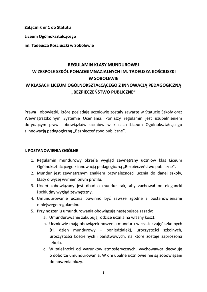 Załącznik nr 1 do Statutu Liceum Ogólnokształcącego im. Tadeusza Kościuszki w Sobolewie REGULAMIN KLASY MUNDUROWEJ W ZESPOLE SZKÓŁ PONADGIMNAZJALNYCH IM. TADEUSZA KOŚCIUSZKI W SOBOLEWIE W KLASACH LICEUM OGÓLNOKSZTAŁCĄCEGO Z INNOWACJĄ PEDAGOGICZNĄ „BEZPIECZEŃSTWO PUBLICZNE” Prawa i obowiązki, które posiadają uczniowie zostały zawarte w Statucie Szkoły oraz Wewnątrzszkolnym Systemie Oceniania. Poniższy regulamin jest uzupełnieniem dotyczącym praw i obowiązków uczniów w klasach Liceum Ogólnokształcącego z innowacją pedagogiczną „Bezpieczeństwo publiczne”. I. POSTANOWIENIA OGÓLNE 1. Regulamin mundurowy określa wygląd zewnętrzny uczniów klas Liceum Ogólnokształcącego z innowacją pedagogiczną „Bezpieczeństwo publiczne”. 2. Mundur jest zewnętrznym znakiem przynależności ucznia do danej szkoły, klasy o wyżej wymienionym profilu. 3. Uczeń zobowiązany jest dbać o mundur tak, aby zachował on elegancki i schludny wygląd zewnętrzny. 4. Umundurowanie ucznia powinno być zawsze zgodne z postanowieniami niniejszego regulaminu. 5. Przy noszeniu umundurowania obowiązują następujące zasady: a. Umundurowanie zakupują rodzice ucznia na własny koszt. b. Uczniowie mają obowiązek noszenia munduru w czasie: zajęć szkolnych (tj. dzień mundurowy – poniedziałek), uroczystości szkolnych, uroczystości kościelnych i państwowych, na które zostaje zaproszona szkoła. c. W zależności od warunków atmosferycznych, wychowawca decyduje o doborze umundurowania. W dni upalne uczniowie nie są zobowiązani do noszenia bluzy. 1 d. Wolno używać tylko te przedmioty mundurowe, które zostały zatwierdzone przez Rade Pedagogiczną Zespołu Szkół Ponadgimnazjalnych w Sobolewie. e. Mundur powinien być dopasowany do sylwetki. f. Mundur ma być czysty i wyprasowany. 6. Uczniowie klas mundurowych są zobowiązani do reprezentowania szkoły podczas wyżej wymienionych uroczystości. O formie uczestnictwa decyduje Dyrektor Szkoły. 7. W przypadku rażącego naruszenia niniejszego regulaminu, Statutu Szkoły, Rada Pedagogiczna w porozumieniu z Dyrektorem Liceum i Samorządem Uczniowskim ma prawo ukarać ucznia zgodnie ze Statutem Szkoły. II. PODSTAWOWY UBIÓR UCZNIA 1. Podstawowym ubiorem ucznia klasy Liceum Ogólnokształcącego z innowacją pedagogiczną „Bezpieczeństwo publiczne” jest mundur wyjściowy składający się z: a. Czapki z daszkiem koloru czarnego z białym napisem na czarnym tle „Bezpieczeństwo Publiczne”. b. Munduru moro z umieszczonym na lewym rękawie logo szkoły i umieszczoną nad lewą kieszenią naszywką „Bezpieczeństwo Publiczne”. c. T-shirtu’u koloru czarnego z naszywką „Bezpieczeństwo Publiczne” d. Pasa głównego, skórzanego koloru czarnego. e. Na mundurze wyjściowym z prawej strony nad kieszenią w kolejnych latach nauki będą umieszczone dodatkowe emblematy dotyczące: pierwszej pomocy w klasie pierwszej, strzelectwa w klasie drugiej, samoobrony w klasie trzeciej. f. Butów wojskowych koloru czarnego. g. W okresie jesienno-zimowym obowiązuje ciepła czapka, szalik i rękawiczki w kolorze czarnym bez żadnego nadruku i ciemne wierzchnie okrycie. 2 2. Zabrania się uczniom klas mundurowych: a. Noszenia podstawowego ubioru mundurowego w połączeniu z elementami ubioru cywilnego lub innych mundurów: noszenia rozpuszczonych włosów (włosy winny być związane tak, aby nie opadały na mundur) noszenia do munduru kolczyków, bransoletek i innych ozdób stosowania wyrazistego makijażu noszenia rozwiązanych butów, rozpiętego munduru, munduru bez paska, podwiniętych rękawów, trzymania rąk w kieszeni, wypuszczonych szelek – w dniu noszenia munduru. b. Użytkowania przedmiotów mundurowych niezgodnie z ich przeznaczeniem. c. Trwałego lub tymczasowego deformowania części umundurowania w sposób nieuzasadniony z ich przeznaczeniem, np. poprzez nadmierne wypychanie zewnętrznych kieszeni. III. WYMOGI W STOSUNKU DO UCZNIÓW KLAS MUNDUROWYCH 1. Uczeń ma prawo: a. Rozwijania swoich zainteresowań pod kierunkiem nauczyciela. b. Do pełnego korzystania z lekcji, które stanowią główną formę nauczania i wychowania. c. Do poszanowania swojej godności osobistej, swojej własności i zdrowia. d. Wypowiadania się zgodnie ze swoimi przekonaniami. 2. Uczeń ma obowiązek: a. Dbać o dobre imię szkoły. b. Przestrzegać zasad bezpieczeństwa i porządku w czasie lekcji. c. Przestrzegać zasad bezpieczeństwa zgodnie z obowiązującymi w szkole regulaminami. d. Ma obowiązek chodzić ubrany schludnie i estetycznie. e. Punktualnego przychodzenia na zajęcia lekcyjne, a w przypadku zastępstw powinni przebywać w wyznaczonych miejscach. f. Zachowywać się zgodnie z normami etyki chrześcijańskiej i przeciwstawiać się przejawom wulgarności i brutalności. g. Szanować poglądy innych ludzi, ich godność i wolność. 3 3. Uczniowie klas objętych szkoleniem bezwzględnie muszą się podporządkować przepisom BHP dotyczącym pobytu na terenie strzelnicy, przemarszach poza teren szkoły, lub transportu na zajęcia poza teren szkoły. 4. W czasie zajęć poza terenem szkoły, uczniowie zobowiązani są do bezwzględnego przestrzegania regulaminów oraz podporządkowania się poleceniom kadry szkoleniowej. 5. Zabrania się wykorzystania wiedzy teoretycznej i praktycznej nabytej w trakcie szkolenia praktycznego i teoretycznego mogących naruszyć bezpieczeństwo szkoły, oraz które mogłoby zagrażać życiu bądź zdrowiu osób drugich. 4 IV. OZNAKI KLASOWE ORAZ ZASADY ICH NOSZENIA 1. Znakiem ucznia klasy mundurowej „Bezpieczeństwo Publiczne” jest naszywka wykonana wg wzoru zatwierdzonego przez Dyrekcję Szkoły zawierająca nazwę szkoły, noszona na lewym rękawie koszuli i bluzy. 2. Przyjęty w szkole regulamin pozwala uczniom klas mundurowych otrzymywać kolejne stopnie awansu. W momencie rozpoczęcie nauki uczeń otrzymuje stopień Kadeta. Kolejne stopnie awansu otrzymuje po uzyskaniu