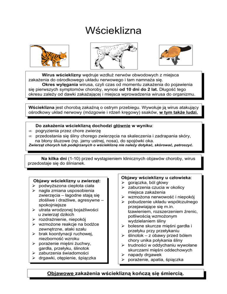 Wścieklizna Wirus wścieklizny wędruje wzdłuż nerwów obwodowych z miejsca zakażenia do ośrodkowego układu nerwowego i tam namnaża się. Okres wylęgania wirusa, czyli czas od momentu zakażenia do pojawienia się pierwszych symptomów choroby, wynosi od 10 dni do 2 lat. Długość tego . okresu zależy od dawki zakażającej i miejsca wprowadzenia wirusa do organizmu. Wścieklizna jest chorobą zakaźną o ostrym przebiegu. Wywołuje ją wirus atakujący ośrodkowy układ nerwowy (mózgowie i rdzeń kręgowy) ssaków, w tym także ludzi. • • Do zakażenia wścieklizną dochodzi głównie w wyniku: pogryzienia przez chore zwierzę przedostania się śliny chorego zwierzęcia na skaleczenia i zadrapania skóry, na błony śluzowe (np. jamy ustnej, nosa), do spojówki oka. Zwierząt chorych lub podejrzanych o wściekliznę nie należy dotykać, skórować, patroszyć. Na kilka dni (1-10) przed wystąpieniem klinicznych objawów choroby, wirus przedostaje się do ślinianek. Objawy wścieklizny u zwierząt: podwyższona ciepłota ciała nagła zmiana usposobienia zwierzęcia – łagodne stają się złośliwe i drażliwe, agresywne – spokojniejsze utrata wrodzonej bojaźliwości u zwierząt dzikich rozdrażnienie, niepokój wzmożone reakcje na bodźce zewnętrzne, ataki szału brak koordynacji ruchowej, niezborność wzroku porażenie mięśni żuchwy, gardła, przełyku, ślinotok zaburzenia świadomości drgawki, otępienie, śpiączka Objawy wścieklizny u człowieka: gorączka, ból głowy zaburzenia czucia w okolicy miejsca zakażenia wzmożona nerwowość i niepokój pobudzenie układu współczulnego przejawiające się m.in. łzawieniem, rozszerzeniem źrenic, potliwością wzmożonym wydzielaniem śliny bolesne skurcze mięśni gardła i przełyku przy przełykaniu ślinotok – z obawy przed bólem chory unika połykania śliny trudności w oddychaniu wywołane skurczami mięśni oddechowych napady drgawek porażenie, apatia, śpiączka Objawowe zakażenia wścieklizną kończą się śmiercią. W przypadku pogryzienia człowieka przez chore lub podejrzane o wściekliznę zwierzę należy: pozwolić aby krew przez jakiś czas swobodnie wypływała z rany przemyć ranę wodą z mydłem zdezynfekować ranę nałożyć opatrunek zgłosić się do lekarza Lekarz ocenia stopień narażenia pacjenta na zakażenie wścieklizną i kwalifikuje do ewentualnych szczepień Szczepionkę przeciwko wściekliźnie podaje się ludziom domięśniowo w 5 dawkach wg schematu: 0,3,7,14,30 dnia. W przypadku gdy pogryzienia są rozległe, dotyczą głowy, karku, rąk oprócz szczepionki podaje się surowicę z przeciwciałami. Zwierzęta podejrzane o wściekliznę poddaje się piętnastodniowej obserwacji. W przypadku zwierząt padłych przeprowadza się badania laboratoryjne. Jeżeli zwierzę okaże się zdrowe, szczepienie pacjenta można przerwać. Aby uniknąć wścieklizny należy: regularnie szczepić zwierzęta domowe – psy podlegają obowiązkowym szczepieniom 1 raz w roku; dla kotów szczepienia są zalecane nie dopuszczać do tego, aby psy i koty były wypuszczane z domu bez dozoru unikać kontaktów z obcymi zwierzętami domowymi i dzikimi – nie dotykać ich, nawet jeśli zachowują się bardzo przyjaźnie Województwo warmińsko-mazurskie 2005 rok wściekliznę stwierdzono u 78 zwierząt: 39 lisów, 23 sztuk bydła, 8 jenotów, 3 kotów, 2 psów, 2 nietoperzy, 1 konia przeciwko wściekliźnie zaszczepiono 885 osób 2006 rok wściekliznę stwierdzono u 31 zwierząt: 13 jenotów,10 lisów, 4 kotów, 2 sztuk bydła, 1 psa, 1 kuny przeciwko wściekliźnie zaszczepiono 763 osoby Oddział Promocji Zdrowia i Oświaty Zdrowotnej Wojewódzkiej Stacji Sanitarno-Epidemiologicznej 10-561 Olsztyn, ul. Żołnierska 16, tel. 089/524-83-77, 089/524-83-85 tel/fax 089/527-99-24, e-mail: [email protected] tekst: A.Wasilewska konsultacja merytoryczna: lek.wet. J. Dzisko grafika: W.Korejwo