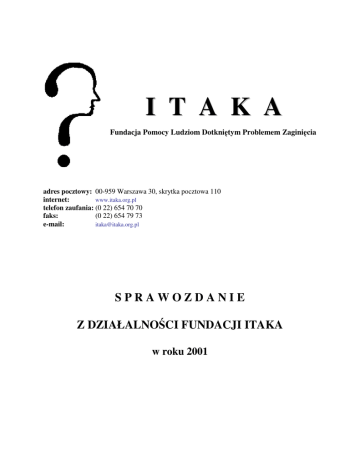 I T A K A Fundacja Pomocy Ludziom Dotkni tym Problemem Zagini cia adres pocztowy: 00-959 Warszawa 30, skrytka pocztowa 110 internet: www.itaka.org.pl telefon zaufania: (0 22) 654 70 70 faks: (0 22) 654 79 73 e-mail: [email protected] SPRAWOZDANIE Z DZIAŁALNO CI FUNDACJI ITAKA w roku 2001 I. INFORMACJE OGÓLNE: NAZWA ORGANIZACJI: ITAKA - Fundacja Pomocy Ludziom Dotkni tym Problemem Zagini cia adres do korespondencji: 00-959 Warszawa 30, skr.poczt.110 TELEFON: (022) 654 70 70 FAX: (022) 654 79 73 MAIL: [email protected] WEB SITE: www.itaka.org.pl, www.zaginieni.pl DATA FORMALNEJ REJESTRACJI: 22.03.1999r. NUMER KSI GI REJESTROWEJ: sygn.XVI Nr.Rej.F-150/99 nr 5655 NUMER REGON: 014940850 CELE STATUTOWE FUNDACJI: * nieodpłatne informowanie społecze stwa o problemie zagini cia oraz prowadzenie aktywnej akcji prewencyjnej w rodowiskach zagro onych zagini ciem; * nieodpłatna pomoc rodzinom osób zaginionych w poszukiwaniach bliskiej osoby i w organizacji takich poszukiwa ; * nieodpłatne publikowanie i kolportowanie zdj osób zaginionych, szczególnie dzieci; * słu enie nieodpłatn rad , informacj , porad prawn i psychicznym wsparciem dla rodzin osób zaginionych; * udzielanie finansowego lub rzeczowego wsparcia rodzinom osób zaginionych, które wskutek zagini cia bliskiej osoby popadły w trudne warunki yciowe; * organizowanie akcji prewencyjnych w rodkach masowego przekazu dla rodowisk zagro onych zagini ciem (małe dzieci, młodzie , osoby starsze i chore); * współpraca z instytucjami i organizacjami w kraju i za granic , których cele s zgodne z celami statutowymi Fundacji. Sprawozdanie z działalno ci fundacji ITAKA II. OPIS DZIAŁALNO CI STATUTOWEJ . W roku 2001 prowadzili my nast puj ce działania: 1. Telefon Zaufania dla rodzin osób zaginionych – projekt realizowany nieprzerwanie od pocz tku pracy Fundacji, tj. od wrze nia 1999. Przy telefonie dy uruj : prawnik, pracownik socjalny i psychologowie. Otaczaj oni rodziny osób zaginionych wszechstronn opiek . Osoba zgłaszaj ca zagini cie bliskiego uzyskuje pomoc i porad prawn , porad na temat mo liwo ci otrzymania pomocy socjalnej, wreszcie wsparcie psychiczne. Pracownicy Telefonu Zaufania informuj (telefonicznie lub listownie) o metodach poszukiwa , kontaktuj w kontaktach z policj , placówkami konsularnymi RP, si lub po rednicz o rodkami adopcyjnymi, pomagaj w kontaktach z urz dami pa stwowymi, samorz dowymi oraz s dami i prokuratur . Ich wa nym zadaniem jest równie informowanie o prawach przysługuj cych rodzinom osób zaginionych. Osobom nieporadnym pracownik socjalny pomagaj yciowo prawnik i pisa pisma i pozwy do s dów i urz dów, innym doradzaj , jak to robi . Pracownicy Telefonu Zaufania udzielaj około 50 porad tygodniowo. 2. Linia adnych Pyta – ta cz które my l Telefonu Zaufania przeznaczona jest dla osób zaginionych, o powrocie do domu lub które tego nie chc , ale zgadzaj powiadomili rodzin , e si , aby my yj . Osobom dorosłym radzimy, co zrobi , aby nie były poszukiwane. 3. Ewidencja osób zaginionych: • ka da osoba, która zgłasza telefonicznie zagini cie bliskiego, otrzymuje do wypełnienia formularz zgłoszeniowy; • formularz mo na równie pobra ze strony internetowej; • ka da rozmowa zwi zana z danym zagini ciem jest zapisywana w komputerowej bazie danych osób zaginionych Fundacji ITAKA – ka da sprawa ma tam swoj histori . W komputerowej bazie danych znajduje si około 1 000 spraw; • prowadzenie internetowej bazy osób zaginionych (znajduj si w niej informacje o 3 Sprawozdanie z działalno ci fundacji ITAKA osobach zaginionych, których rodziny wyraziły zgod na publikacj danych w internecie), baza danych publikowana jest na stronie www. zaginieni.pl. 4. Publikowanie zdj osób zaginionych, szczególnie dzieci, w rodkach masowego przekazu. 5. Projekt internetowy www.zaginieni.pl. Celem projektu jest wykorzystanie Internetu do: • publikacji fotografii osób zaginionych – internetowa baza danych osób zaginionych jest adresowana przede wszystkim do pracowników socjalnych, słu by zdrowia, policji i innych osób mog cych mie do czynienia z tzw. osobami NN; • prezentacji Fundacji i jej działa na rzecz osób zaginionych (np. Telefon Zaufania); • informowania o kampaniach i akcjach inicjowanych przez Fundacj ITAKA, które maj na celu pomoc osobom zaginionym i ich rodzinom a tak e zapobieganie zagini ciom szczególnie dzieci i młodzie y; • upowszechnienia wiedzy na temat problemów zwi zanych z zagini ciem oraz sposobów ich rozwi zywania; • uzyskania powszechnego dost pu do informacji, wiedzy i działa innych organizacji pozarz dowych w kraju i za granic , mo liwo ci współpracy z nimi; • stworzenia szybkiej drogi wymiany informacji (np. szybkie przesyłanie zdj osób zaginionych). D ymy do tego by nasze strony budziły zainteresowanie, skupiały uwag , by odwiedzało je jak najwi cej osób, co pomo e nam w poszerzeniu kr gu osób współpracuj cych z nami, a przede wszystkim przyczyni si do zwi kszenia liczby osób odnalezionych. Do ko ca roku 2001 nasze strony odwiedziło ponad 100 000 osób. 6. Wydrukowali my 30 000 ulotek, przeznaczonych dla osób zgłaszaj cych zagini cie bliskiego, ulotki rozesłali my do wszystkich jednostek Policji w Polsce. 7. Projekt „Nie uciekaj”, którego celem jest zmniejszenie zagini młodzie y w wieku 14-19 lat. Projekt składa si z: 4 Sprawozdanie z działalno ci fundacji ITAKA • akcji informacyjnej na temat problemów zwi zanych z ucieczkami nastolatków prowadzonej w mediach młodzie owych; • infolinii dla młodzie y zagro onej ucieczk oraz dla rodziców i wychowawców, infolinia działała w okresie 20.05.2001 – 30.06.2001, pracowali przy niej przeszkoleni wolontariusze – przede wszystkim studenci psychologii i pedagogiki; • warsztatów „Nie uciekaj” przeprowadzonych w kilku warszawskich gimnazjach. Adresatami warsztatów s nie tylko dzieci, ale tak e rodzice i nauczyciele. Trenerzy Fundacji (psychologowie, pedagodzy, nauczyciele) 