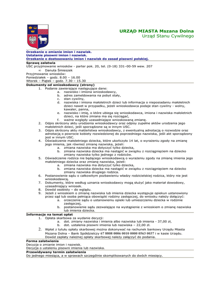 URZĄD MIASTA Mszana Dolna Urząd Stanu Cywilnego Orzekanie o zmianie imion i nazwisk. Ustalanie pisowni imion i nazwisk. Orzekanie o dostosowaniu imion i nazwisk do zasad pisowni polskiej. Sprawę załatwia USC przyjmowanie wniosków - parter pok. 20, tel. (0-18) 331–00-59 wew. 207 • Danuta Śmieszek Przyjmowanie wniosków: Poniedziałek – godz. 8.00 – 16.00 Wtorek – Piątek – godz. 7.30 – 15.30 Dokumenty od wnioskodawcy (strony) 1. Podanie zawierające następujące dane: a. nazwisko i imiona wnioskodawcy, b. adres zameldowania na pobyt stały, c. stan cywilny, d. nazwiska i imiona małoletnich dzieci lub informacja o nieposiadaniu małoletnich dzieci nawet w przypadku, jeżeli wnioskodawca podaje stan cywilny - wolny, kawaler, panna, e. nazwisko i imię, o które ubiega się wnioskodawca, imiona i nazwiska małoletnich dzieci, na które zmiana ma się rozciągać, f. ważne względy uzasadniające wnioskowaną zmianę. 2. Odpis skrócony aktu urodzenia wnioskodawcy oraz odpisy zupełne aktów urodzenia jego małoletnich dzieci, jeśli sporządzone są w innym USC. 3. Odpis skrócony aktu małżeństwa wnioskodawcy, z ewentualną adnotacją o rozwodzie oraz adnotacją o powrocie kobiety rozwiedzionej do poprzedniego nazwiska, jeśli akt sporządzony jest w innym USC. 4. Oświadczenie małoletniego dziecka, które ukończyło 14 lat, o wyrażeniu zgody na zmianę jego imienia, jak również zmianę nazwiska, jeżeli: a. zmiana nazwiska ma dotyczyć tylko dziecka, b. zmiana nazwiska dziecka ma nastąpić w związku z rozciągnięciem na dziecko zmiany nazwiska tylko jednego z rodziców. 5. Oświadczenie rodzica nie będącego wnioskodawcą o wyrażeniu zgody na zmianę imienia jego małoletniego dziecka oraz zmianę nazwiska, jeżeli: a. zmiana nazwiska ma dotyczyć tylko dziecka, b. zmiana nazwiska dziecka ma nastąpić w związku z rozciągnięciem na dziecko zmiany nazwiska drugiego rodzica. 6. Postanowienie sądu o całkowitym pozbawieniu władzy rodzicielskiej rodzica, który nie jest wnioskodawcą. 7. Dokumenty, które według uznania wnioskodawcy mogą służyć jako materiał dowodowy, uzasadniający wniosek. 8. Dowód osobisty – do wglądu. 9. Jeżeli z wnioskiem o zmianę nazwiska lub imienia dziecka występuje opiekun ustanowiony przez sąd lub osoba pełniąca obowiązki rodziny zastępczej, do wniosku należy dołączyć: a. orzeczenie sądu o ustanowieniu opieki lub umieszczeniu dziecka w rodzinie zastępczej, b. postanowienie sądu zezwalające na wystąpienie z wnioskiem o zmianę nazwiska lub imienia dziecka. Informacje na temat opłat 1. Opłata skarbowa za wydanie decyzji: a. dot. zmiany nazwiska i imienia albo nazwiska lub imienia - 37,00 zł, b. dot. ustalenia pisowni imienia lub nazwiska – 22,00 zł. 2. Wpłat z tytułu opłaty skarbowej można dokonywać na rachunek bankowy Urzędu Miasta Mszana Dolna – Bank Spółdzielczy 67 8808 0006 0010 0000 0563 0037 i w kasie Urzędu. Dowód zapłaty należnej opłaty skarbowej należy załączyć do podania. Forma załatwienia Decyzja o zmianie imion i nazwisk. Decyzja o ustaleniu pisowni imienia lub nazwiska. Przewidywany termin załatwienia Do jednego miesiąca, a w sprawach szczególnie skomplikowanych do dwóch miesięcy. Informacje na temat trybu odwoławczego Od wydanej decyzji służy stronie odwołanie do Wojewody Małopolskiego w Krakowie za pośrednictwem Burmistrza Miasta Mszana Dolna w terminie 14 dni od dnia jej doręczenia (art. 127 § 1 i 2 oraz art. 129 § 1 i 2 Kodeksu postępowania administracyjnego). Podstawa prawna 1. Ustawa z dnia 17 października 2008 r. o zmianie imienia i nazwiska (Dz. U. Z 2008 r. Nr 220, poz. 1414) 2. Art. 104 ustawy z dnia 14 czerwca 1960 r. Kodeks postępowania administracyjnego (Dz. U. z 2000 r. Nr 98, poz. 1071, z późn. zm.). 3. Ustawa z dnia 16 listopada 2006 r. o opłacie skarbowej (Dz. U. Nr 225, poz. 1635). Dostępność procedury 1. Biuletyn Informacji Publicznej Miasta Mszana Dolna. 2. Biuro Obsługi Mieszkańców Urzędu Miasta Mszana Dolna