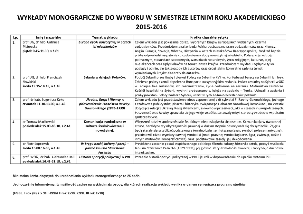 WYKŁADY MONOGRAFICZNE DO WYBORU W SEMESTRZE LETNIM ROKU AKADEMICKIEGO 2015-2016 l.p. 1. Imię i nazwisko prof.UG, dr hab. Gabriela Majewska piątek 9.45-11.30, s 2.61 2. prof.UG, dr hab. Franciszek Nowiński środa 13.15-14.45, a.1.46 3. prof. dr hab. Eugeniusz Koko czwartek 11.30-13.00, a.1.46 4. dr Tomasz Maćkowski poniedziałek 15.00-16.30, s.2.61 5. dr Piotr Koprowski środa 15.00-16.30, a.1.46 6. prof. WSIiZ, dr hab. Aleksander Hall poniedziałek 16.45-18.15, s.2.61 Temat wykładu Krótka charakterystyka Europa epoki nowożytnej w oczach jej mieszkańców Celem wykładu jest pokazanie obrazu wybranych krajów europejskich widzianych oczyma cudzoziemców. Przedmiotem analizy będą Polska postrzegana przez cudzoziemców oraz Niemcy, Anglia, Francja, Szwecja, Włochy, Hiszpania w oczach mieszkańców Rzeczypospolitej. Wykład będzie próbą odpowiedzi na pytanie co cudzoziemcy doby nowożytnej wiedzieli o Polsce, o jej ustroju politycznym, stosunkach społecznych, warunkach naturalnych, życiu religijnym, kulturze, o jej mieszkańcach oraz sądy Polaków na temat innych krajów. Przedmiotem wykładu będą nie tylko poglądy i opinie, ale także osoby ich autorów oraz drogi jakimi konkretne sądy na temat wymienionych krajów docierały do autorów. Podbój Syberii przez Rosję i pierwsi Polacy na Syberii w XVII w. Konfederaci barscy na Syberii i ich losy. Żołnierze polscy z armii Napoleona Bonaparte na syberyjskim zesłaniu. Polscy zesłańcy na Syberii w XIX w. Kolejne fale zesłańców, ich rozmieszczenie, życie codzienne na zesłaniu. Małżeństwa zesłańcze. Kościół katolicki na Syberii, wybitni proboszczowie, księża na zesłaniu – Tunka. Ucieczki z zesłania i próby powstań. Polscy badacze Syberii, udział w tych badaniach zesłańców polskich. Celem wykładu jest przedstawienie nieco zapomnianej dziś sylwetki F. Rawity-Gawrońskiego, jednego z czołowych publicystów, pisarza i historyka, związanego z obozem Narodowej Demokracji, na kwestie dotyczące relacji z Ukrainą, Rosją i Niemcami, zarówno w przeszłości, jak i w czasach mu współczesnych. Poczytność prac Rawity sprawiała, że jego wizje współkształtowały mity i stereotypy obecne w polskim społeczeństwie. Większość ludzi w społeczeństwie feudalnym nie posługiwała się pismem. Komunikacja w ówczesnej sztuce, heraldyce czy obyczajowości prawnej w dużym stopniu odwoływała się do symboliki. Zajęcia będą starały się przybliżyć podstawową terminologię semiotyczną (znak, symbol, pole semantyczne); przedstawić różne wymiary dawnej symboliki (znaki prawne; symbolikę barw, figur, zwierząt, roślin i innych motywów ikonograficznych) oraz podstawowe zasady jej dekodowania. Przybliżona zostanie postać współczesnego polskiego filozofa kultury, historyka sztuki, poety i myśliciela Janusza Stanisława Pasierba (1929-1993), jej główne sfery działalności twórczej i fascynacje duchowointelektualne. Poznanie historii opozycji politycznej w PRL i jej roli w doprowadzeniu do upadku systemu PRL. Syberia w dziejach Polaków. Ukraina, Rosja i Niemcy w piśmiennictwie Franciszka RawityGawrońskiego (1846-1930) Komunikacja symboliczna w kulturze średniowiecznej i nowożytnej. W kręgu nauki, kultury i poezji – postać Janusza Stanisława Pasierba Historia opozycji politycznej w PRL Minimalna liczba chętnych do uruchomienia wykładu monograficznego to 25 osób. Jednocześnie informujemy, iż możliwość zapisu na wykład mają osoby, dla których realizacja wykładu wynika w danym semestrze z programu studiów. (HSSL II rok (N) 2 x 30; HSSM II rok 2x30; KSSL III rok 6x30)