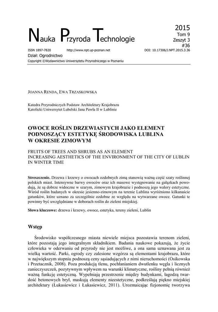 N auka ISSN 1897-7820 P rzyroda T 2015 echnologie http://www.npt.up-poznan.net Tom 9 Zeszyt 3 #36 DOI: 10.17306/J.NPT.2015.3.36 Dział: Ogrodnictwo Copyright ©Wydawnictwo Uniwersytetu Przyrodniczego w Poznaniu JOANNA RENDA, EWA TRZASKOWSKA Katedra Przyrodniczych Podstaw Architektury Krajobrazu Katolicki Uniwersytet Lubelski Jana Pawła II w Lublinie OWOCE ROŚLIN DRZEWIASTYCH JAKO ELEMENT PODNOSZĄCY ESTETYKĘ ŚRODOWISKA LUBLINA W OKRESIE ZIMOWYM FRUITS OF TREES AND SHRUBS AS AN ELEMENT INCREASING AESTHETICS OF THE ENVIRONMENT OF THE CITY OF LUBLIN IN WINTER TIME Streszczenie. Drzewa i krzewy o owocach ozdobnych zimą stanowią ważną część szaty roślinnej polskich miast. Intensywne barwy owoców oraz ich masowe występowanie na gałązkach powodują, że są dobrze widoczne w szarym, zimowym krajobrazie i podnoszą jego walory estetyczne. Wśród roślin badanych w okresie jesienno-zimowym na terenie Lublina wyróżniono kilkanaście gatunków, które uznano za szczególnie ozdobne ze względu na wytwarzane owoce. Gatunki te powinny być uwzględniane w doborach roślin do zieleni miejskiej. Słowa kluczowe: drzewa i krzewy, owoce, estetyka, tereny zieleni, Lublin Wstęp Środowisko współczesnego miasta niewiele miejsca pozostawia terenom zieleni, które pozostają jego integralnym składnikiem. Badania naukowe pokazują, że życie człowieka w oderwaniu od przyrody nie jest możliwe, a ona sama uznawana jest za wielką wartość. Parki, ogrody czy zalesione wzgórza są elementami krajobrazu, które w największym stopniu podnoszą ceny sąsiadujących z nimi nieruchomości (Osikowska i Przetacznik, 2008). Poza produkcją tlenu, pochłanianiem dwutlenku węgla i licznych zanieczyszczeń, pozytywnym wpływem na warunki klimatyczne, rośliny pełnią również ważną funkcję estetyczną. Wypełniają przestrzenie między budynkami, łagodzą twardość betonowych brył, maskują elementy nieestetyczne, podkreślają piękno miejskiej architektury (Łukasiewicz i Łukasiewicz, 2011). Urozmaicając fizjonomię tworzywa 2 Renda, J., Trzaskowska, E. (2015). Owoce roślin drzewiastych jako element podnoszący estetykę środowiska Lublina w okresie zimowym. Nauka Przyr. Technol., 9, 3, #36. DOI: 10.17306/J.NPT.2015.3.36 budującego tkankę miejską, wpływają odprężająco na mieszkańców (Sutkowska, 2006). Roślinność drzewiasta środowiska miejskiego obfituje w gatunki obce i kultywary, które są uważane za bardziej odporne na spotykane tu niekorzystne czynniki niż rodzime drzewa i krzewy (Borowski 2012; Borowski i Pstrągowska, 2009; Zimny, 2005). Duża różnorodność na poziomie rodzajowym i gatunkowym pozwala zachować roślinność w dobrym stanie w razie inwazji szkodników czy chorób, ale też jest źródłem wrażeń dostarczanych przez kwiaty, liście i owoce, ich barwy, zapachy, fakturę. Gwałtowna odmiana krajobrazu następuje wraz z przejściem roślin w okres spoczynku zimowego, który jest sygnalizowany zrzucaniem liści. Wtedy właśnie przestrzeń miasta staje się monotonna, szaro-brunatna i odbierana jako smutna. Doznań mogą jeszcze dostarczać te elementy, które są wyraziście zabarwione: igły lub łuski roślin nagonasiennych, kora i nagie pędy drzew i krzewów okrytonasiennych oraz pozostające na gałązkach owoce. Wśród nich istotne wydają się zwłaszcza te owoce, które są wyraziście, jaskrawo wybarwione i u niektórych gatunków mogą się utrzymywać na gałązkach przez okres kilku miesięcy. Celem opracowania było wytypowanie gatunków i odmian roślin drzewiastych o ozdobnych owocach, które mogą pod względem estetycznym wzbogacić krajobraz miast położonych we wschodniej Polsce w okresie zimowym. Istotne są tu szczególnie gatunki, u których owoce pojawiają się licznie, dając efekt barwnych plam, oraz te, u których pozostają długo na gałązkach. Dla wybrania taksonów o największej wartości podjęta została próba określenia trwałości ich owoców. Warto podkreślić, że dla zimowego krajobrazu miasta ważne są wszystkie rośliny drzewiaste, których owoce pozostają na gałązkach po opadnięciu liści, nawet jeśli okres ten nie jest długi. Etap ten bowiem uwidacznia często trudne do zauważenia wśród liści owoce, dając nową jakość, i w wyrazisty sposób odmienia dotychczasowy obraz przestrzeni. Gatunki o owocach najtrwalszych, jako najbardziej ozdobne w zimie, powinny znaleźć miejsce w doborach roślin do przestrzeni miast. Materiał i metody Przedmiotem badań były owoce wytwarzane przez rośliny drzewiaste. W opracowaniu uwzględniono przede wszystkim owoce soczyste. Charakteryzują się one intensywnym i różnorodnym zabarwieniem, dzięki któremu stają się źródłem pozytywnych bodźców estetycznych, szczególnie w okresie zimy. Owoce te mają zmięśniałą, miękiszową owocnię. Należą do nich pestkowce (u wiśni, czereśni), jagody (u agrestu), owoce jabłkowate (u jabłoni) oraz owoce soczyste pozorne (np. u róży). Ze względu na dużą zawartość cukrów, kwasów organicznych i witamin, a częściowo także skrobi, białka i tłuszczu, stanowią ważne źródło pokarmu dla zwierząt (np. wiewiórek czy myszy) (Jasnowska, i in., 1995). Na terenach miejskich są one pożywieniem licznych gatunków ptaków (szpaków, kwiczołów, gilów, kosów, jemiołuszek, sikor, gołębi, dzięciołów, zięb, dzwońców). Badania przeprowadzono na 41 gatunkach reprezentujących 27 rodzajów z 9 rodzin, w obrębie dwóch gromad roślin: okrytozalążkowych (Angiospermae) i nagozalążkowych (Gymnospermae). Podczas badań naszą uwagę zwróciły również barwne i dzięki temu bardzo efektowne torebki dławisza (Celastrus orbiculatus) i trzmieliny (Euonymus europaeus) oraz 3 Renda, J., Trzaskowska, E. (2015). Owoce roślin drzewiastych jako element podnoszący estetykę środowiska Lublina w okresie zimowym. Nauka Przyr. Technol., 9, 3, #36. DOI: 10.17306/J.NPT.2015.3.36 pestkowce okó