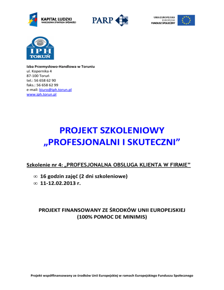 Izba Przemysłowo-Handlowa w Toruniu ul. Kopernika 4 87-100 Toruń tel.: 56 658 62 90 faks.: 56 658 62 99 e-mail: [email protected] www.iph.torun.pl PROJEKT SZKOLENIOWY „PROFESJONALNI I SKUTECZNI” Szkolenie nr 4: „PROFESJONALNA OBSŁUGA KLIENTA W FIRMIE” • 16 godzin zajęć (2 dni szkoleniowe) • 11-12.02.2013 r. PROJEKT FINANSOWANY ZE ŚRODKÓW UNII EUROPEJSKIEJ (100% POMOC DE MINIMIS) Projekt współfinansowany ze środków Unii Europejskiej w ramach Europejskiego Funduszu Społecznego OFERTA SZKOLENIOWA Serdecznie zapraszamy do zapoznania się z ofertą bezpłatnego, profesjonalnego szkolenia realizowanego w ramach ogólnopolskiego projektu „Profesjonalni i skuteczni”. Projekt realizowany jest w ramach Programu Operacyjnego Kapitał Ludzki, Priorytetu II Rozwój zasobów ludzkich i potencjału adaptacyjnego przedsiębiorstw oraz poprawa stanu zdrowia osób pracujących (Działanie 2.1. Rozwój kadr nowoczesnej gospodarki, Poddziałanie 2.1.1. „Rozwój kapitału ludzkiego w przedsiębiorstwach”), współfinansowany ze środków Unii Europejskiej w ramach Europejskiego Funduszu Społecznego. Celem Projektu jest dostosowanie kwalifikacji pracowników mikro, małych i średnich przedsiębiorstw lub osób samozatrudnionych z całej Polski do zmieniających się warunków rynkowych poprzez nabycie nowej wiedzy technicznej i umiejętności społecznych w okresie realizacji projektu. UCZESTNICY SZKOLEŃ Projekt adresowany jest do: • pracowników mikro, małych i średnich przedsiębiorstw • osób samozatrudnionych mających siedzibę na terenie Polski. Projekt skierowany jest do przedstawicieli wszystkich branż. UWAGA: Uczestnicy Projektu muszą posiadać wykształcenie: • średnie techniczne (ukończone technikum i zdany egzamin techniczny lub ukończona szkoła zawodowa i technikum uzupełniające lub ukończone liceum i technikum uzupełniające) • wyższe techniczne (studia dzienne, zaoczne lub podyplomowe). Wykształcenie techniczne musi być zgodne z profilem technicznym tj.: architektura i urbanistyka, automatyka i robotyka, biocybernetyka i inżynieria biomedyczna, biotechnologia, budowa i eksploatacja maszyn, budownictwo, elektronika, elektrotechnika, energetyka, geodezja i kartografia, górnictwo i geologia inżynierska, informatyka, inżynieria chemiczna, inżynieria materiałowa, inżynieria produkcji, inżynieria środowiska, mechanika, metalurgia, technologia chemiczna, telekomunikacja, transport, włókiennictwo. Szczególnie preferowana grupa to osoby w wieku 45+. W RAMACH PROJEKTU UCZESTNICY BĘDĄ MIELI ZAPEWNIONY: • • • • • • udział w szkoleniu prowadzonym przez doświadczoną i wykwalifikowaną kadrę trenerską wysoki poziom merytoryczny szkoleń komplet ciekawych materiałów szkoleniowych catering (bufet kawowy i obiad) nocleg połączony z kolacją i śniadaniem (dla osób dojeżdżających powyżej 100km) zaświadczenie o ukończeniu szkolenia. Projekt współfinansowany ze środków Unii Europejskiej w ramach Europejskiego Funduszu Społecznego TEMATYKA SZKOLEŃ W ramach projektu „Profesjonalni i skuteczni” oferujemy Państwu cykl szkoleń z zakresu zarządzania i obsługi klienta. Każdy uczestnik może wziąć udział w jednym lub kilku szkoleniach. Proponujemy Państwu czwarte szkolenie z cyklu: • „Profesjonalna obsługa klienta w firmie” – 16 godzin szkoleniowych realizowanych w czasie dwóch dni zajęć: 11-12.02.2013 r. W programie m.in.: • • • • • • • • • • przewaga konkurencyjna firmy na bazie jakości obsługi klienta obsługa klienta jako składnik aktywności marketingowej firmy firmowy system obsługi klienta kryteria oceny jakości obsługi stosowane przez klientów potencjalny cykl relacji firma – klient przyczyny utraty klientów klient „zewnętrzny” i klient „wewnętrzny” kategoryzacja klientów – cele, realizacja procesu, efekty kategoryzacja klientów – ćwiczenia praktyczne zarządzanie Kluczowymi Klientami firmy (tzw. Key Account Management). Szczegółowy program na www.iph.torun.pl. Prowadzący: Dariusz Wiśniewski, lat 47, trener-praktyk z wieloletnim doświadczeniem w sprzedaży, marketingu oraz szeroko rozumianym rozwoju kadr, doradca biznesowy oraz coach; ponad 8 lat spędził w dużych, międzynarodowych korporacjach, m.in. w firmie Benckiser S.A. (obecnie ReckittBenckiser) – Warszawa a następnie w Elbrewery Co. Ltd. (obecnie Grupa Żywiec S.A.) - Warszawa; w ramach swoich obowiązków służbowych sprzedawał, zarządzał zespołami handlowymi a także był szefem działu trade marketingu, gdzie m.in. negocjował kontrakty handlowe z dostawcami usług, materiałów oraz sprzętu niezbędnego do bieżącej działalności handlowej firmy, odpowiadał za budżety zakupowe liczone w milionach USD; w swojej karierze trenerskiej zrealizował projekty szkoleniowe i doradcze m.in. dla takich znanych firm jak: Apator, Auchan Polska, Carlsberg Polska, Coty Polska, Eden Springs Polska, Grupa Carrefour, Soraya, Finlandia Ballantine’s Group Poland, Grupa Żywiec, Nivea Polska (Grupa Beiersdorf), Nova Trading, Torfarm czy ThyssenKrupp Energostal; od 1999 roku prowadzi z powodzeniem własną firmę szkoleniowo-doradczą o nazwie „Milton-Dale” – Konkurencyjne Strategie Komunikacyjne; z której usług skorzystało już ponad 80 firm zarówno dużych i bardzo znanych jak i tych całkiem małych. Projekt współfinansowany ze środków Unii Europejskiej w ramach Europejskiego Funduszu Społecznego REKRUTACJA Osoby zainteresowane udziałem w szkoleniach prosimy o kontakt telefoniczny lub mailowy z biurem IPH w Toruniu. Dokumenty rekrutacyjne tj.: 1. Kopia dokumentu rejestrowego Firmy (wpis do EDG/KRS ) potwierdzona za zgodność z oryginałem a) spółka cywilna: umowa spółki , wpisy do EDG wspólników b) spółka jawna: umowa spółki, KRS c) spółka z.o.o: KRS 2. Formularz zgłoszeniowy 3. Umowa szkoleniowa 4. Formularz przedstawiany przy ubieganiu się o p