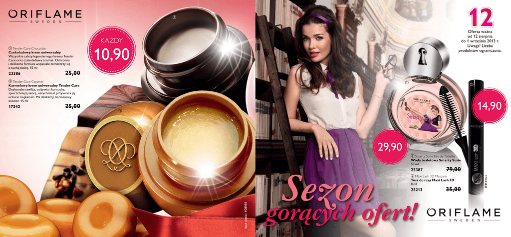 12 Oferta ważna od 12 sierpnia do 1 września 2013 r. Uwaga! Liczba produktów ograniczona. KAŻDY a Tender Care Chocolate Czekoladowy krem uniwersalny Wszystkie zalety legendarnego kremu Tender Care oraz czekoladowy aromat. Ochronna i delikatna formuła wspaniale zatroszczy się o suchą skórę. 15 ml 25,00 Tender Care Caramel Karmelowy krem uniwersalny Tender Care Doskonale nawilża, odżywia i koi suchą, spierzchniętą skórę, natychmiast przywraca jej uczucie miękkości. Ma delikatny, karmelowy aromat. 15 ml 25,00 14,90 29,90 a Smarty Susie Eau de Toilette Woda toaletowa Smarty Susie 50 ml Sezon gorących ofert! 25387 79,00 Maxi Lash 3D Mascara Tusz do rzęs Maxi Lash 3D 8 ml 25213 kod ulotki: 108981 17342 35,00 25213 Black 23386 10,90 19,90 39,90 Exotic Flower Cooling Bag Torba chłodząca Exotic Flower Torba chłodząca zaprojektowana przez Valerie, wykonana w 100% z poliestru, wykończona plastikiem. Rozmiar: 20,5 x 12 x 10 cm Exotic Flower Pareo Pareo Exotic Flower 180 x 80 cm 26726 50,00 70,00 34,90 26712 17,90 29,90 59,90 Exotic Flower Flip Flops size 38/39 Japonki Exotic Flower rozmiar 38/39 27322 45,00 Exotic Flower Flip Flops size 40/41 Japonki Exotic Flower rozmiar 40/41 17,90 27323 45,00 a Oasis Fresh Dawn Pareo Pareo Oasis Fresh Dawn Wymiary: 180 x 80 cm. 26806 Oasis Fresh Dawn Sunglasses Okulary przeciwsłoneczne Oasis Fresh Dawn Wymiary: 14 x 13,5 x 6 cm. 26807 2 70,00 45,00 Breezy Casual Bag Torba Breezy Jedyna torba, którą wprost musisz mieć w tym sezonie. Sportowa, w stylowym granatowym kolorze, z minimalistycznym zdobieniem i regulowanym paskiem na ramię. Wymiary: 35 x 25 x 12 cm. Chic Gold Chain Bag Torba Chic Wyrafinowana, czarna torba na ramię ze złotym łańcuszkiem. Wymiary: 33 x 26,5 x 13 cm. 26691 26715 100,00 120,00 Exotic Flower Beach Mat Mata plażowa Exotic Flower Zaprojektowana przez Valerie składana mata plażowa wyposażona w poręczny uchwyt. Rozmiar: 180 x 120 cm Exotic Flower Bag Torba Exotic Flower Torba plażowa z ekskluzywnym kwiatowym motywem zaprojektowanym przez Valerie, 100% poliester. Rozmiar: 40 x 35 x 15 cm 26714 26724 70,00 100,00 19,90 39,90 3 a Summer Daisy Sunglasses Okulary przeciwsłoneczne Summer Daisy Okulary przeciwsłoneczne w stokrotki. Zatwierdzone przez CE. 100% Ochrony UV. Rekomendowane dla dzieci w wieku: 4-6 lat. Wymiary: 13 x 12,5 x 4 cm. 9,90 30,00 26700 Summer Daisy Sun Hat Kapelusz Summer Daisy Leni kapelusz wykonany w 100% z poliestru. Rekomendowany dla dzieci w wieku 4-6 lat. Obwód: 51 cm. 30,00 26701 Summer Daisy Bikini Bikini Summer Daisy Bikini z nadrukowanymi stokrotkami, wykonane z poliestru. Można prać w pralce. Rekomendowane dla dzieci w wieku: 4-6 lat. 9,90 60,00 26702 8,90 19,90 Baby Sun Hat Kapelusik przeciwsłoneczny dla dzieci Kapelusik wykonany w 100% z poliestru zdobionego motywem żyjątek morskich. Przeznaczony dla dzieci w wieku 12-24 miesięcy. Średnica: 49,5 cm 26709 4 24376 34,00 26720 23599 100,00 120,00 KAŻDA 39,90 30,00 12,90 Blue Lagoon Tote Torba Blue Lagoon Wymiary: 59 x 34 cm. Sun Zone Sunglasses - Kids Okulary przeciwsłoneczne Sun zone - dla dzieci Riviera Ocean Bag Torba Riviera Ocean Wygodna torba na ramię w szykownym, granatowym odcieniu. Wymiary: 24 x 12,5 x 28 cm Paradise Bag Torba Paradise Wymiary: 40,5 x 11,5 x 33,5 cm. 24787 130,00 Giordani Gold Handbag Torba Giordani Gold Wymiary: 40 x 35 x 13 cm. 12549 99,00 5 12,90 14,90 Optimals Oxygen Boost™ Eye Stick Sztyft pod oczy Optimals Oxygen Boost™ 6,5 g 40,00 23773 Optimals Foaming Cleanser Pieniąca się emulsja oczyszczająca Optimals 200 ml 30,00 14698 Silver Gel Mask Maska żelowa Silver Wymiary: 22 x 14 cm. 23794 Aqua-Rhythm Intense Hydration Youth Preserve Light Day Cream SPF 15 Intensywnie nawilżający lekki krem na dzień Aqua-Rhythm SPF 15 50 ml Optifresh Multi-action Fluoride Toothgel Extra Fresh Odświeżający żel do zębów Optifresh Multi-action 75 ml Swedish Spa Body Massager Przyrząd do masażu ciała Swedish Spa Wymiary: długość 35 cm. 23778 7,90 14,00 21877 24,90 Oriflame Nail Butter Advanced Condition Reviver Wzmacniający balsam do paznokci Oriflame Nail Butter Advanced Ekskluzywna formuła z kojącym rumiankiem, odżywczym awokado, masłem shea i prowitaminą B5 zmiękcza skórki i wzmacnia paznokcie. 1,6 g 8,90 59,00 23743 29,90 Nourishing Hand Cream for Dry Hands Odżywczy krem do wysuszonych dłoni Głęboko odżywia suchą skórę rąk. Olejek ze słodkich migdałów wygładza ją i zmiękcza. 100 ml 7,90 14,90 5,90 5,90 17,90 19,90 32,90 6 Wartość zestawu: 38,00 Kod zestawu: 621247 Amazonia Calming Face Wash Kojący żel do mycia twarzy Amazonia Łagodzący żel z dodatkiem wyciągu z kwiatów passiflory pomaga usuwać całodzienne zanieczyszczenia, jednocześnie odświeżając skórę i przynosząc jej upragniony relaks. 150 ml 24131 17,00 Amazonia Calming Face Mist Kojąca mgiełka do twarzy Amazonia Nawilżająca mgiełka zawiera kojący i antyoksydacyjny wyciąg z kwiatu passiflory. Zabieraj ją wszędzie ze sobą i ciesz się jej dobroczynnym działaniem! 150 ml 24133 20,00 HairX Blow-Drying Brush Szczotka modelująca HairX Blow-Drying Wymiary: 4,4 x 22,5 cm. 20651 HairX Detangling Comb Grzebień HairX Długość: 22 cm, szerokość: 4 cm. 16000 20,00 17,00 7 a Silver Rose Clutch Kopertówka Silver Rose Elegancka kopertówka z dwoma komorami zapinanymi na suwak i odpinanym paskiem. Wymiary: 18 x 12,5 x 0,5 cm. 19,90 45,00 24505 60,00 24354 14,90 29,90 3,90 Sparkling Drop Pearl Bracelet Bransoletka Sparkling Drop Nie zawiera niklu. Wymiary: długość 19 cm + 3 cm rozszerzenie łańcuszka. Ladylike Red Purse Portfel Ladylike Wymiary: 19,8 x 10,5 x 2 cm. 70,00 23920 Spring Box Narcissus Pudełko na prezent Narcissus Wymiary: 20,5 x 20,5 x 8 cm. 621246 17,90 3,90 Forever Pouch Portmonetka Forever Wymiary: 8,5 x 15 x 1,5 cm. 19,90 Sienna Belt Pasek Sienna Wymiary: długość 95 cm + 63 cm + 42 cm. 23573 8 2633345,00 8,90 Spring Box Tulip Pudełko na prezent Tulip Wymiary: 20,5 
