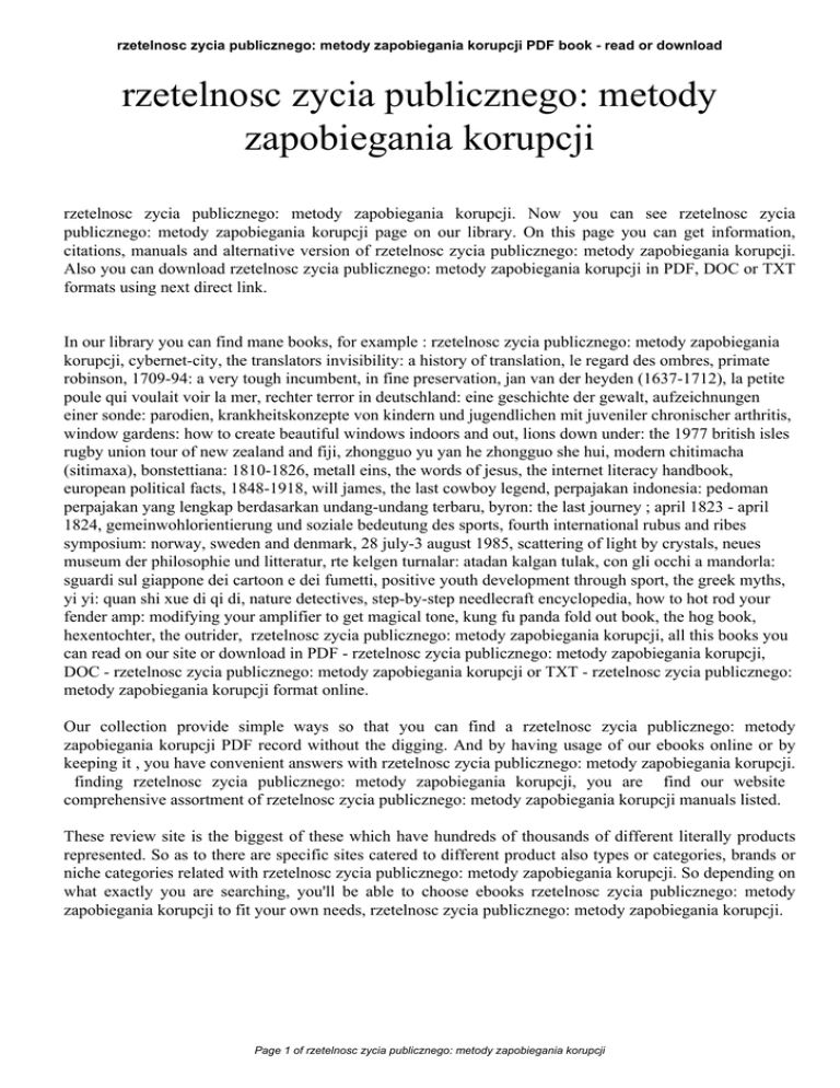 rzetelnosc zycia publicznego: metody zapobiegania korupcji PDF book - read or download rzetelnosc zycia publicznego: metody zapobiegania korupcji rzetelnosc zycia publicznego: metody zapobiegania korupcji. Now you can see rzetelnosc zycia publicznego: metody zapobiegania korupcji page on our library. On this page you can get information, citations, manuals and alternative version of rzetelnosc zycia publicznego: metody zapobiegania korupcji. Also you can download rzetelnosc zycia publicznego: metody zapobiegania korupcji in PDF, DOC or TXT formats using next direct link. In our library you can find mane books, for example : rzetelnosc zycia publicznego: metody zapobiegania korupcji, cybernet-city, the translators invisibility: a history of translation, le regard des ombres, primate robinson, 1709-94: a very tough incumbent, in fine preservation, jan van der heyden (1637-1712), la petite poule qui voulait voir la mer, rechter terror in deutschland: eine geschichte der gewalt, aufzeichnungen einer sonde: parodien, krankheitskonzepte von kindern und jugendlichen mit juveniler chronischer arthritis, window gardens: how to create beautiful windows indoors and out, lions down under: the 1977 british isles rugby union tour of new zealand and fiji, zhongguo yu yan he zhongguo she hui, modern chitimacha (sitimaxa), bonstettiana: 1810-1826, metall eins, the words of jesus, the internet literacy handbook, european political facts, 1848-1918, will james, the last cowboy legend, perpajakan indonesia: pedoman perpajakan yang lengkap berdasarkan undang-undang terbaru, byron: the last journey ; april 1823 - april 1824, gemeinwohlorientierung und soziale bedeutung des sports, fourth international rubus and ribes symposium: norway, sweden and denmark, 28 july-3 august 1985, scattering of light by crystals, neues museum der philosophie und litteratur, rte kelgen turnalar: atadan kalgan tulak, con gli occhi a mandorla: sguardi sul giappone dei cartoon e dei fumetti, positive youth development through sport, the greek myths, yi yi: quan shi xue di qi di, nature detectives, step-by-step needlecraft encyclopedia, how to hot rod your fender amp: modifying your amplifier to get magical tone, kung fu panda fold out book, the hog book, hexentochter, the outrider, rzetelnosc zycia publicznego: metody zapobiegania korupcji, all this books you can read on our site or download in PDF - rzetelnosc zycia publicznego: metody zapobiegania korupcji, DOC - rzetelnosc zycia publicznego: metody zapobiegania korupcji or TXT - rzetelnosc zycia publicznego: metody zapobiegania korupcji format online. Our collection provide simple ways so that you can find a rzetelnosc zycia publicznego: metody zapobiegania korupcji PDF record without the digging. And by having usage of our ebooks online or by keeping it , you have convenient answers with rzetelnosc zycia publicznego: metody zapobiegania korupcji. finding rzetelnosc zycia publicznego: metody zapobiegania korupcji, you are find our website comprehensive assortment of rzetelnosc zycia publicznego: metody zapobiegania korupcji manuals listed. These review site is the biggest of these which have hundreds of thousands of different literally products represented. So as to there are specific sites catered to different product also types or categories, brands or niche categories related with rzetelnosc zycia publicznego: metody zapobiegania korupcji. So depending on what exactly you are searching, you'll be able to choose ebooks rzetelnosc zycia publicznego: metody zapobiegania korupcji to fit your own needs, rzetelnosc zycia publicznego: metody zapobiegania korupcji. Page 1 of rzetelnosc zycia publicznego: metody zapobiegania korupcji