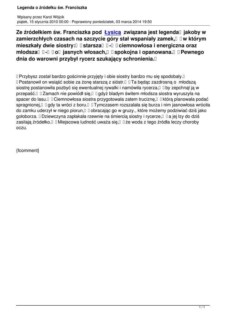 Ze źródełkiem św. Franciszka pod Łysicą związana jest legenda jakoby w