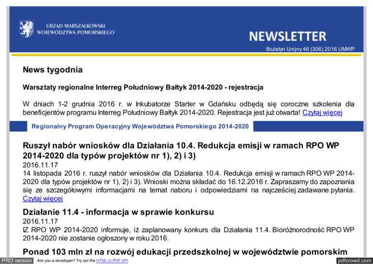 Biuletyn Unijny 46 (306) 2016 UMWP News tygodnia Warsztaty regionalne Interreg Południowy Bałtyk 2014-2020 - rejestracja W dniach 1-2 grudnia 2016 r. w Inkubatorze Starter w Gdańsku odbędą się coroczne szkolenia dla beneficjentów programu Interreg Południowy Bałtyk 2014-2020. Rejestracja jest już otwarta! Czytaj więcej Regionalny Program Operacyjny Województwa Pomorskiego 2014-2020 Ruszył nabór wniosków dla Działania 10.4. Redukcja emisji w ramach RPO WP 2014-2020 dla typów projektów nr 1), 2) i 3) 2016.11.17 14 listopada 2016 r. ruszył nabór wniosków dla Działania 10.4. Redukcja emisji w ramach RPO WP 20142020 dla typów projektów nr 1), 2) i 3). Wnioski można składać do 16.12.2016 r. Zapraszamy do zapoznania się ze szczegółowymi informacjami na temat naboru i odpowiedziami na najcześciej zadawane pytania. Czytaj więcej Działanie 11.4 - informacja w sprawie konkursu 2016.11.17 IZ RPO WP 2014-2020 informuje, iż zaplanowany konkurs dla Działania 11.4. Bioróżnorodność RPO WP 2014-2020 nie zostanie ogłoszony w roku 2016. Ponad 103 mln zł na rozwój edukacji przedszkolnej w województwie pomorskim PRO version Are you a developer? Try out the HTML to PDF API pdfcrowd.com 2016.11.17 10 listopada br. Zarząd Województwa Pomorskiego zatwierdził wyniki oceny merytorycznej projektów dla Działania 3.1. Edukacja przedszkolna. Do dofinansowania wybrane zostały 72 projekty. Czytaj więcej Rozstrzygniecie konkursu z Działania 5.3 Opieka na dziećmi do lat 3 2016.11.17 Zarząd Województwa Pomorskiego zatwierdził wyniki oceny merytorycznej dla Działania 5.3.Opieka nad dziećmi do lat 3 w ramach którego 16 projektów o łącznej wartości 37 619 174,96 zł otrzymało dofinansowanie. Czytaj więcej Odważ się sięgnąć po fundusze europejskie. Przyjdź na spotkania informacyjne. 2016.11.16 Spotkania informacyjne: „Konkursy w 2017 roku w ramach Regionalnego Programu Operacyjnego Województwa Pomorskiego na lata 2014-2020" odbędą się w Kwidzynie, Słupsku, Chojnicach, Tczewie i Gdańsku. Kierujemy je do instytucji, które mogą ubiegać się o dofinansowanie oraz do wszystkich zainteresowanych korzyściami płynącymi z funduszy europejskich. Czytaj więcęj Nabór wniosków o dofinansowanie projektów w ramach Poddziałania 2.4.1. Specjalistyczne usługi doradcze RPO WP 2014-2020 2016.11.15 Instytucja Zarządzająca RPO WP 2014-2020 – Zarząd Województwa Pomorskiego ogłasza nabór wniosków o dofinansowanie projektów w ramach Poddziałania 2.4.1. Specjalistyczne usługi doradcze RPO WP 20142020 (RPPM.02.04.01-IZ.00-22-001/17). Czytaj więcej Nabór wniosków o dofinansowanie projektów w ramach Poddziałania 7.1.2. Zasoby ochrony zdrowia RPO WP 2014-2020 2016.11.15 Instytucja Zarządzająca RPO WP 2014-2020 – Zarząd Województwa Pomorskiego ogłasza nabór wniosków o dofinansowanie projektów w ramach Poddziałania 7.1.2. Zasoby ochrony zdrowia RPO WP 2014-2020 (RPPM.02.04.01-IZ.00-22-001/17). Czytaj więcej PRO version Are you a developer? Try out the HTML to PDF API pdfcrowd.com Szkolenia dla beneficjentów - Realizacja i rozliczanie projektu realizowanego w ramach Poddziałania 2.2.1 RPO WP, 1 i 6 grudnia br. 2016.11.14 Beneficjentów wybranych do dofinansowania w ramach konkursu w Poddziałaniu 2.2.1 zapraszamy na szkolenia organizowane w dniach 1 grudnia oraz 6 grudnia br. w siedzibie Agencji Rozwoju Pomorza. Czytaj więcej Główny Punkt Informacyjny Funduszy Europejskich Spotkanie informacyjne w Gdyni: „Fundusze Europejskie w perspektywie 20142020 dla organizacji pozarządowych” 2016.11.17 Lokalny Punkt Informacyjny Funduszy Europejskich w Gdańsku zaprasza na spotkania informacyjne organizowane 29 listopada 2016 r., poświęcone zagadnieniom wsparcia organizacji pozarządowych z Funduszy Europejskich na lata 2014-2020. Czytaj więcej Spotkanie informacyjne w Kwidzynie: „Wsparcie na odnawialne źródła energii w ramach Funduszy Europejskich na lata 2014-2020” 2016.11.17 Lokalny Punkt Informacyjny Funduszy Europejskich w Malborku zaprasza na spotkania informacyjne organizowane 22 listopada 2016 r., poświęcone zagadnieniom związanym z możliwościami finansowania inwestycji dotyczących odnawialnych źródeł energii i efektywności energetycznej z Funduszy Europejskich na lata 2014-2020. Czytaj więcej Szkolenie w Słupsku: „Jak skutecznie ubiegać się o wsparcie z Funduszy Europejskich? - warsztaty tworzenia biznesplanu” 2016.11.17 Lokalny Punkt Informacyjny Funduszy Europejskich w Słupsku zaprasza na szkolenie organizowane 24 listopada 2016 r., poświęcone zasadom ubiegania się o wsparcie z Funduszy Europejskich w perspektywie PRO version Are you a developer? Try out the HTML to PDF API pdfcrowd.com 2014-2020 dla osób chcących założyć działalności gospodarczą oraz zasadom tworzenia biznesplanu. Szkolenie dedykowane jest dla osób w każdej grupie wiekowej, zarówno przed jak i po 30 roku życia. Czytaj więcej Spotkanie informacyjne w Ustce: „Wsparcie przedsiębiorców w perspektywie finansowej 2014-2020” 2016.11.17 Lokalny Punkt Informacyjny Funduszy Europejskich w Słupsku zaprasza na spotkanie informacyjne organizowane 23 listopada 2016 r., poświęcone możliwościom pozyskania przez przedsiębiorców wsparcia ze środków pochodzących z Unii Europejskiej w perspektywie finansowej na lata 2014-2020. Czytaj więcej Mobilne Punkty Informacyjne na Pomorzu - listopad 2016 2016.11.17 Serdecznie zapraszamy do skorzystania z działań Mobilnych Punktów Informacyjnych na Pomorzu. Czytaj więcej Dzień Informacyjny i konferencja nt. inwestycji w transporcie 2016.11.17 Dyrekcja Generalna ds. Mobilności i Transportu Komisji Europejskiej, we współpracy z polskim Ministerstwem Rozwoju, zaprasza na Dzień Informacyjny i Konferencję nt. inwestycji w transporcie. We wtorek 22 listopada w Warszawie będzie można omówić perspektywy potencjalnych projektów z przedstawicielami KE, Ministerstwa oraz Europejski